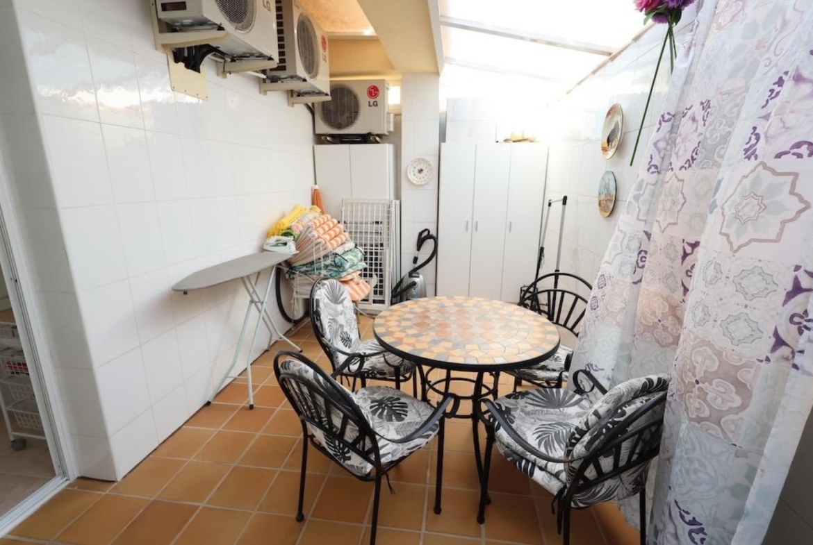Agua Marina in Campoamor. Ground floor corner apartment facing south with sea views and facing the communal pool with a large 20 m2 terrace with direct access to the pool. The property has 70 m2 with 2 bedrooms and 1 bathroom, a large independent kitchen with access to the covered patio. The property is sold furnished and with air conditioning and a closed garage. It is close to all services and a few meters walk to the beach.