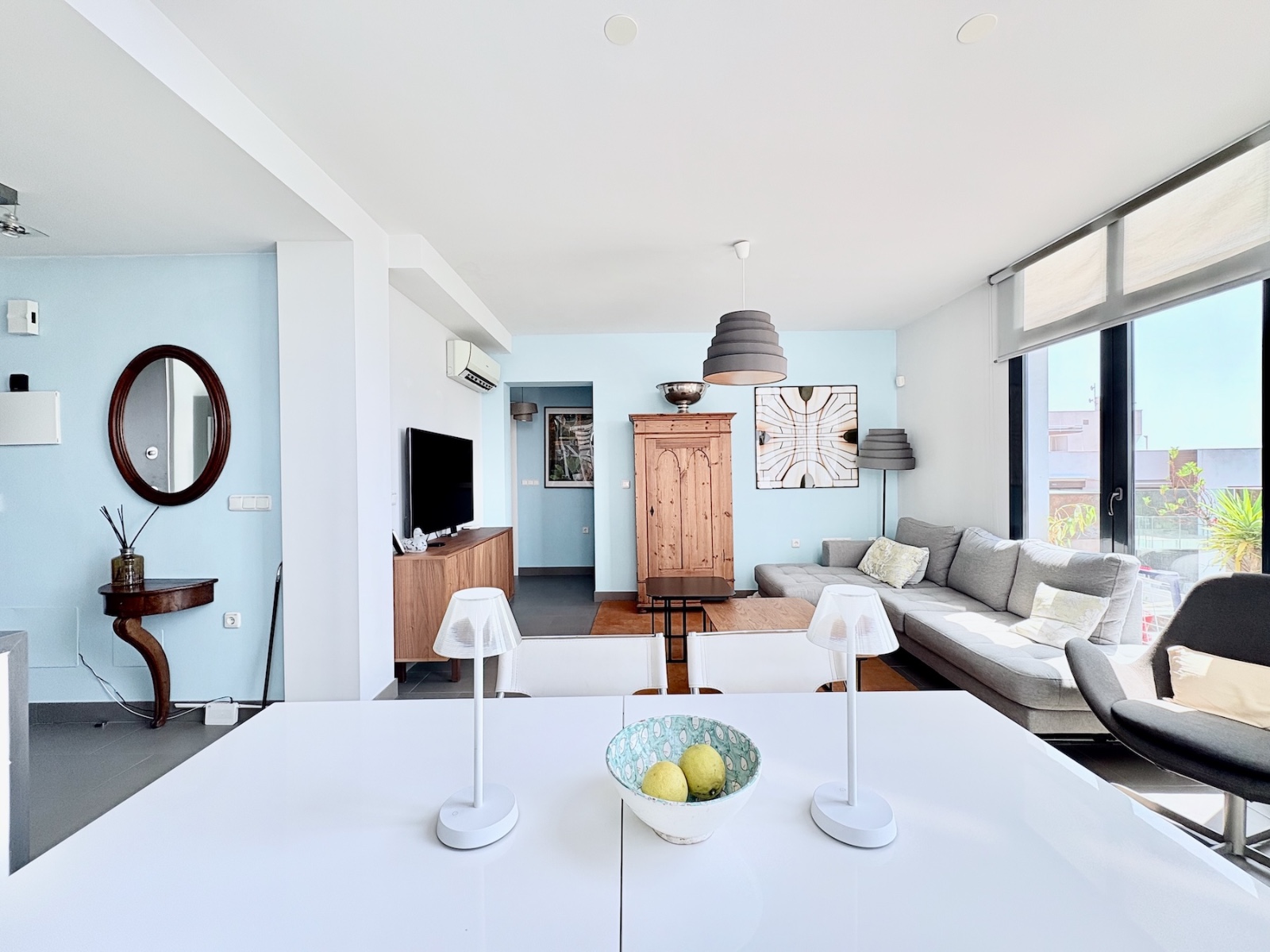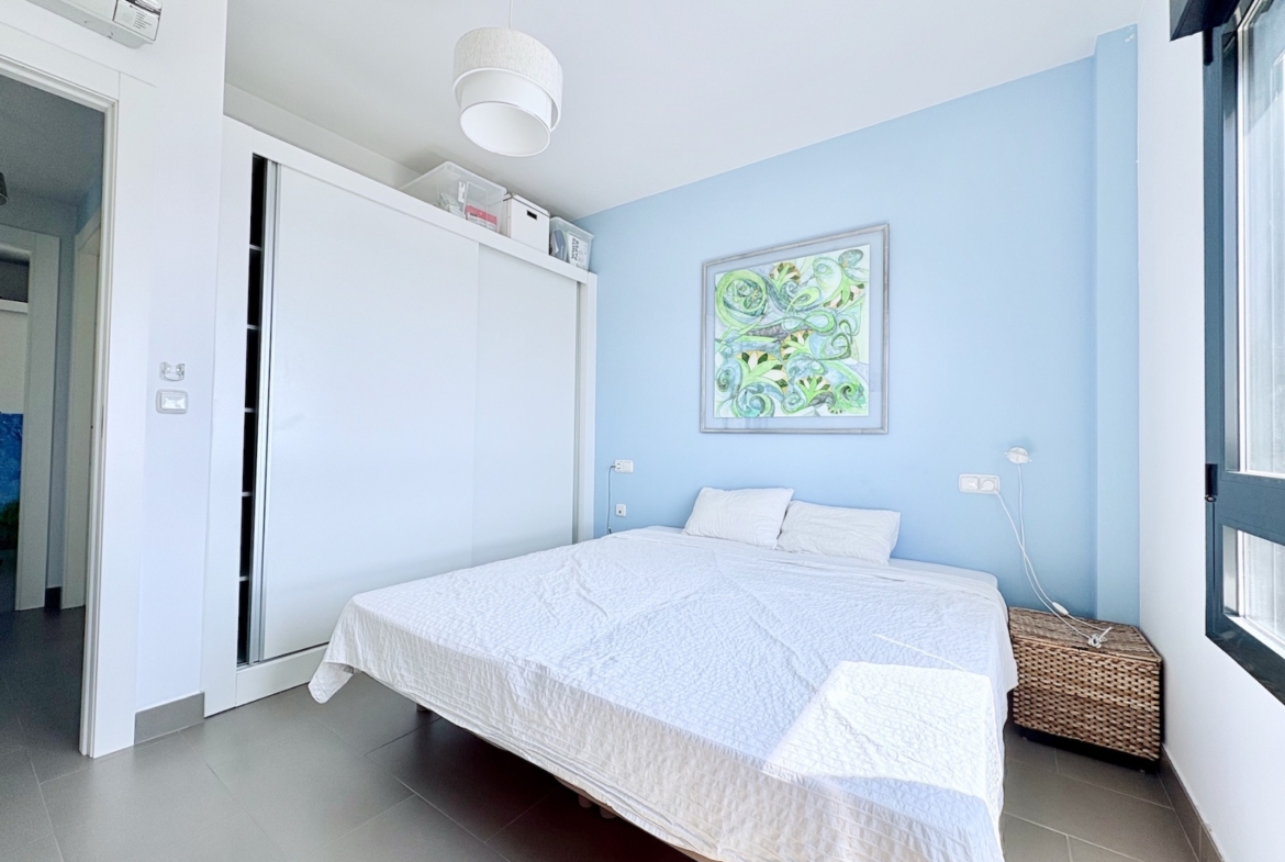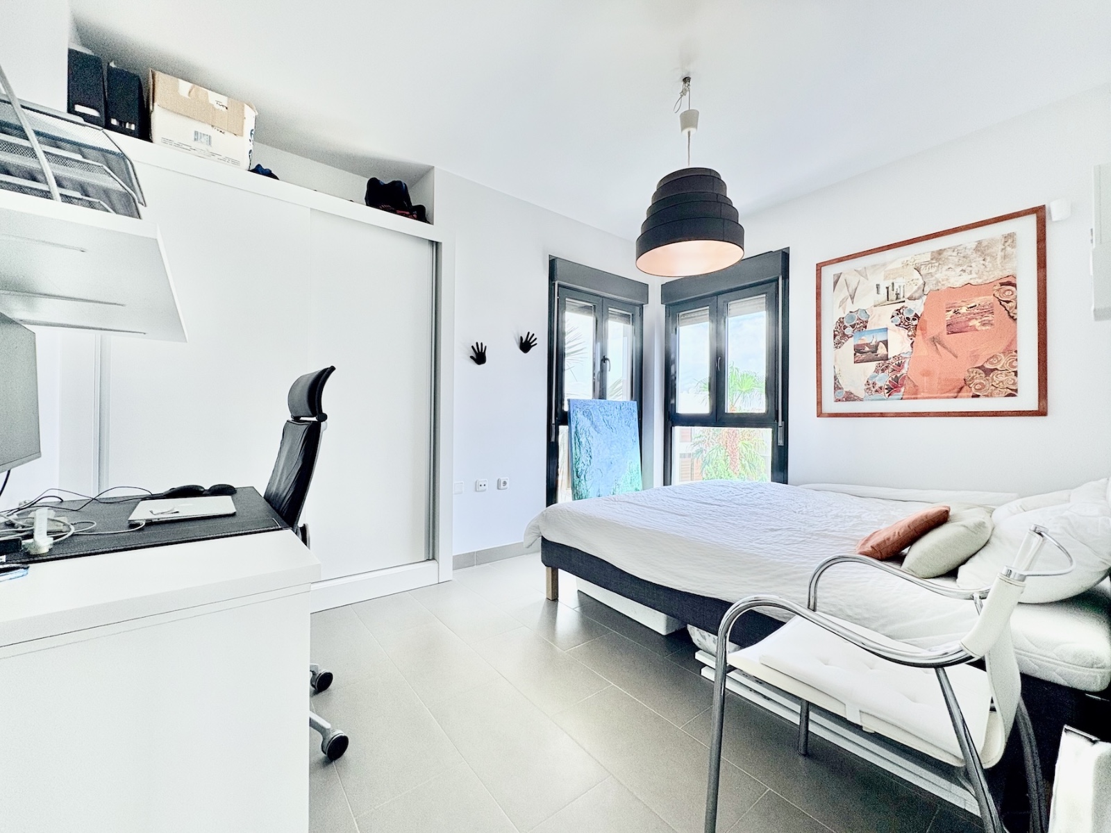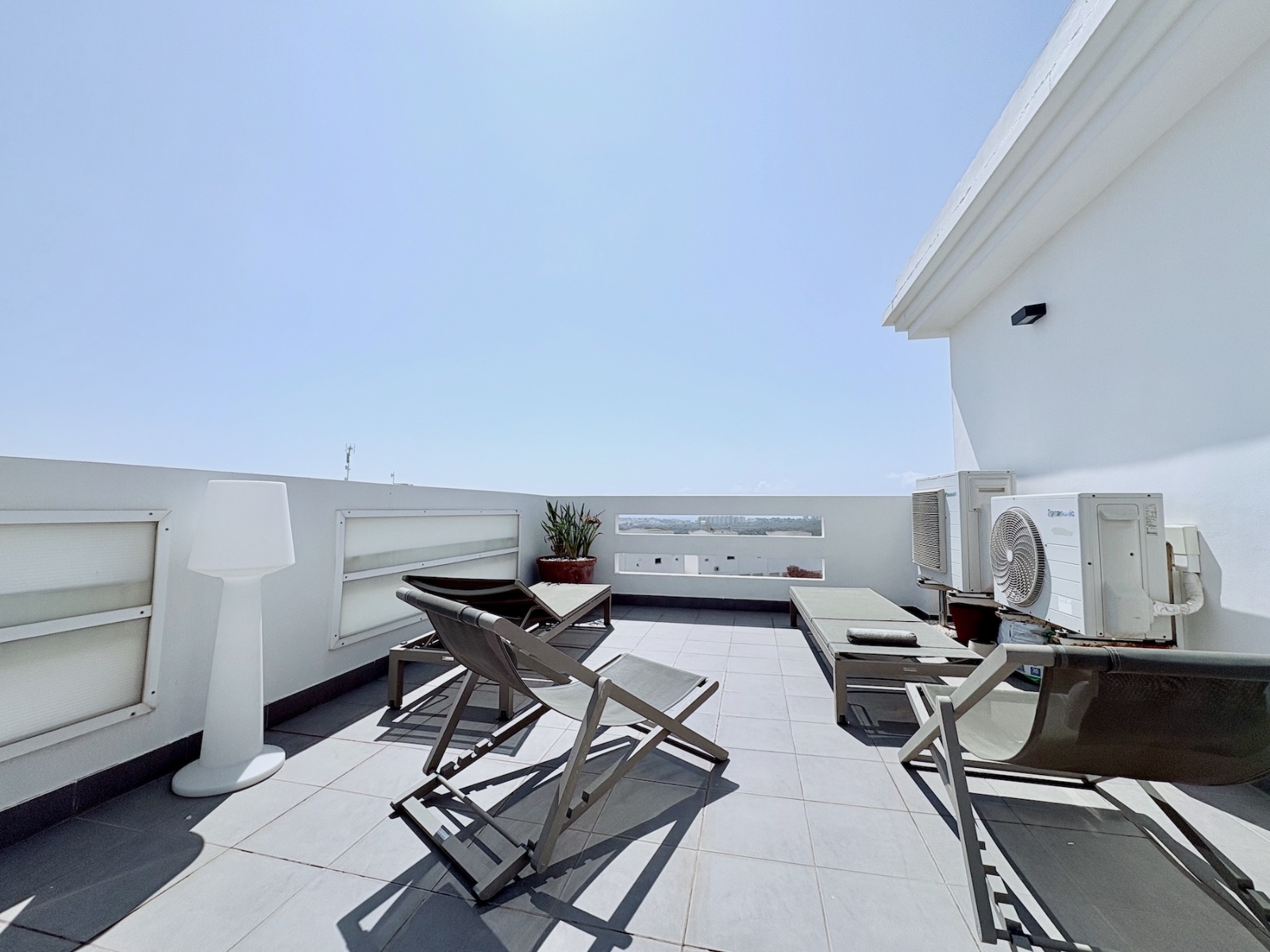 It comprises 3 bedrooms and 2 bathrooms, with a bright and open layout, ideal for comfortable living. On the ground floor you will find two bedrooms, a bathroom, a large open plan kitchen and a spacious living room with access to the front terrace, ideal for relaxing or entertaining. Upstairs there is a third bedroom with its own bathroom and a very large private terrace with beautiful sea views. The apartment is located in a quiet and green area, while being close to golf, shops and the beach. It is a great choice for vacation, rental, or for year-round living.