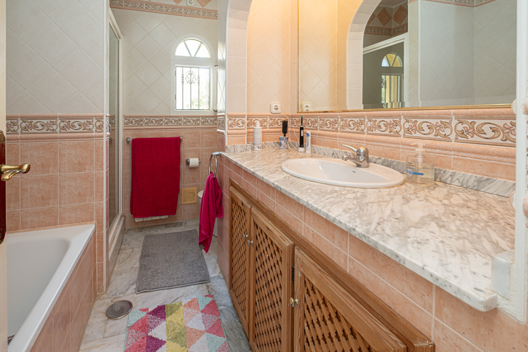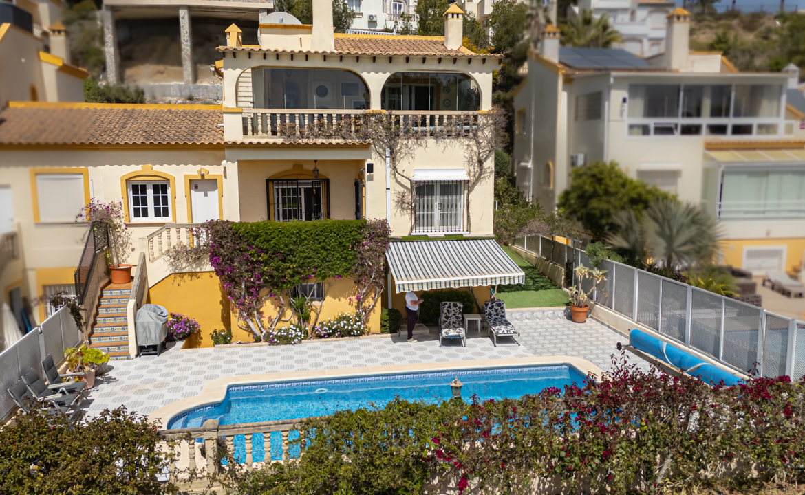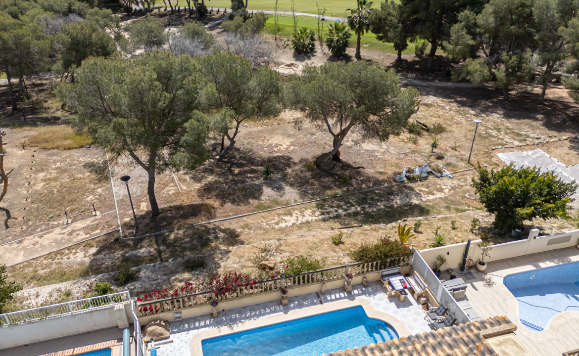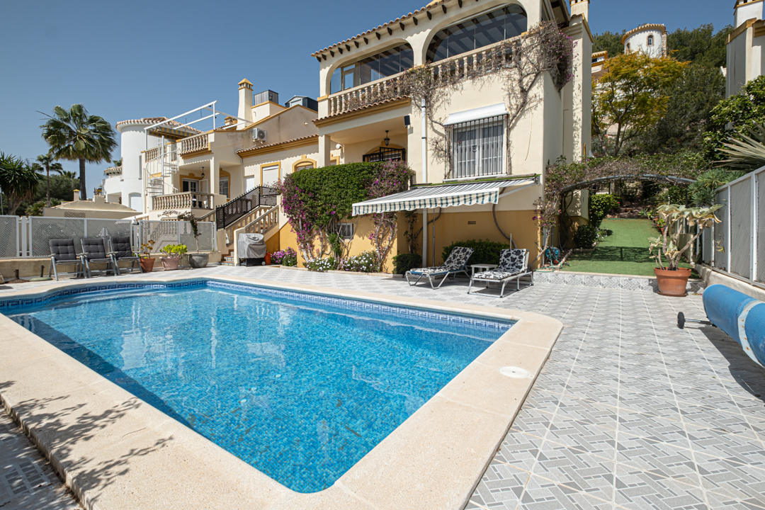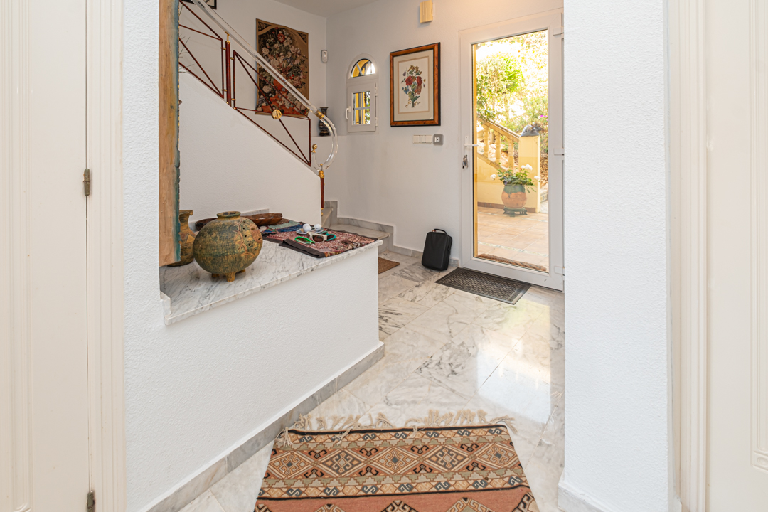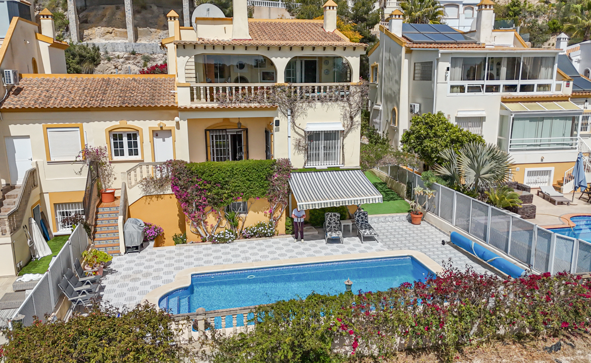 This large villa has great potential to be turned into the home of your dreams. With the sleeping area on the ground floor and the living area on the 1st floor. Easy maintenance gardens and a large pool. The upper terrace has been roofed and enclosed with glass curtain doors. South East facing.