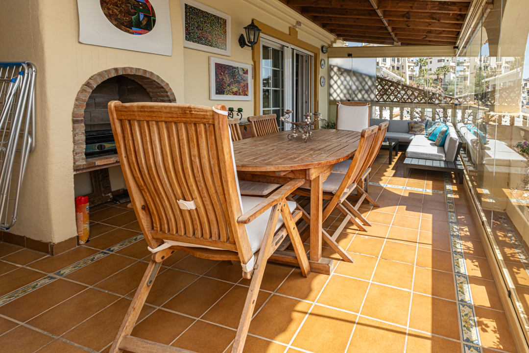 Large lounge/dinning room with one end opening onto a small terrace and the other opening onto the large enclosed terrace looking over the pine forest and to the sea. The lounge area has a gas fire and the room has a high volt ceiling.
