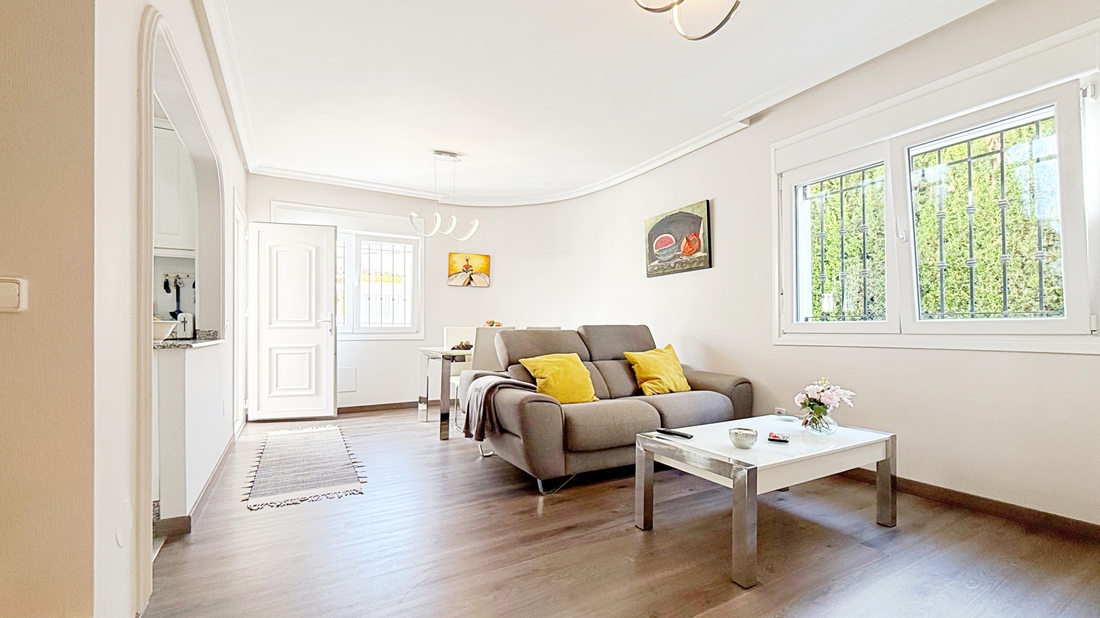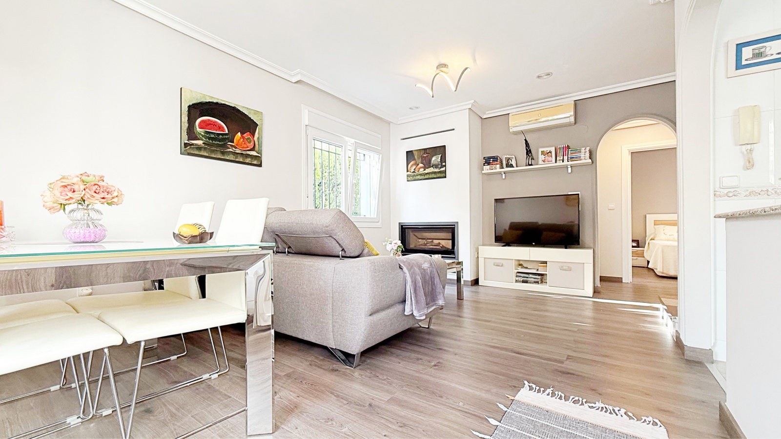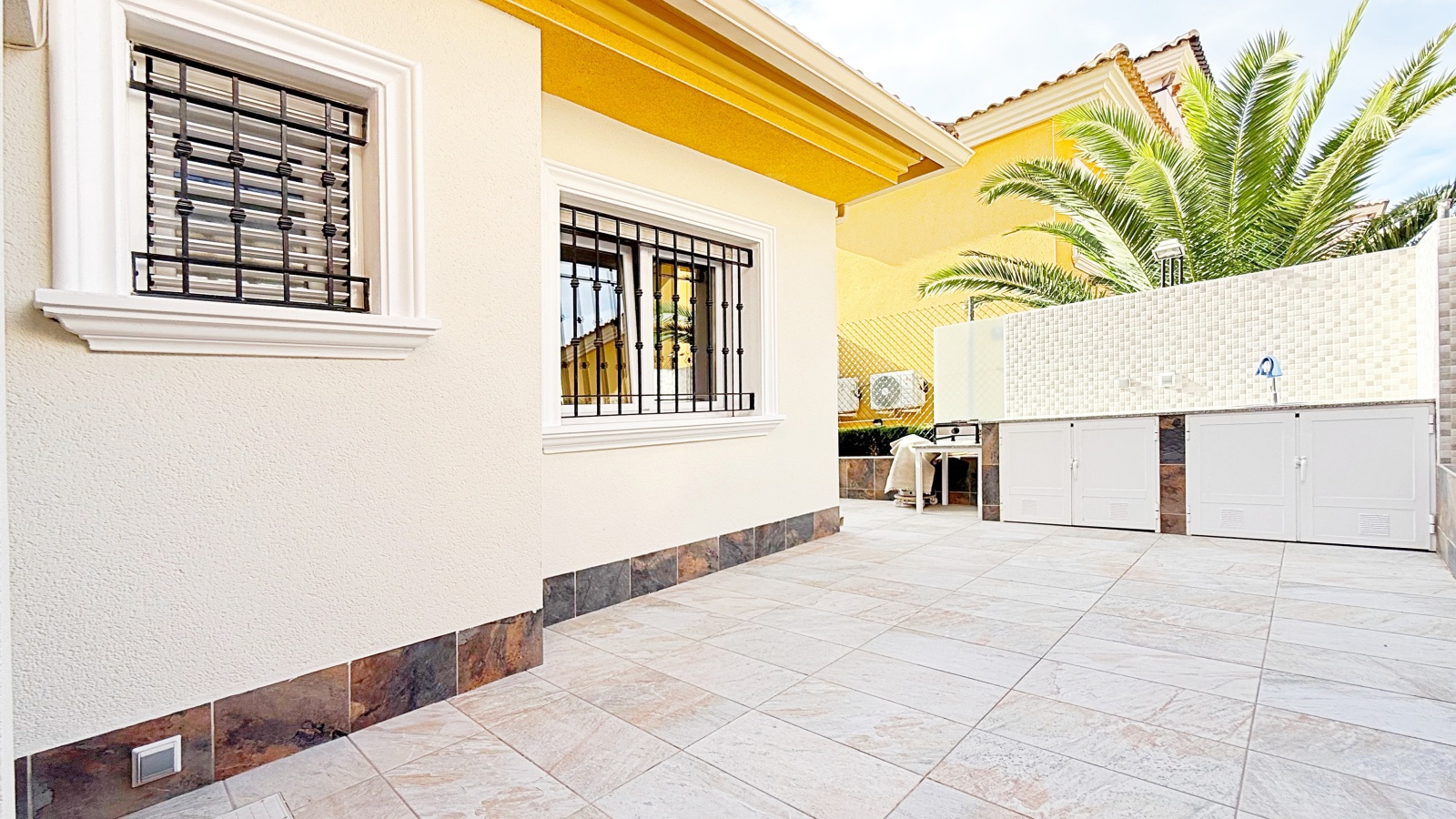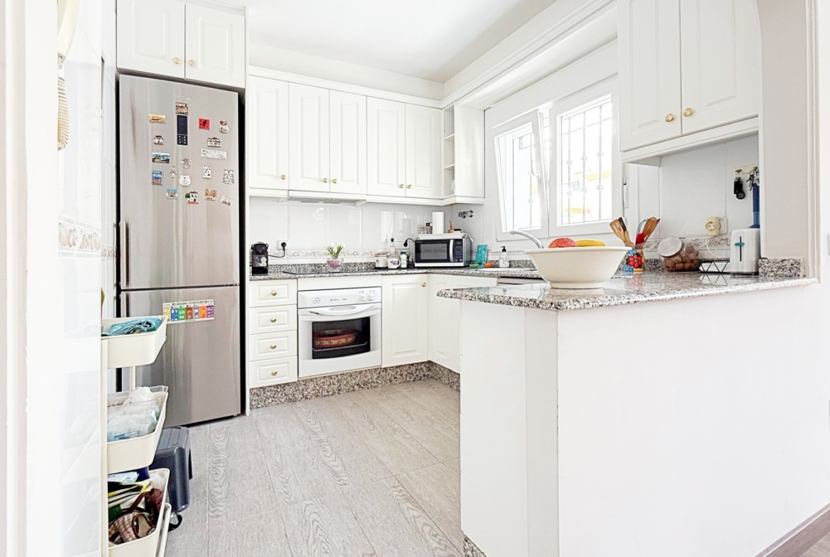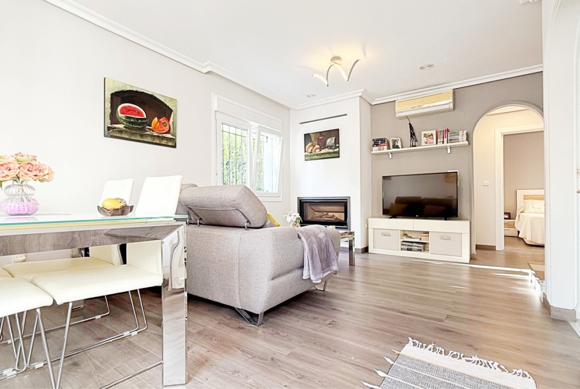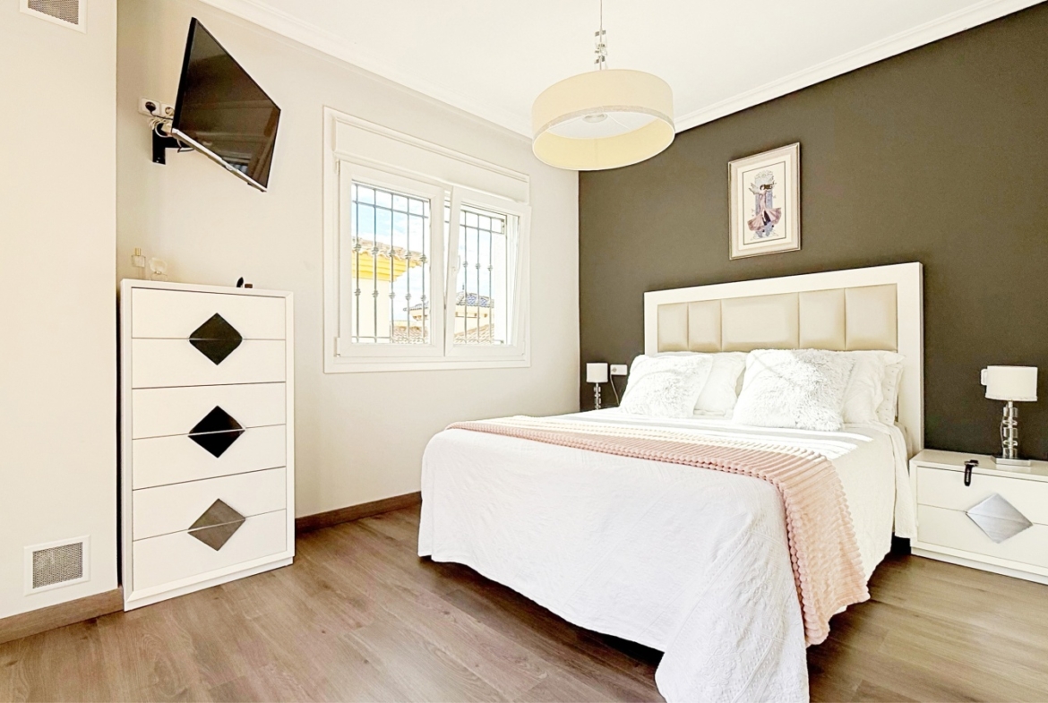 This magnificent detached villa situated in Los Altos has a build area of 105 m², is fully renovated and distributed over two floors. It is located in a private residential complex with a communal swimming pool, just a short distance from the beach. The ground floor offers a spacious and bright living-dining room with an open-plan kitchen, creating a modern and functional space, ideal for enjoying with family or friends. On this same level there are also two well-sized bedrooms and a fully renovated bathroom, making this floor practical and comfortable for everyday living. The upper floor is dedicated to the master bedroom, a large and bright space with an en-suite bathroom, providing privacy, independence and comfort. The interior has been renovated with high-quality materials: wooden flooring, Climalit double-glazed tilt-and-turn windows, ensuring excellent thermal and acoustic insulation while adding a modern and welcoming style throughout. Outside, the villa offers a private plot with parking area and storage room, providing extra convenience and space. The gated community features landscaped common areas and a communal pool, perfect for enjoying the Mediterranean climate. Its privileged location, very close to the beach and surrounded by all essential services, combines a quiet residential atmosphere with the comfort of having everything at hand. A villa ready to move into, ideal both as a permanent residence and as a holiday home