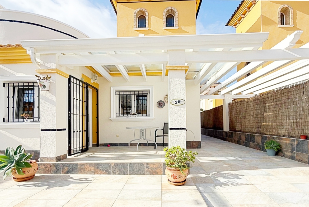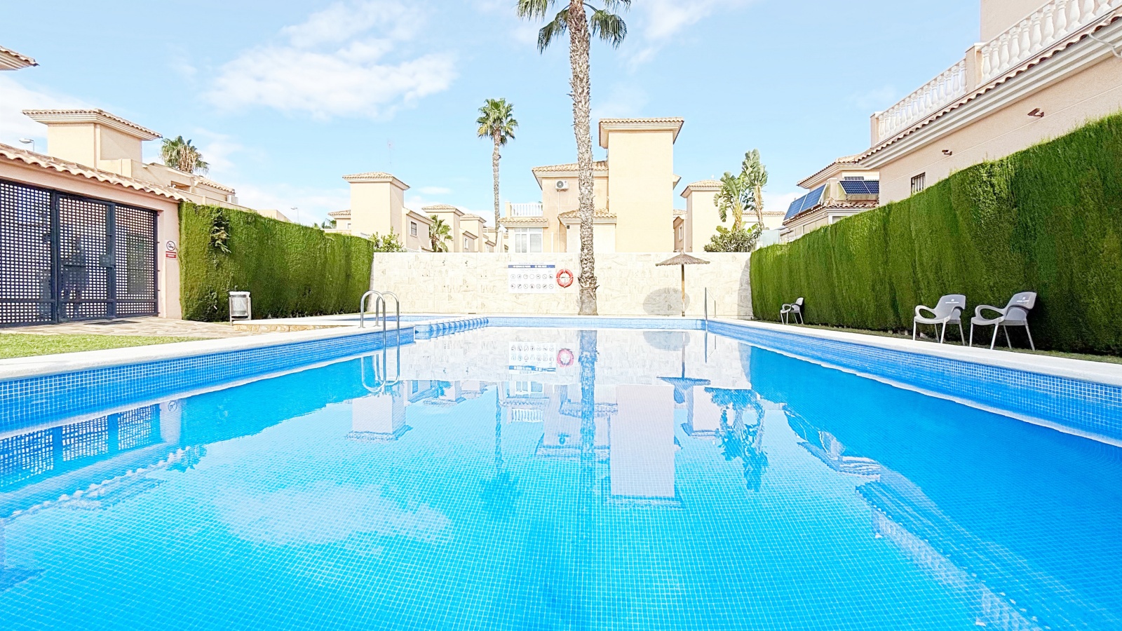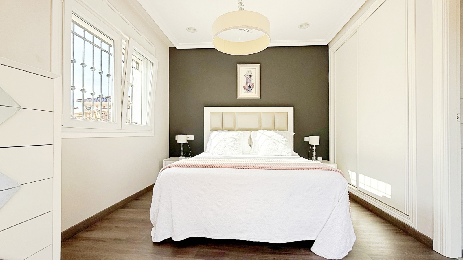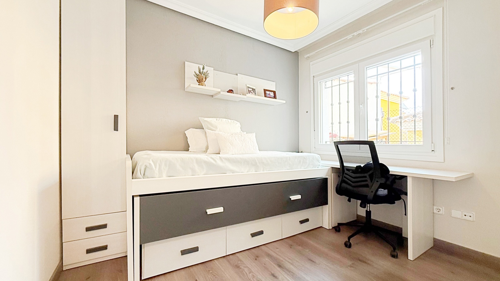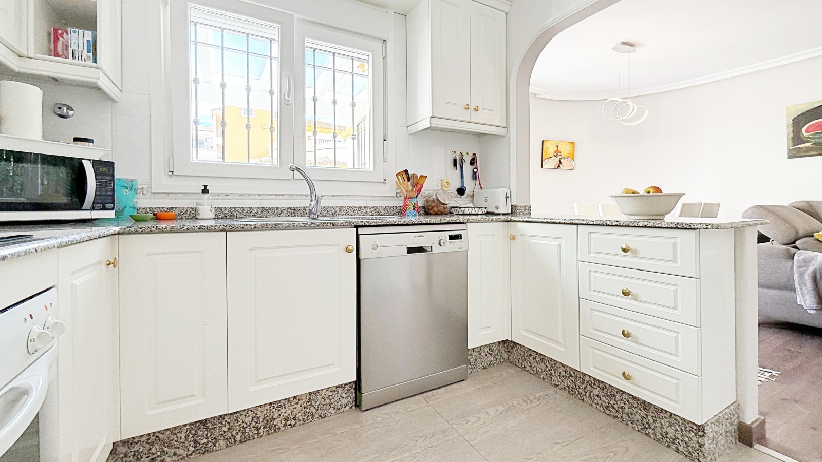 This magnificent detached villa situated in Los Altos has a build area of 105 m², is fully renovated and distributed over two floors. It is located in a private residential complex with a communal swimming pool, just a short distance from the beach. The ground floor offers a spacious and bright living-dining room with an open-plan kitchen, creating a modern and functional space, ideal for enjoying with family or friends. On this same level there are also two well-sized bedrooms and a fully renovated bathroom, making this floor practical and comfortable for everyday living. The upper floor is dedicated to the master bedroom, a large and bright space with an en-suite bathroom, providing privacy, independence and comfort. The interior has been renovated with high-quality materials: wooden flooring, Climalit double-glazed tilt-and-turn windows, ensuring excellent thermal and acoustic insulation while adding a modern and welcoming style throughout. Outside, the villa offers a private plot with parking area and storage room, providing extra convenience and space. The gated community features landscaped common areas and a communal pool, perfect for enjoying the Mediterranean climate. Its privileged location, very close to the beach and surrounded by all essential services, combines a quiet residential atmosphere with the comfort of having everything at hand. A villa ready to move into, ideal both as a permanent residence and as a holiday home