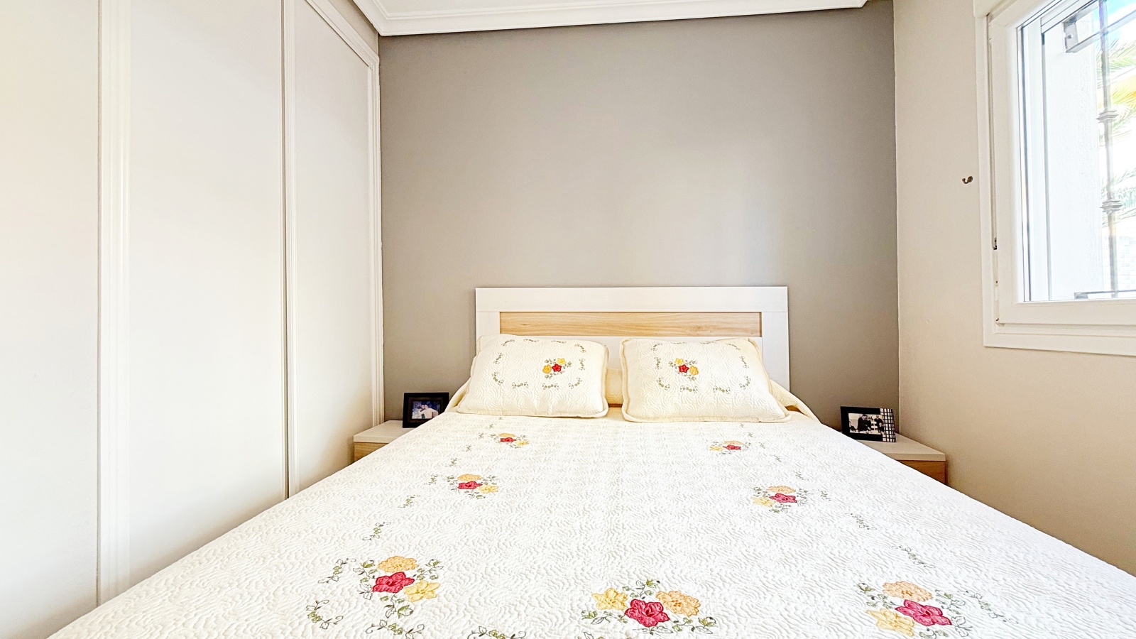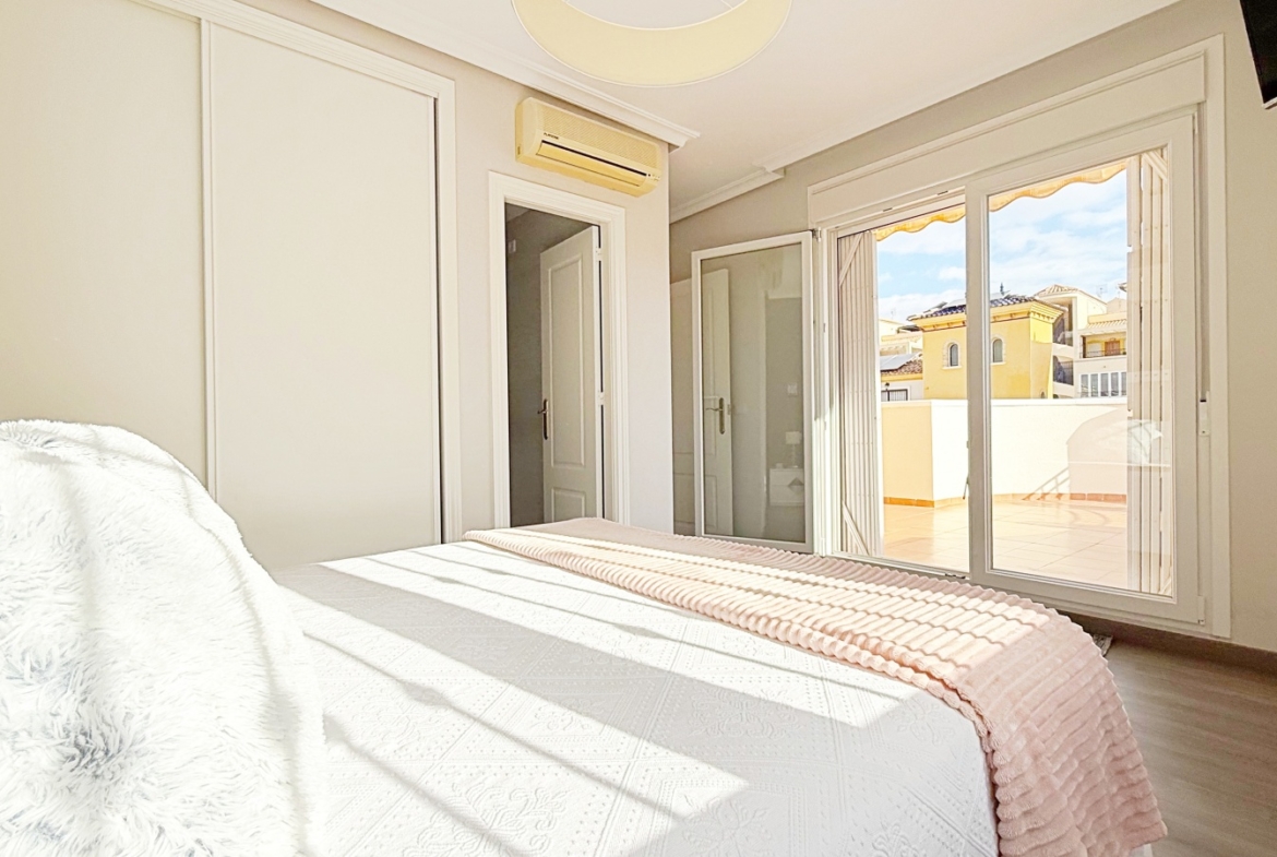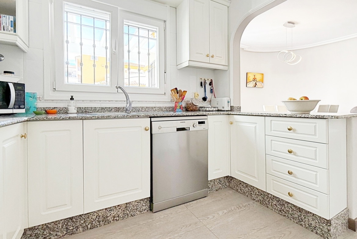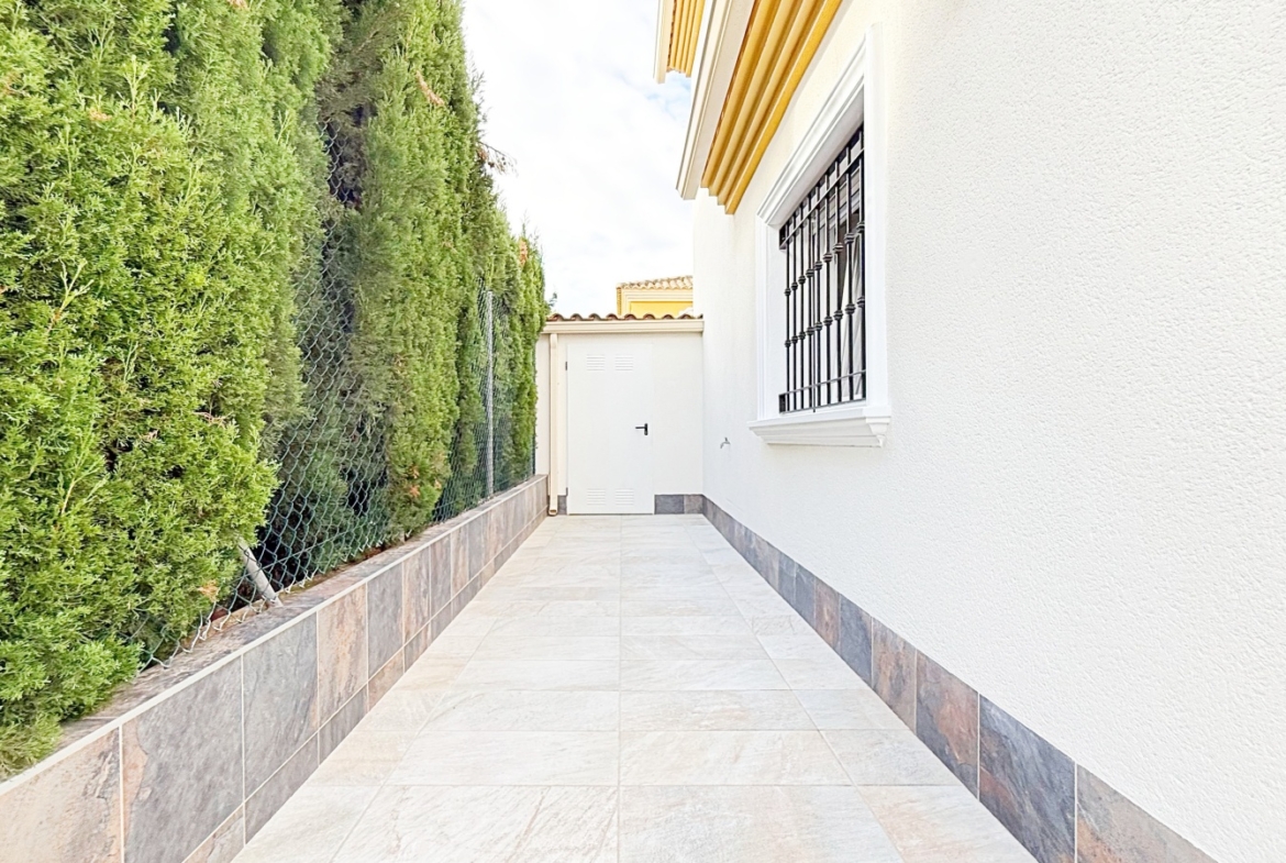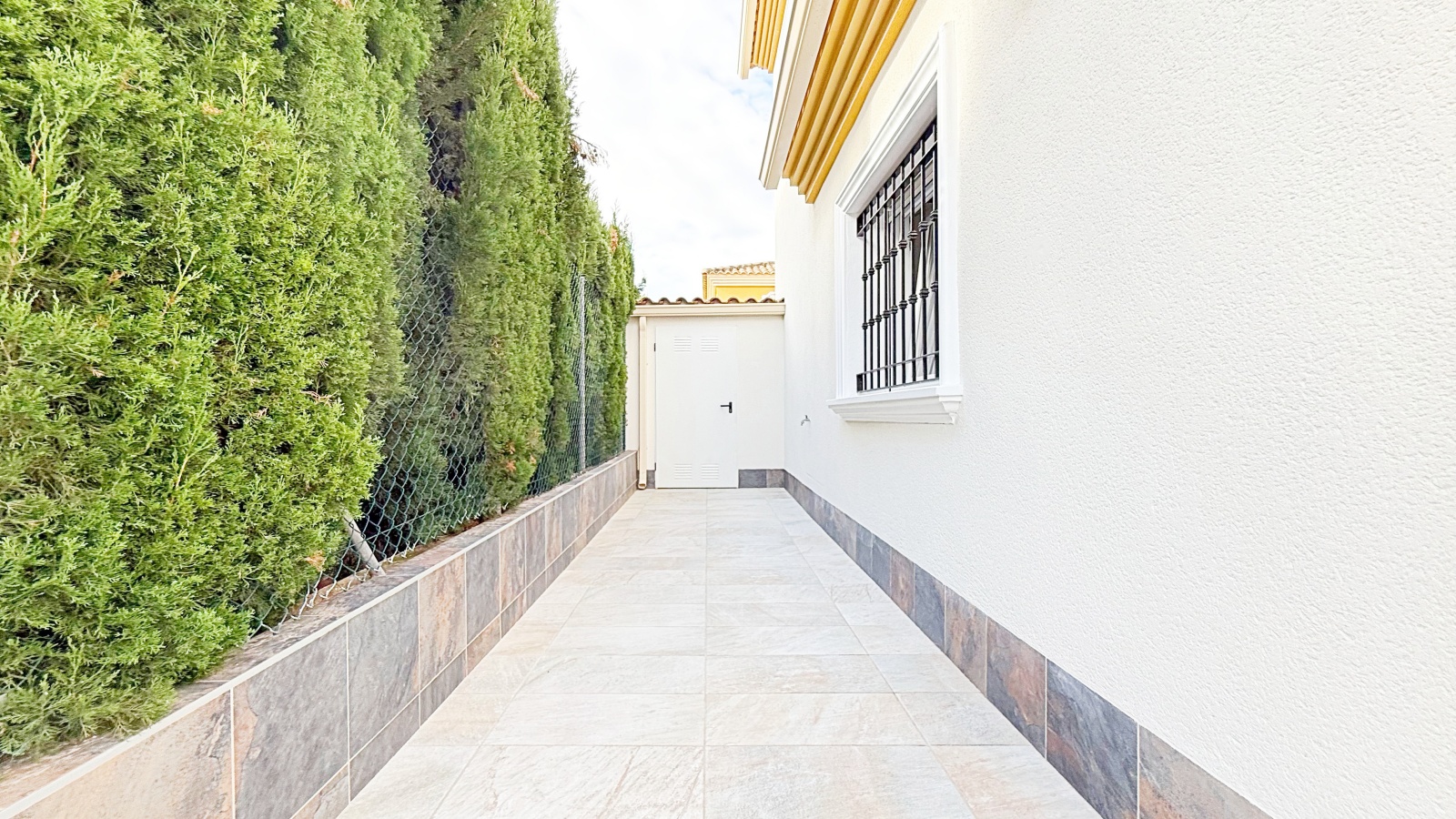 This magnificent detached villa situated in Los Altos has a build area of 105 m², is fully renovated and distributed over two floors. It is located in a private residential complex with a communal swimming pool, just a short distance from the beach. The ground floor offers a spacious and bright living-dining room with an open-plan kitchen, creating a modern and functional space, ideal for enjoying with family or friends. On this same level there are also two well-sized bedrooms and a fully renovated bathroom, making this floor practical and comfortable for everyday living. The upper floor is dedicated to the master bedroom, a large and bright space with an en-suite bathroom, providing privacy, independence and comfort. The interior has been renovated with high-quality materials: wooden flooring, Climalit double-glazed tilt-and-turn windows, ensuring excellent thermal and acoustic insulation while adding a modern and welcoming style throughout. Outside, the villa offers a private plot with parking area and storage room, providing extra convenience and space. The gated community features landscaped common areas and a communal pool, perfect for enjoying the Mediterranean climate. Its privileged location, very close to the beach and surrounded by all essential services, combines a quiet residential atmosphere with the comfort of having everything at hand. A villa ready to move into, ideal both as a permanent residence and as a holiday home