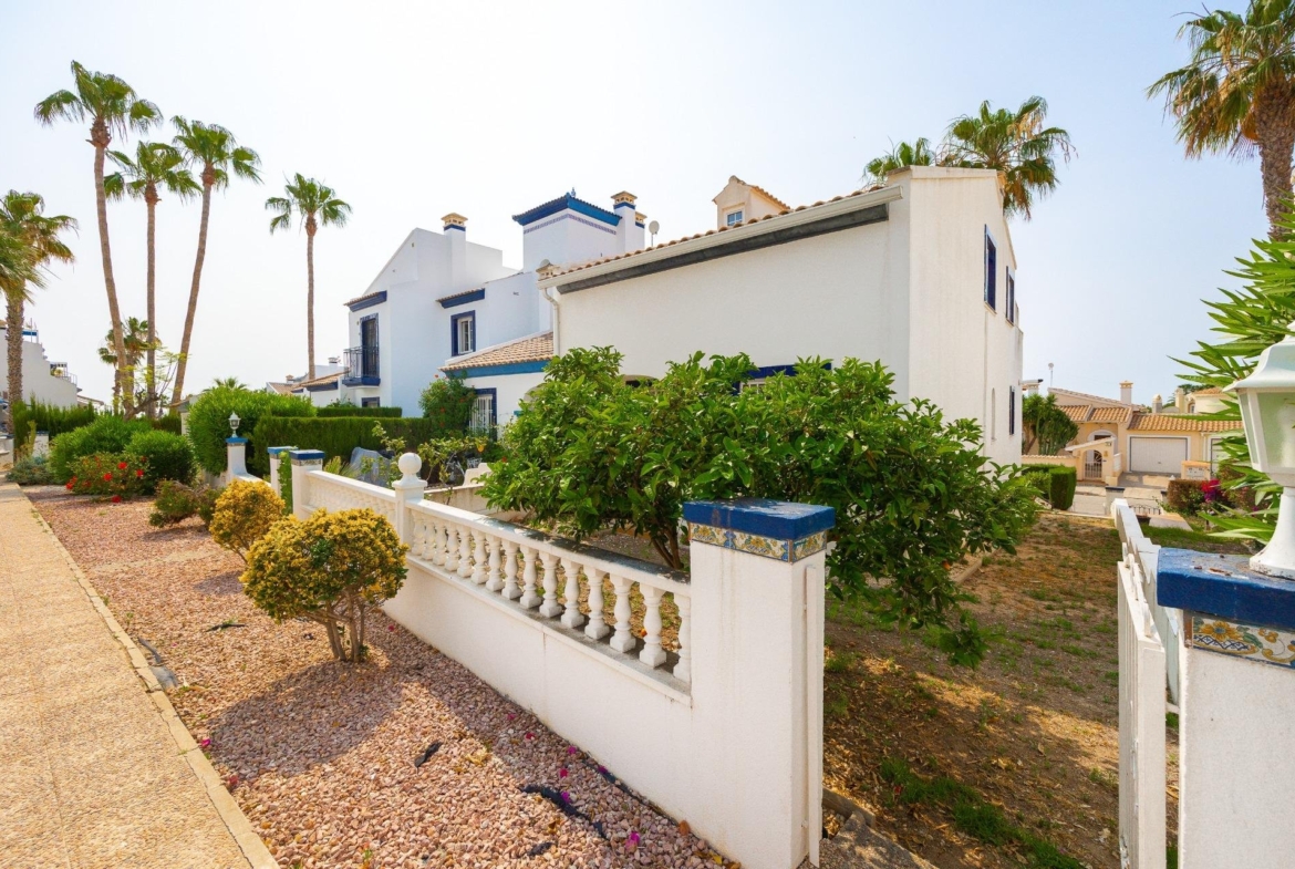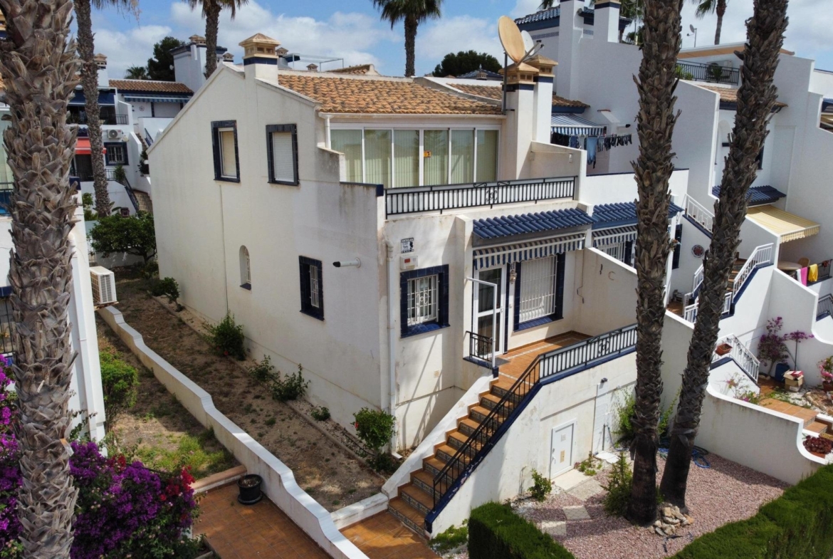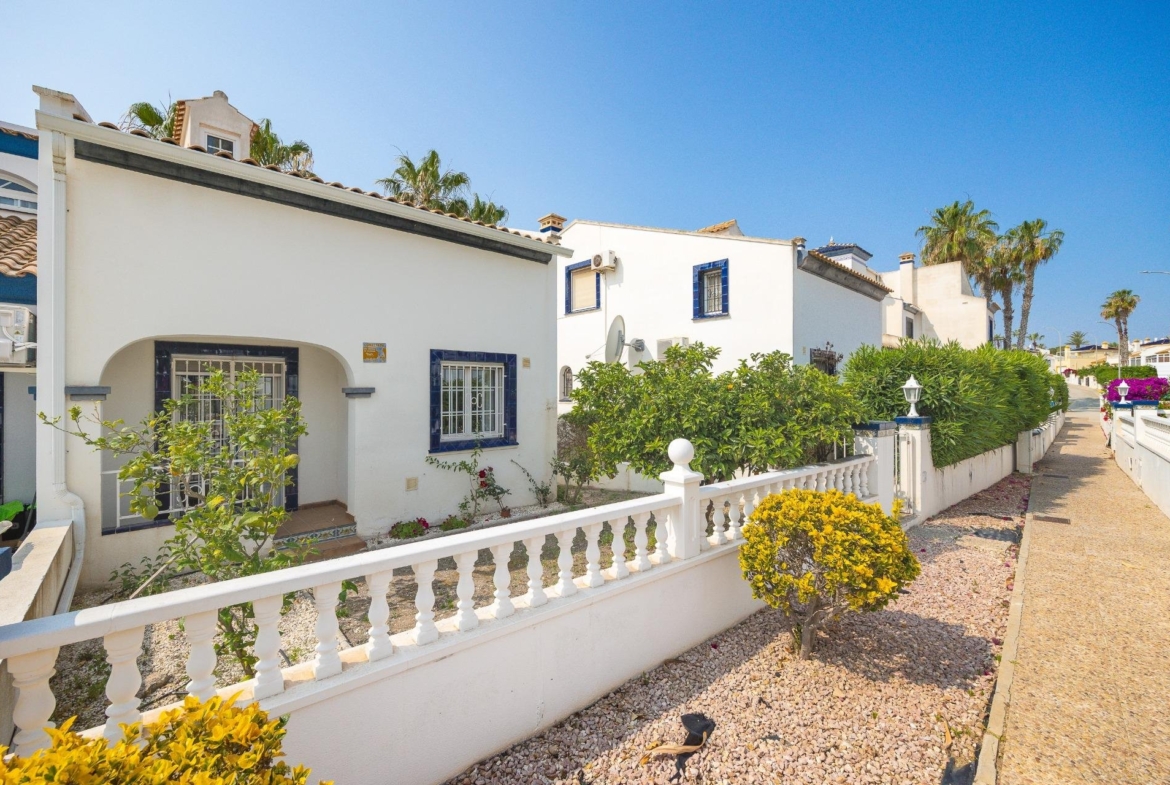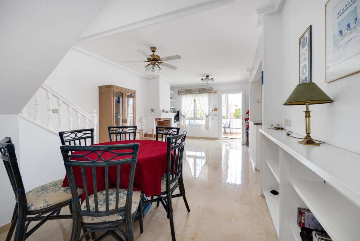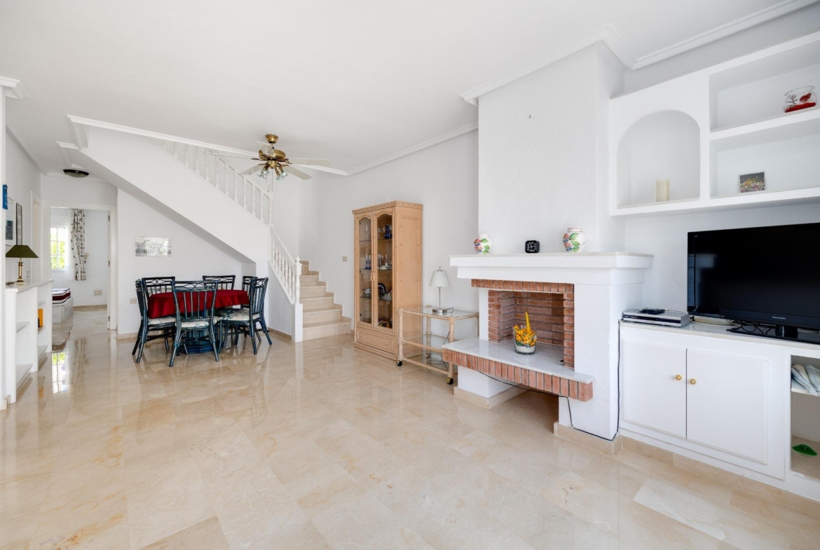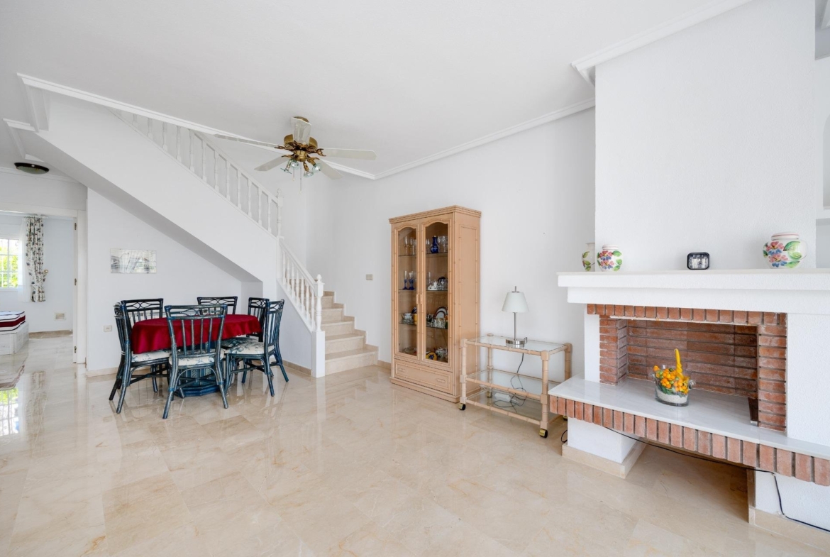 Discover this exceptional semi-detached villa located in the vibrant area of Villamartin, just moments away from renowned golf courses and the picturesque Los Dolses neighborhood. This meticulously maintained property boasts three spacious bedrooms—two conveniently situated on the ground floor—and two modern bathrooms (one on each level). The expansive living-dining room features a cozy fireplace, perfect for relaxation. A fully equipped open-plan kitchen enhances your culinary experience. An elegant interior staircase leads you to the upper floor where you’ll find a generous master bedroom with access to a private solarium offering stunning unobstructed sea views 🌊☀️.~~The villa sits on its own plot which includes charming front and side gardens as well as an additional rear garden providing direct access to communal swimming pool facilities 🏊♂️🌳. For added convenience, resident-only parking is available right at your doorstep 🚗.~~Enjoy all necessary amenities within easy walking distance or short drive; everything you need is accessible! Don’t let this fantastic opportunity slip by—come see it today!