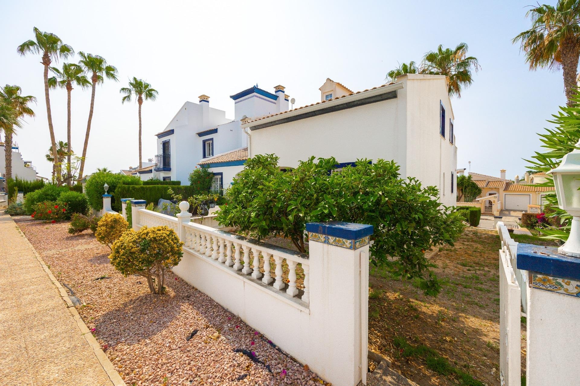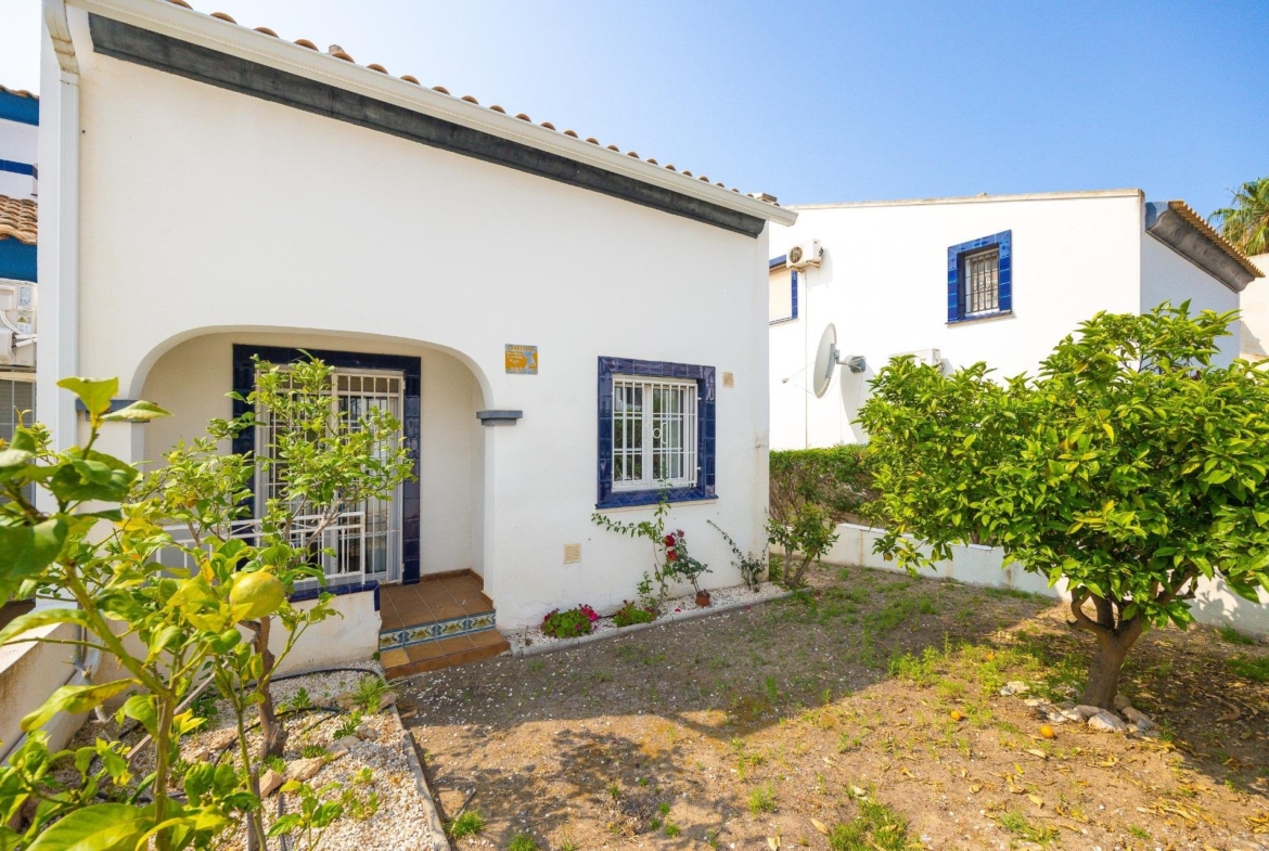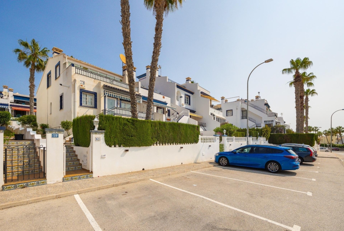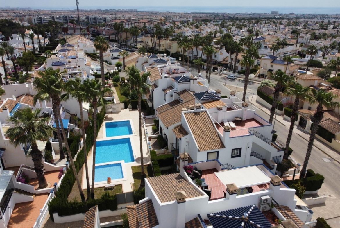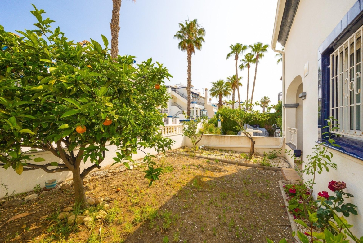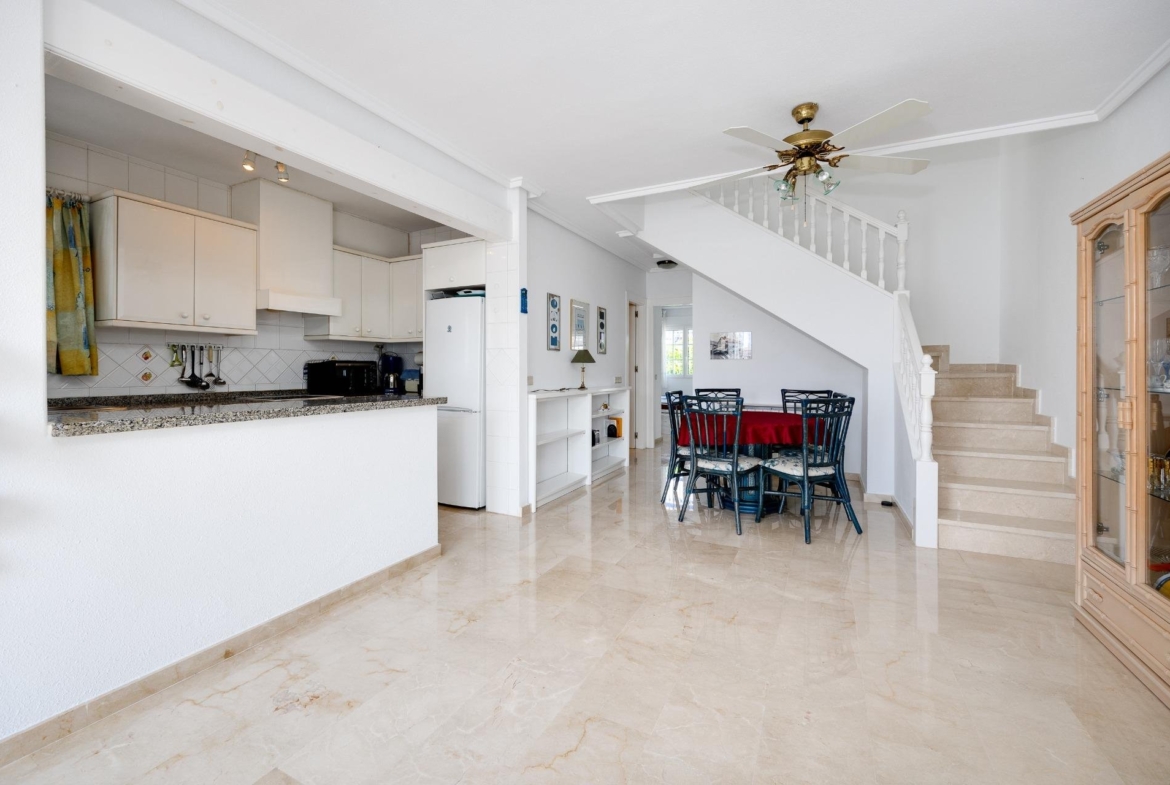 Discover this exceptional semi-detached villa located in the vibrant area of Villamartin, just moments away from renowned golf courses and the picturesque Los Dolses neighborhood. This meticulously maintained property boasts three spacious bedrooms—two conveniently situated on the ground floor—and two modern bathrooms (one on each level). The expansive living-dining room features a cozy fireplace, perfect for relaxation. A fully equipped open-plan kitchen enhances your culinary experience. An elegant interior staircase leads you to the upper floor where you’ll find a generous master bedroom with access to a private solarium offering stunning unobstructed sea views 🌊☀️.~~The villa sits on its own plot which includes charming front and side gardens as well as an additional rear garden providing direct access to communal swimming pool facilities 🏊♂️🌳. For added convenience, resident-only parking is available right at your doorstep 🚗.~~Enjoy all necessary amenities within easy walking distance or short drive; everything you need is accessible! Don’t let this fantastic opportunity slip by—come see it today!