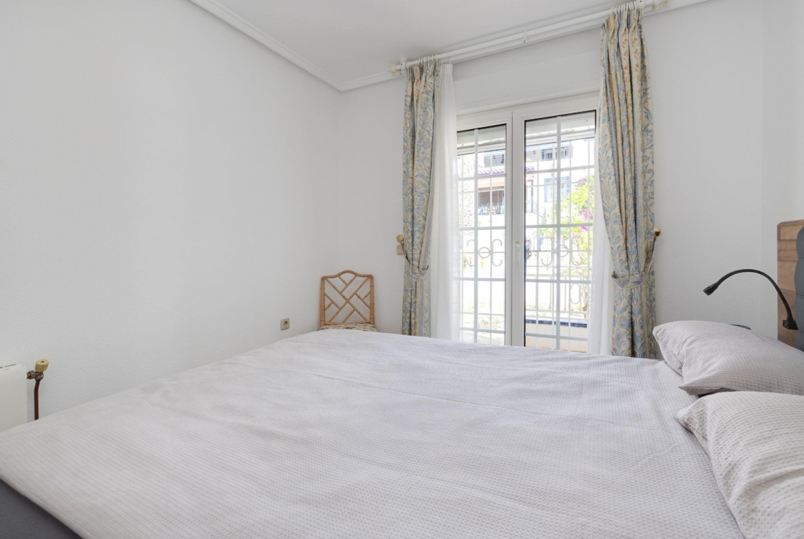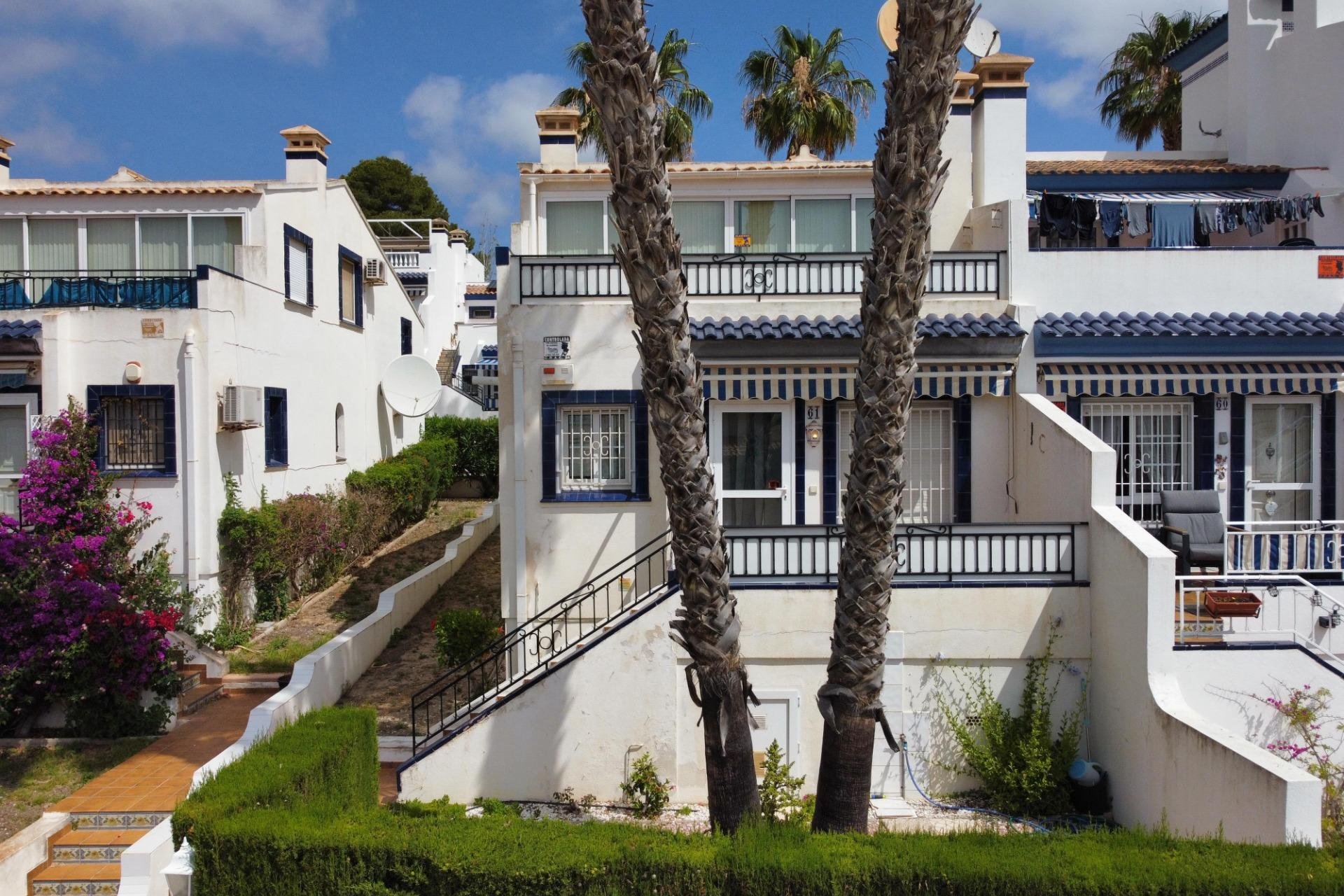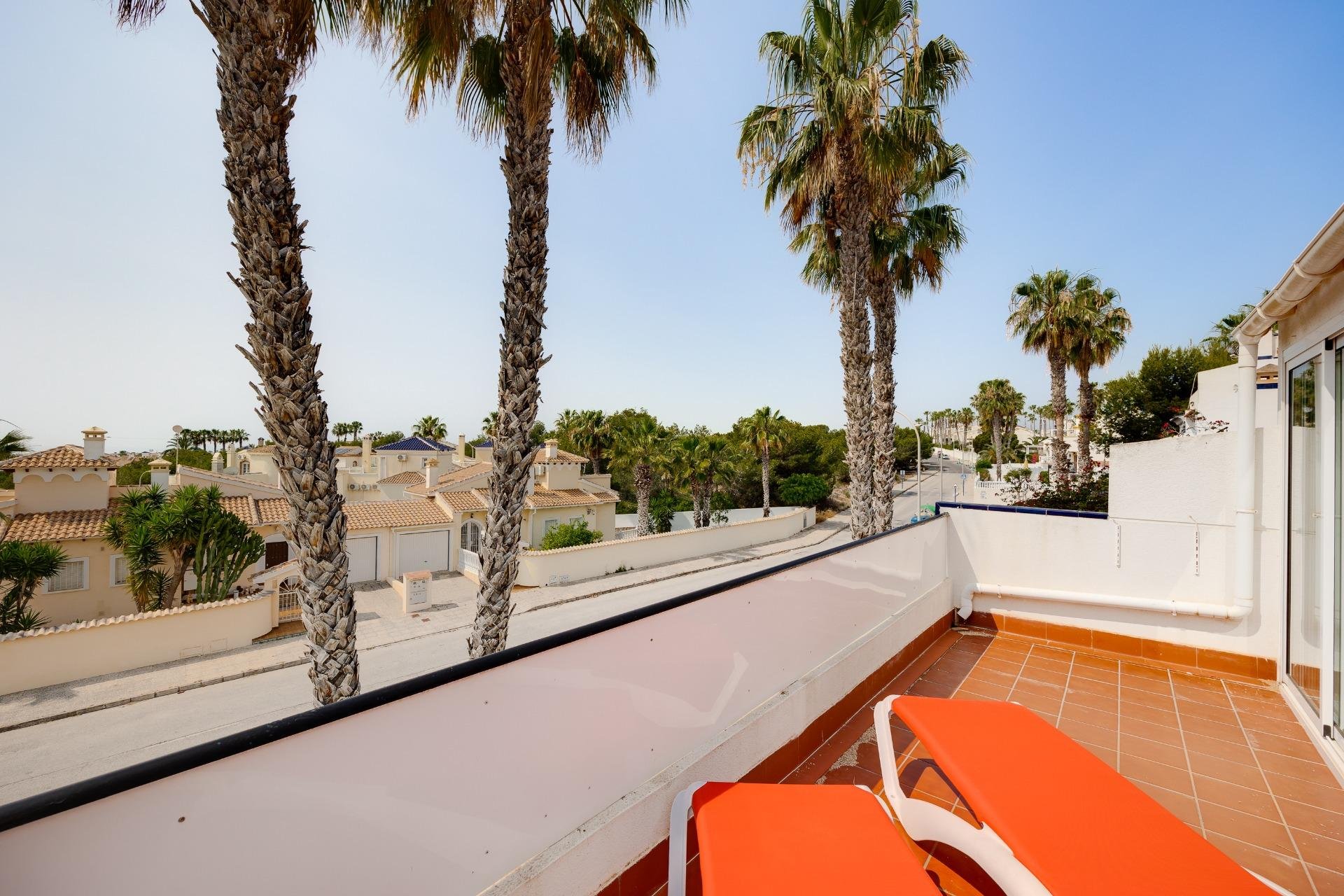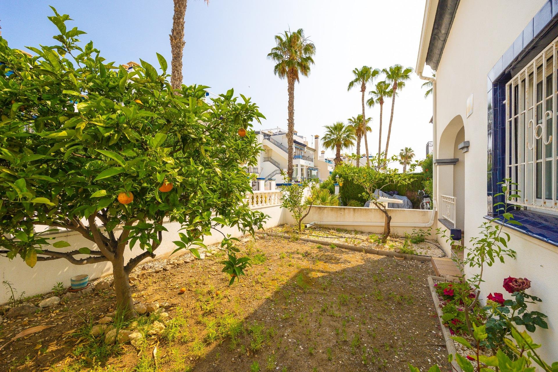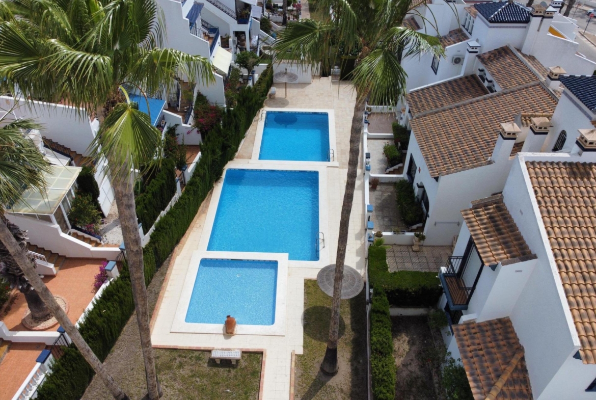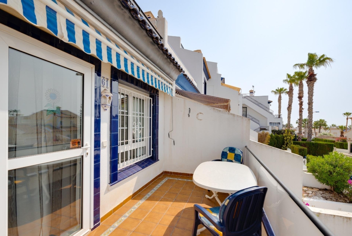 Discover this exceptional semi-detached villa located in the vibrant area of Villamartin, just moments away from renowned golf courses and the picturesque Los Dolses neighborhood. This meticulously maintained property boasts three spacious bedrooms—two conveniently situated on the ground floor—and two modern bathrooms (one on each level). The expansive living-dining room features a cozy fireplace, perfect for relaxation. A fully equipped open-plan kitchen enhances your culinary experience. An elegant interior staircase leads you to the upper floor where you’ll find a generous master bedroom with access to a private solarium offering stunning unobstructed sea views 🌊☀️.~~The villa sits on its own plot which includes charming front and side gardens as well as an additional rear garden providing direct access to communal swimming pool facilities 🏊♂️🌳. For added convenience, resident-only parking is available right at your doorstep 🚗.~~Enjoy all necessary amenities within easy walking distance or short drive; everything you need is accessible! Don’t let this fantastic opportunity slip by—come see it today!