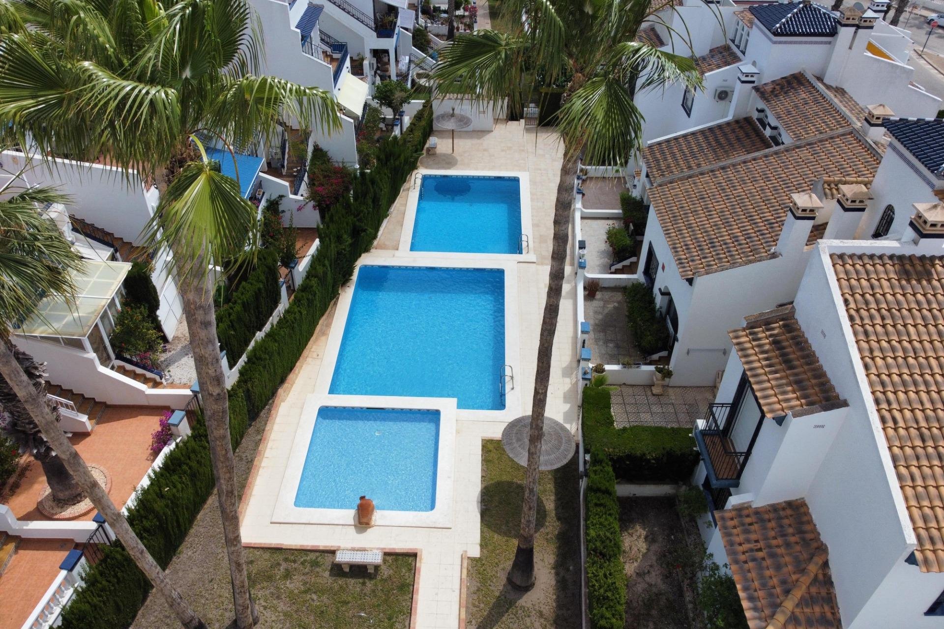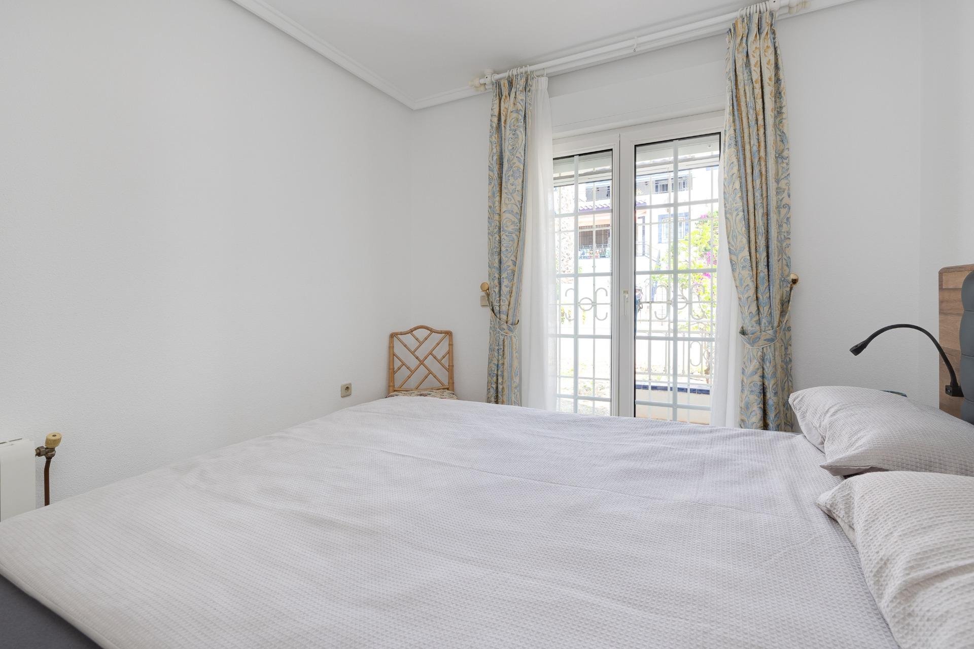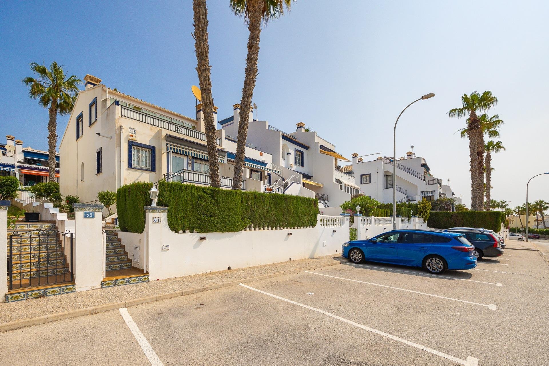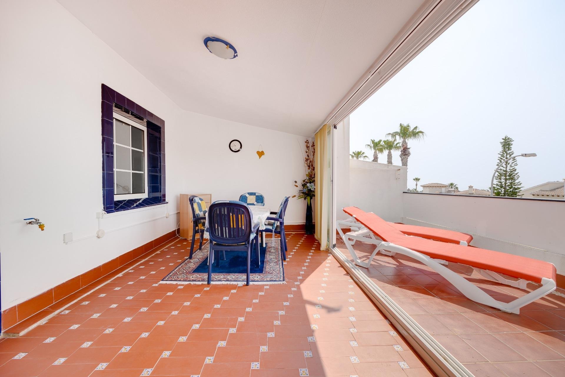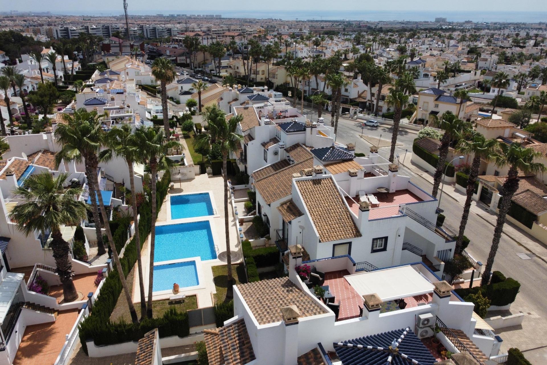 Discover this exceptional semi-detached villa located in the vibrant area of Villamartin, just moments away from renowned golf courses and the picturesque Los Dolses neighborhood. This meticulously maintained property boasts three spacious bedrooms—two conveniently situated on the ground floor—and two modern bathrooms (one on each level). The expansive living-dining room features a cozy fireplace, perfect for relaxation. A fully equipped open-plan kitchen enhances your culinary experience. An elegant interior staircase leads you to the upper floor where you’ll find a generous master bedroom with access to a private solarium offering stunning unobstructed sea views 🌊☀️.~~The villa sits on its own plot which includes charming front and side gardens as well as an additional rear garden providing direct access to communal swimming pool facilities 🏊♂️🌳. For added convenience, resident-only parking is available right at your doorstep 🚗.~~Enjoy all necessary amenities within easy walking distance or short drive; everything you need is accessible! Don’t let this fantastic opportunity slip by—come see it today!