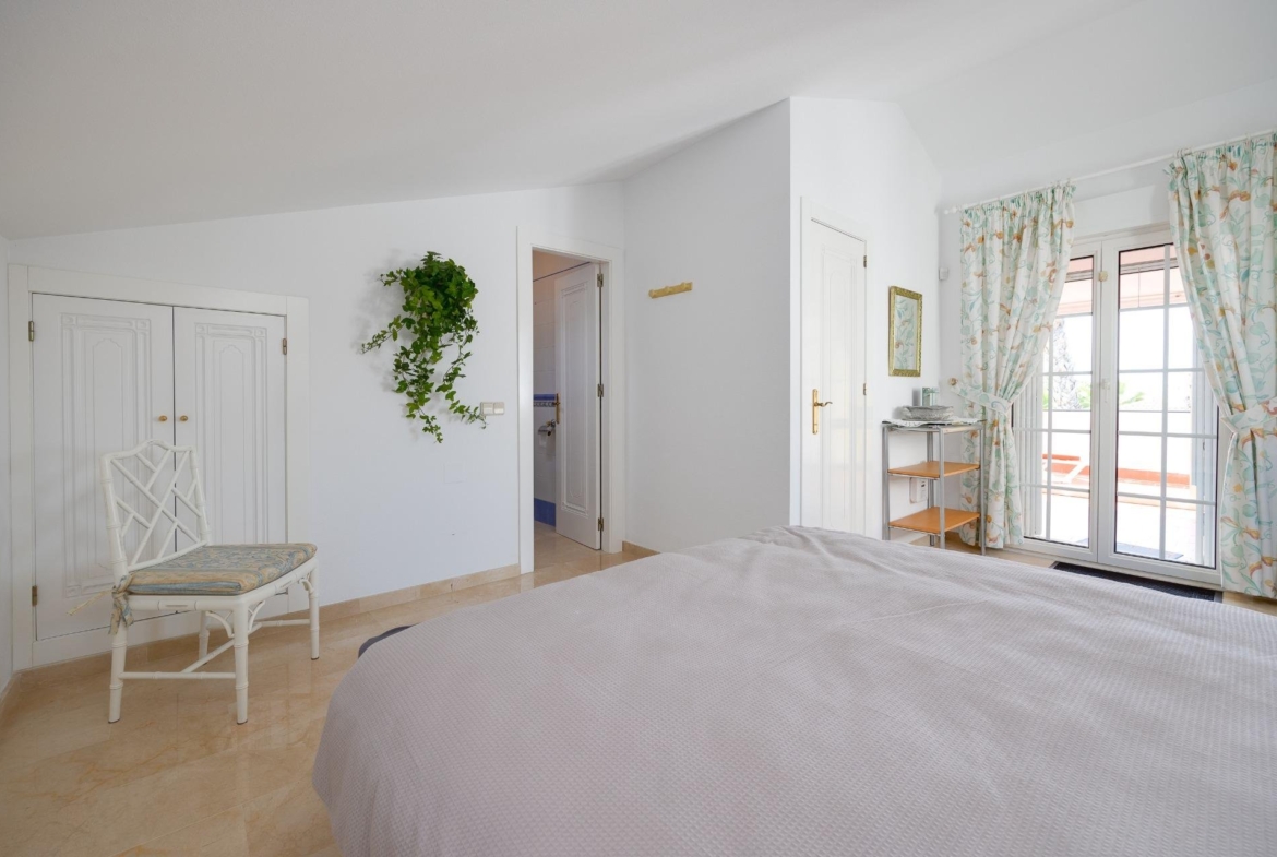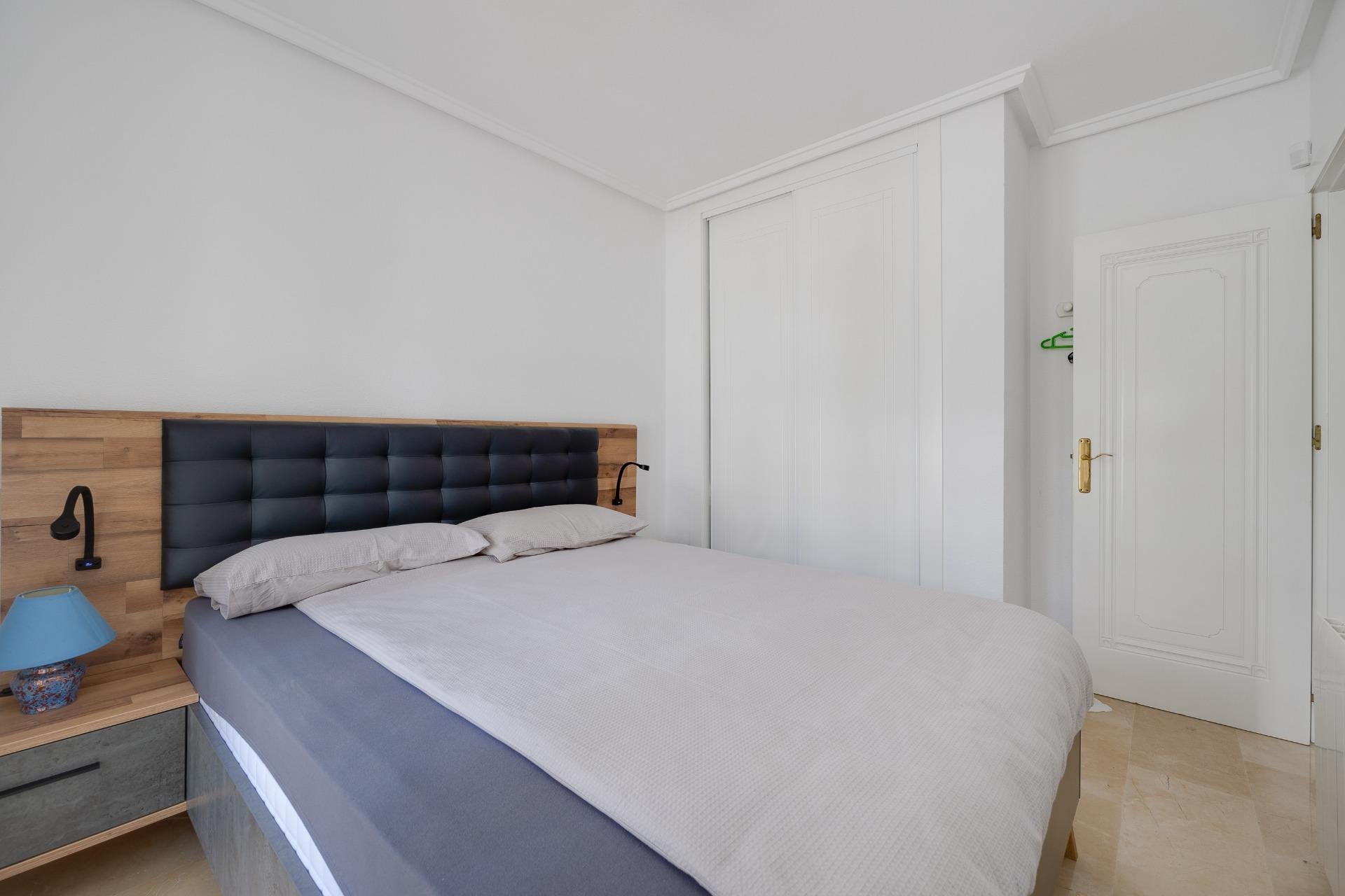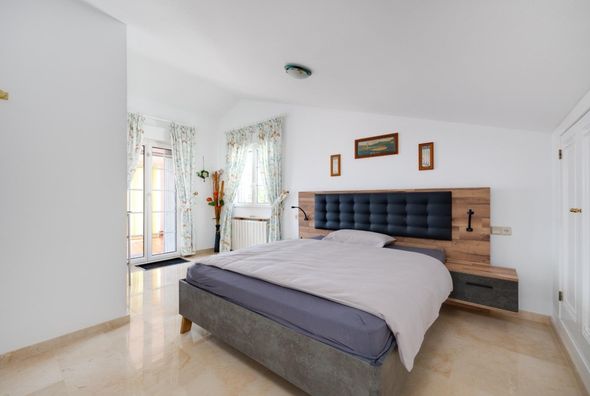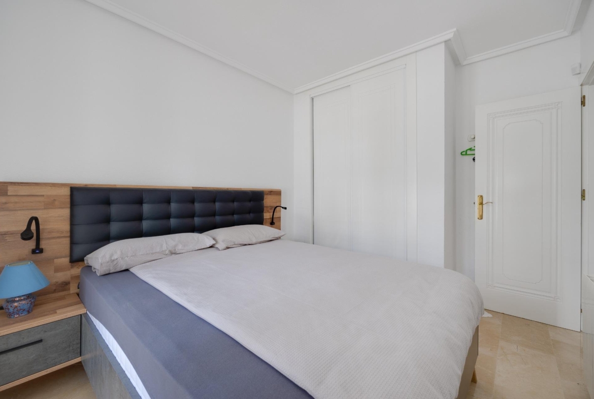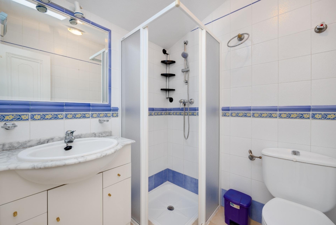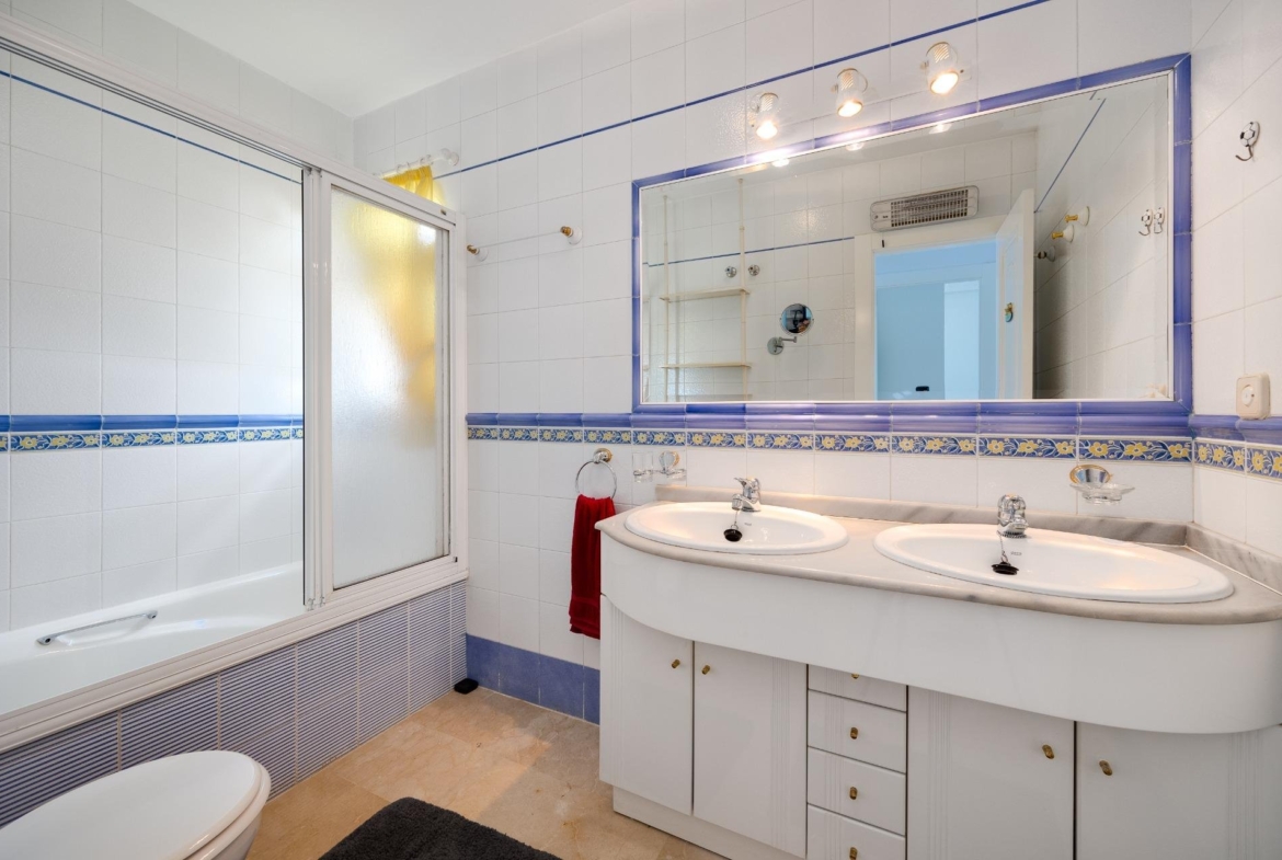 Discover this exceptional semi-detached villa located in the vibrant area of Villamartin, just moments away from renowned golf courses and the picturesque Los Dolses neighborhood. This meticulously maintained property boasts three spacious bedrooms—two conveniently situated on the ground floor—and two modern bathrooms (one on each level). The expansive living-dining room features a cozy fireplace, perfect for relaxation. A fully equipped open-plan kitchen enhances your culinary experience. An elegant interior staircase leads you to the upper floor where you’ll find a generous master bedroom with access to a private solarium offering stunning unobstructed sea views 🌊☀️.~~The villa sits on its own plot which includes charming front and side gardens as well as an additional rear garden providing direct access to communal swimming pool facilities 🏊♂️🌳. For added convenience, resident-only parking is available right at your doorstep 🚗.~~Enjoy all necessary amenities within easy walking distance or short drive; everything you need is accessible! Don’t let this fantastic opportunity slip by—come see it today!
