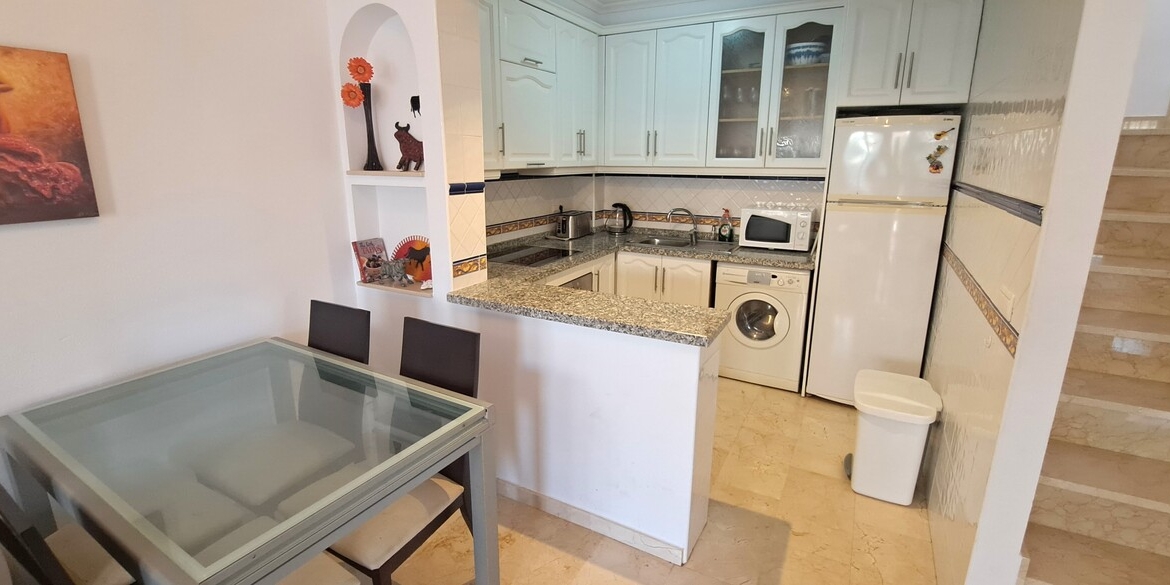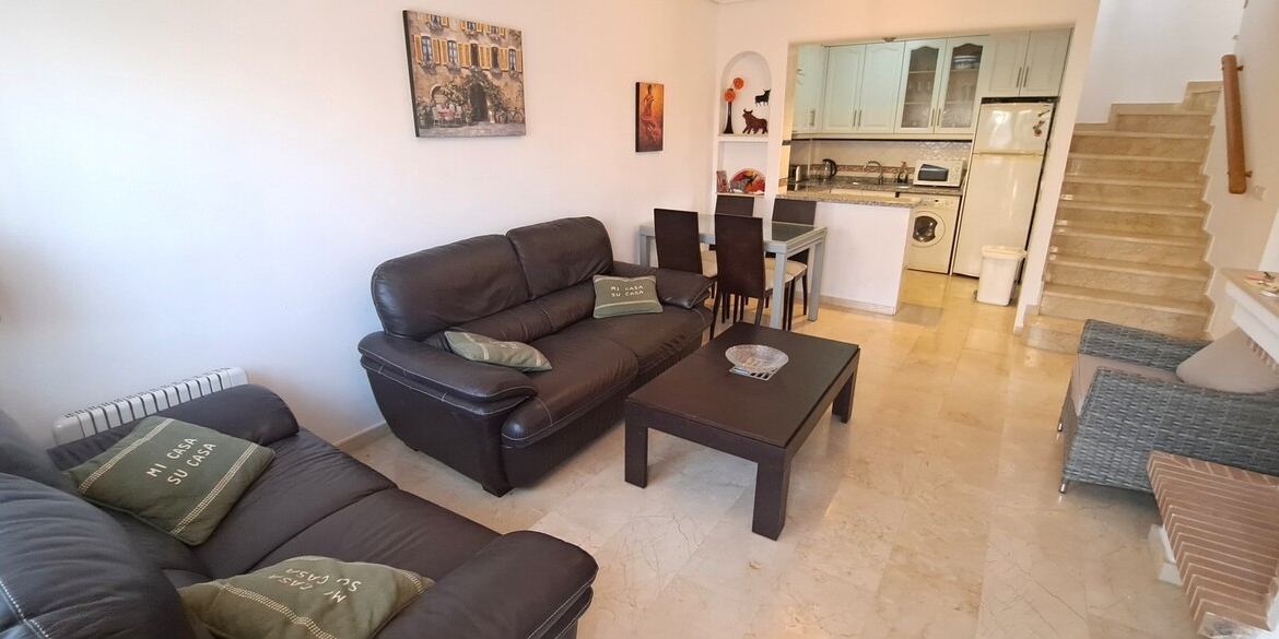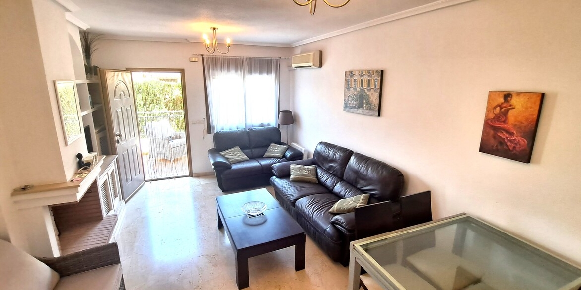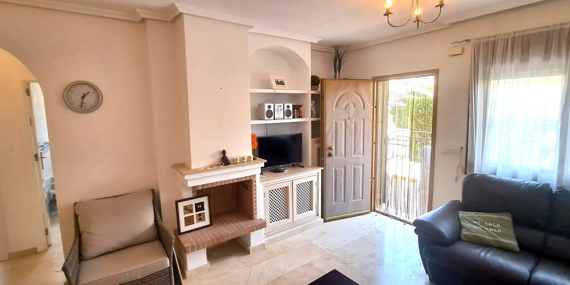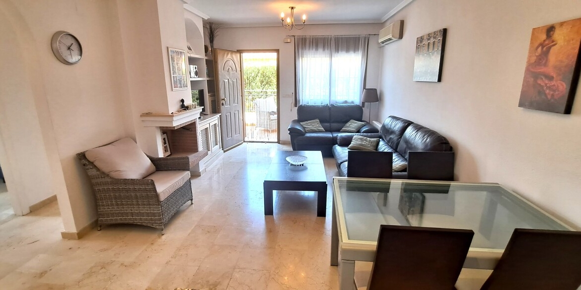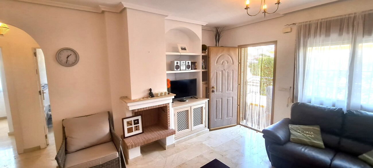 Comprising of a bright lounge-dining area with feature fireplace, a fully fitted open plan kitchen. 2 bedrooms located on ground floor level with fitted wardrobes and a family bathroom. An Internal staircase leads to the first floor and master bedroom and benefits from an en-suite bathroom. The property has beautiful marble flooring throughout and has been kept in excellent condition by the current owner. There is a tranquil communal pool and garden area just a few steps away from the property. This quad villa is sold fully furnished with white goods and air-conditioning units.