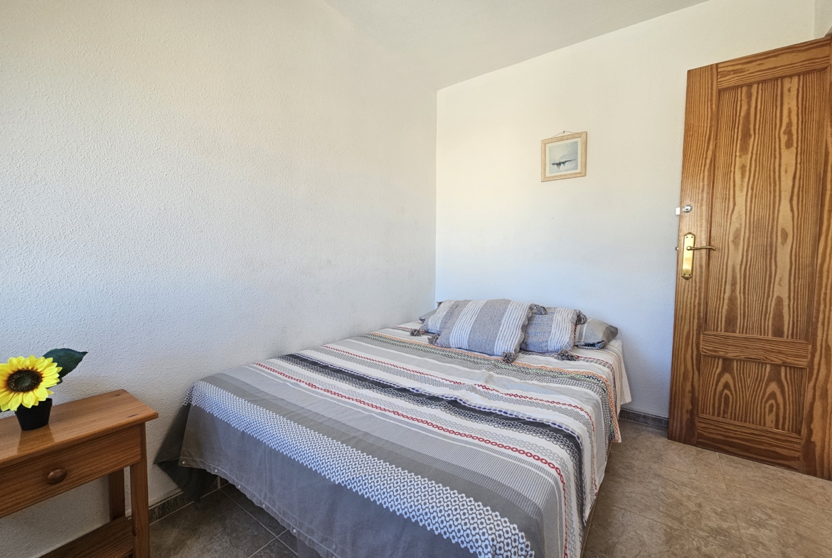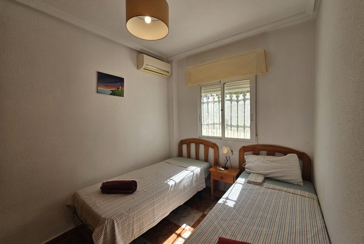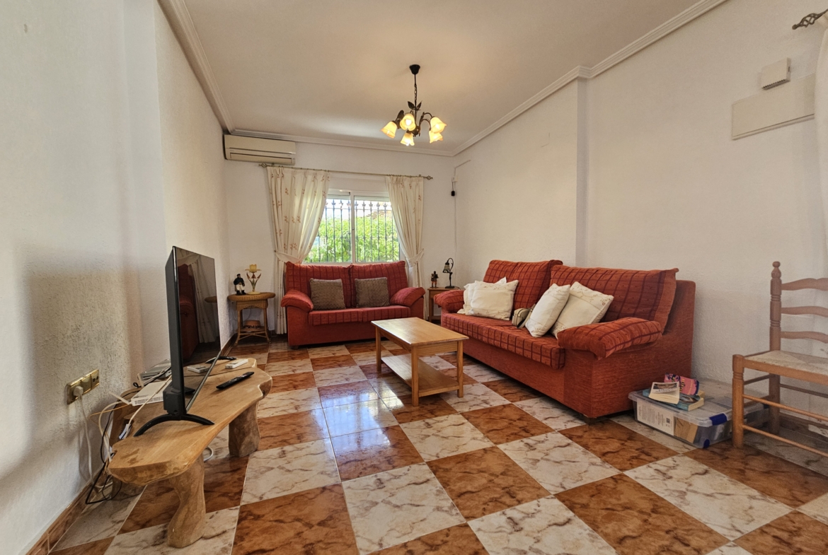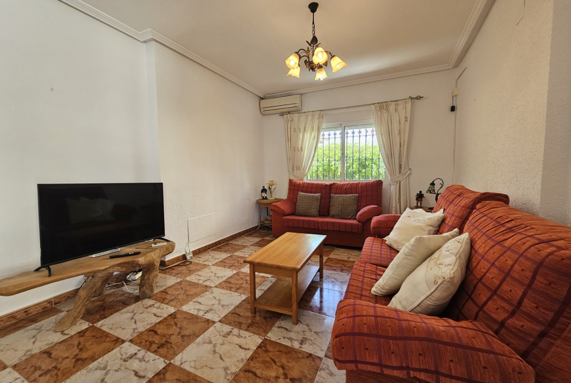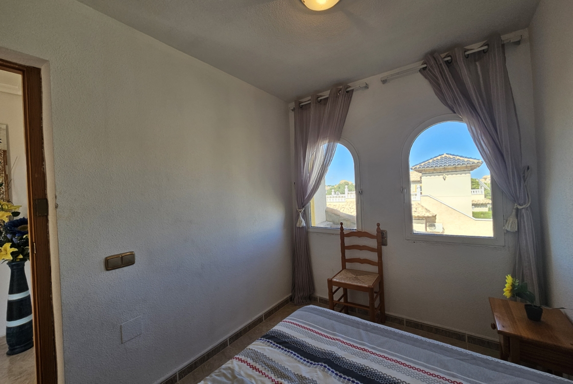 This property sits on an ample 300m2 easy to maintain plot with private swimming pool, outside dining and bbq area, plenty of space for sun-bathing and even park the car! An elevated covered terrace leads directly into the villa where you will find an open plan living room and fully equipped kitchen. There are two large bedrooms along with a family bathroom.