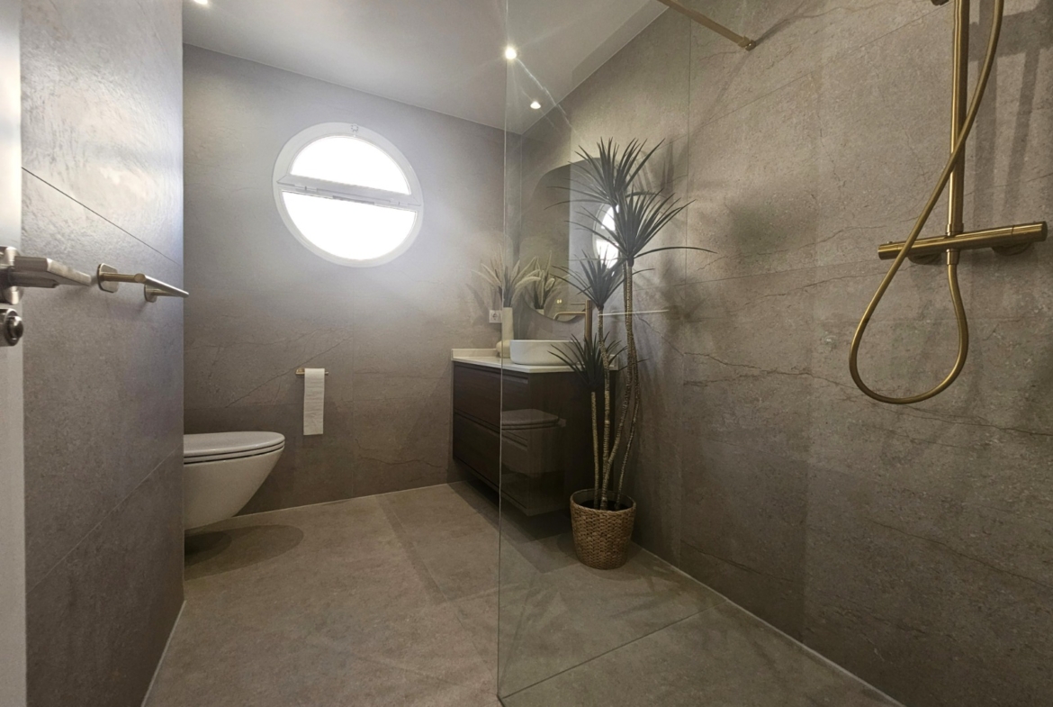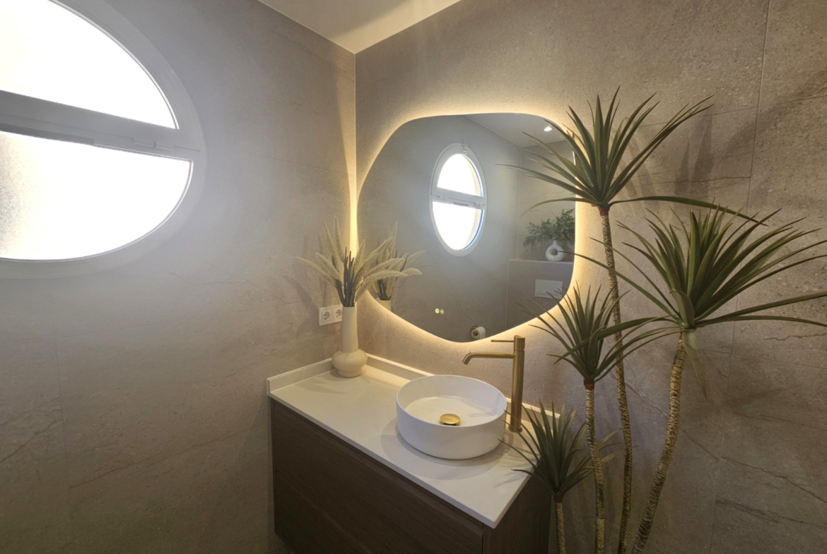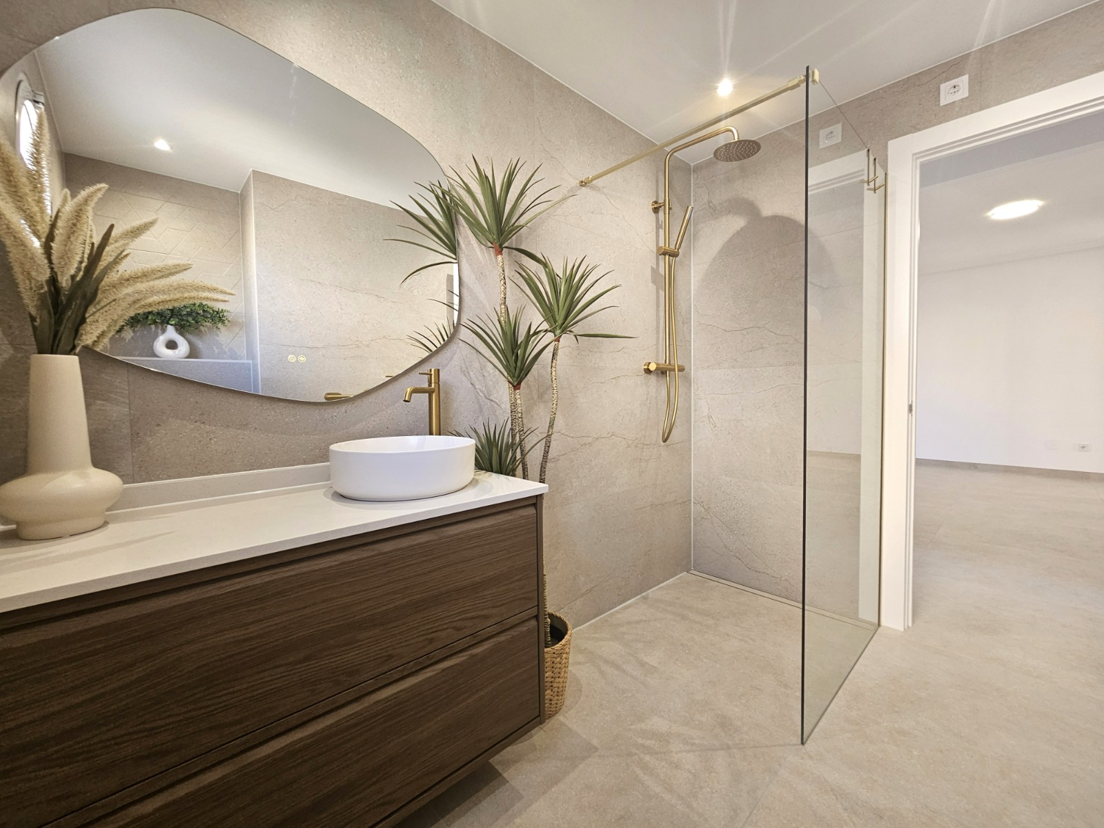 The property comprises of 2 bedrooms, each including fitted wardrobes and 1 fully renovated bathroom with walk-in shower. The cabinet includes draws and a mirror with LED backlight and anti-condensation function. The golden finishes make this stunning bathroom really stand out.
