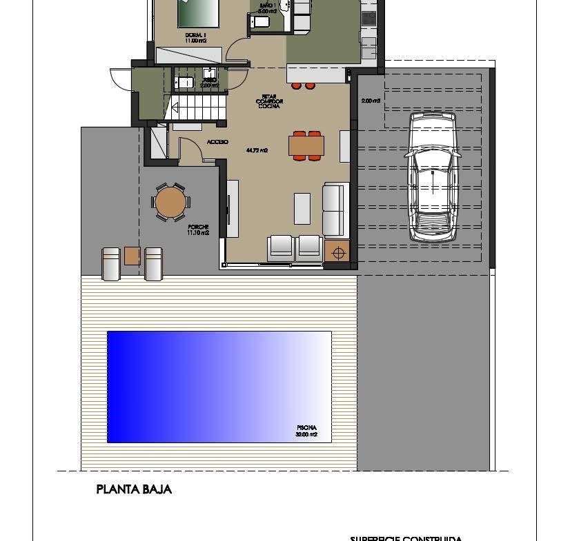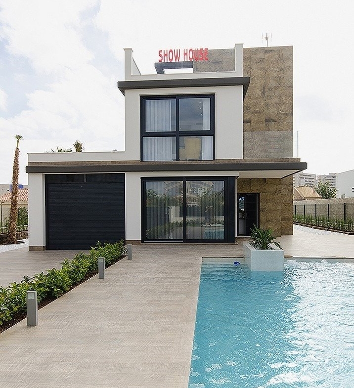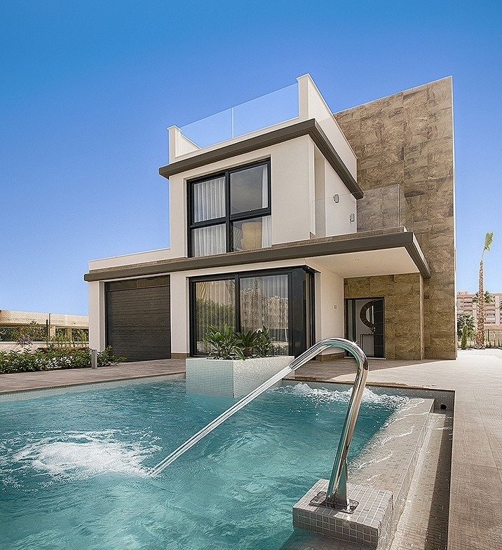 NEW BUILD VILLA IN ORIHUELA COSTA (CAMPOAMOR) Do you want to enjoy an exclusive vacation near the sea? Impossible not to fall for this ultra-modern villa in Orihuela Costa with 4 bedrooms, 2 bathrooms, private pool, garden and luxury extras, according to personal preferences. Its delicate infrastructure integrates with nature providing a quiet and isolated environment. Built with the highest quality materials, this elegant property is surrounded by abundant vegetation and a few meters from the cleanest beaches in Campoamor: Playa de la Glea, Aguamarina and Cabo Roig. It is a pleasure to have these three beautiful beaches that have been awarded with the Blue Flag within reach. Whenever you need a moment of reflection, you can go down to touch its crystal clear waters or lie down on its soft sand to read a book while listening to the placid sound of the sea. In the surroundings you will find all the essential services to live all year round: supermarkets, pharmacies, cafes, restaurants, shopping centers … And if you are also enthusiastic about golf, less than 10 minutes away you can choose between three privileged golf courses of international recognition where put your aim to the test: Las Colinas Golf, Villamartín or Las Ramblas. The promotion includes several models of homes with 2,3,4 and up to 5 bedrooms. This particular villa consists of 4 double bedrooms, 2 bathrooms, a fully equipped American kitchen, an open living-dining room with great lighting, access to the garden and the beautiful pool. In addition, the price includes: Underfloor heating and mirror in bathrooms Indoor and outdoor lights Built-in wardrobes Security door Pre-installation of air conditioning Top brand appliances The house follows the trend of open concept design, enhancing spacious spaces and offering a greater sense of comfort and well-being in its interiors. 1049
