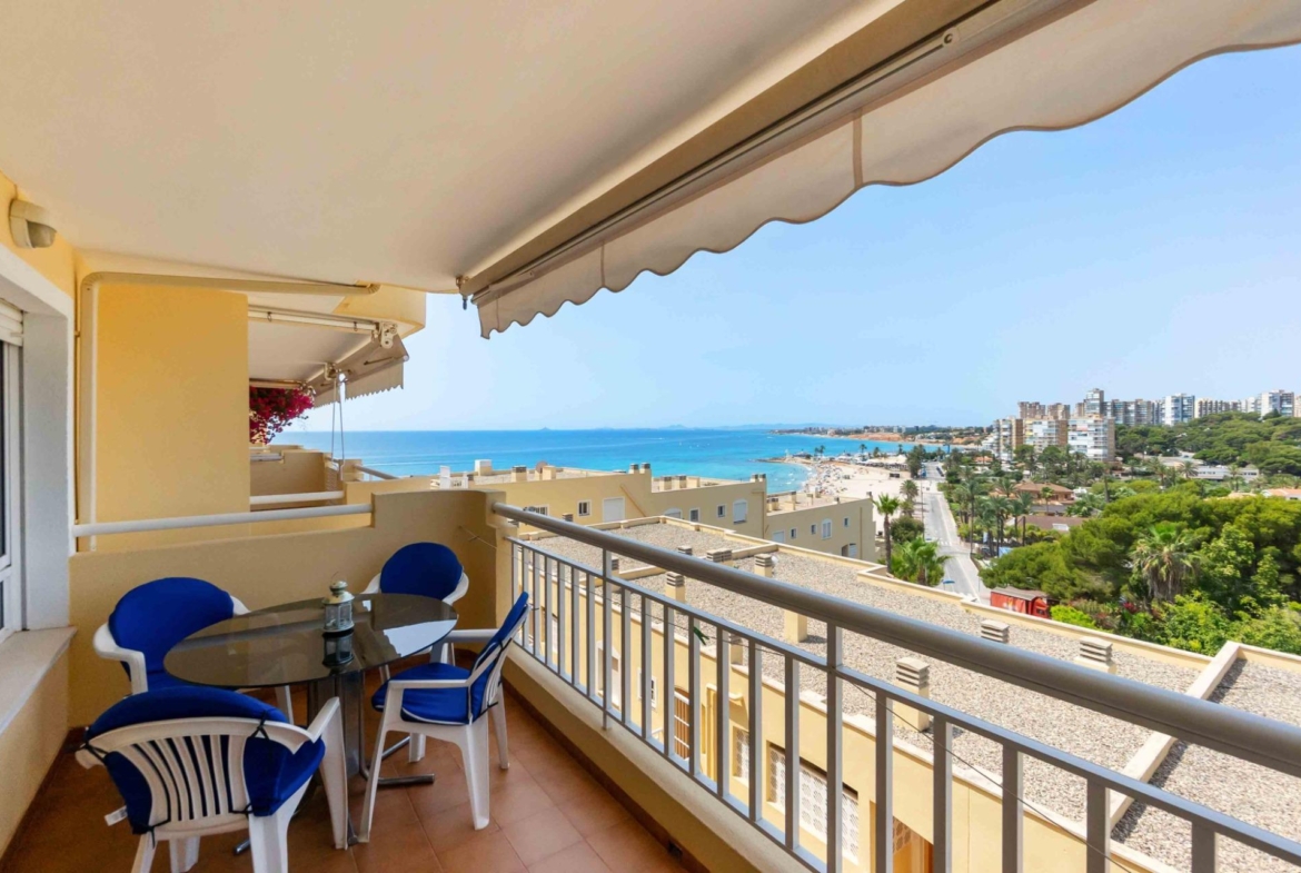 Fantastic apartment with panoramic sea views on the first line. Second floor, south facing. 91m2, three bedrooms, two complete bathrooms (one en suite), an independent equipped kitchen, living-dining room and 15m2 of the terrace. A/C in the living room. Sold partially furnished. The residential complex with a swimming pool is located just above the Aguamarina and Campoamor beaches, with direct private access to the beach. The apartment has parking place and storage.