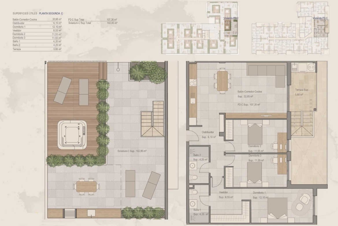 NEW BUILD PENTHOUSES IN TORRE-PACHECO New Build residential complex of apartments in Torre Pacheco (Murcia) in the heart of Costa Cálida. The second phase has 25 apartments and penthouses with 2 and 3 bedrooms. Modern apartments with open plan kitchen with spacious and bright living-dining room with access to a large terrace. Modern penthouses has private solarium. An options underground parking space and storage room at an extra cost. Modern complex with communal swimming pool and garden areas. All the comforts are at your fingertips. There are supermarkets, pharmacies, banks, schools, bars, restaurants, the beach and the airport are just a few minutes away. There is also a golf club in town very close to the apartments and there are several golf courses within a 10-25 minute drive from the apartments. The AP-7 highway is also close by and the N-332 is also very easy to access, so you can easily travel to other regions such as Pilar de la Horadada, San Pedro del Pinatar, Orihuela Costa, Torrevieja, Alicante, etc. The Murcia Corvera international airport is 20 minutes away, Alicante airport about an hour away. 1049