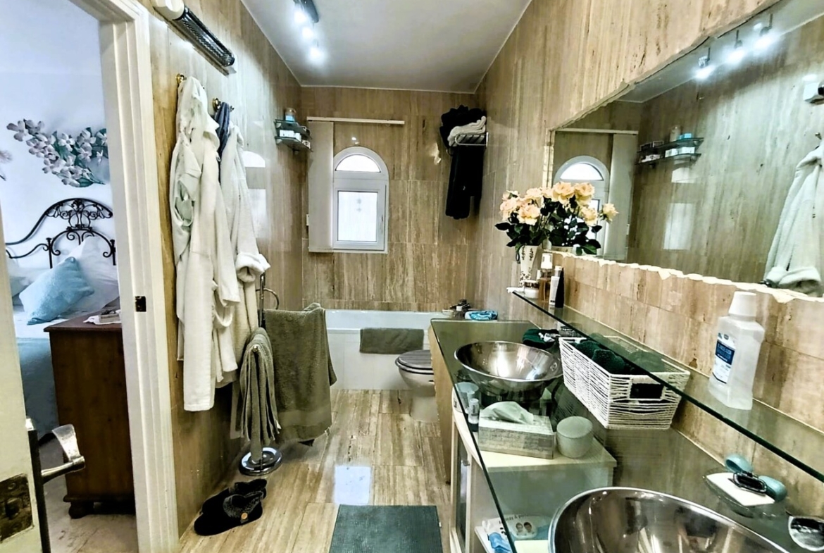 On the top level, turning left from the entrance takes you into a fully fitted kitchen. The kitchen features two sets of patio doors, both opening onto expansive terraces, perfect for al fresco dining and entertaining around the built-in BBQ area. From the kitchen, a staircase leads up to the mezzanine level, where you’ll find Bedroom 4, currently used as an office. This area also includes an open space ideal for relaxing.