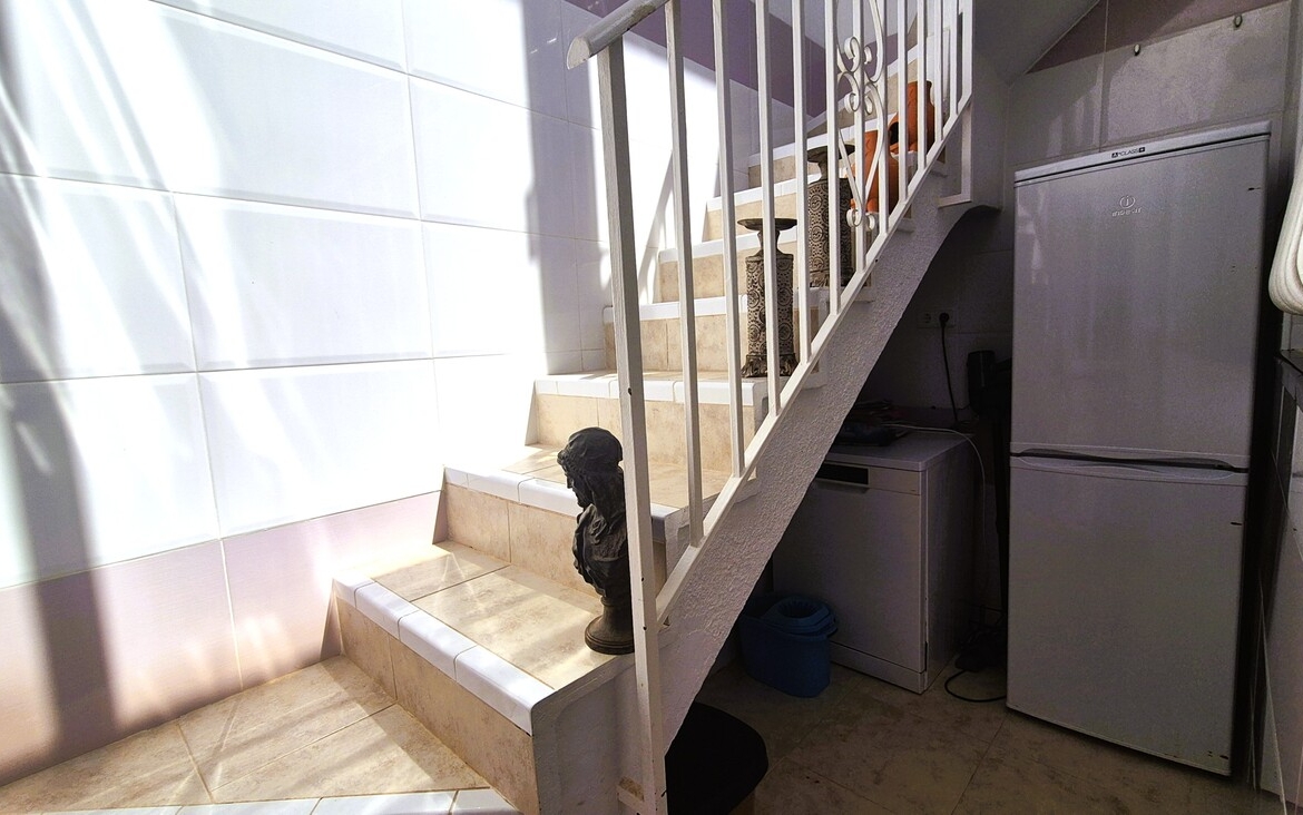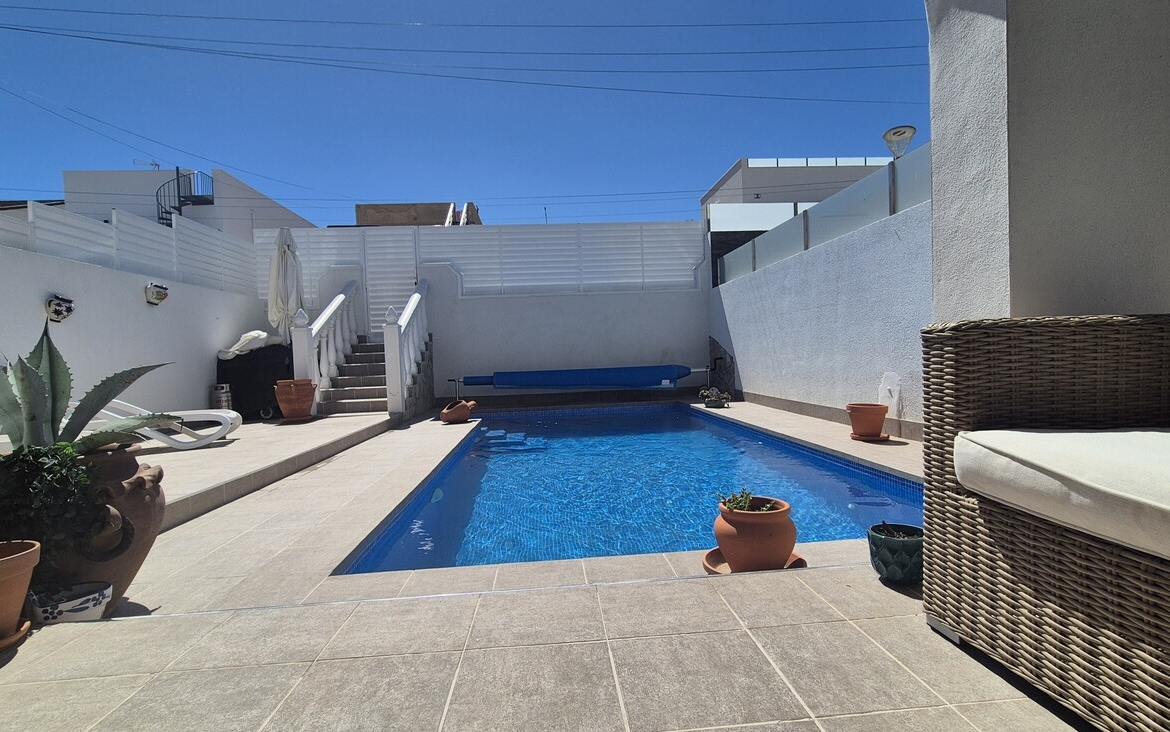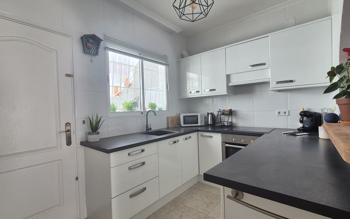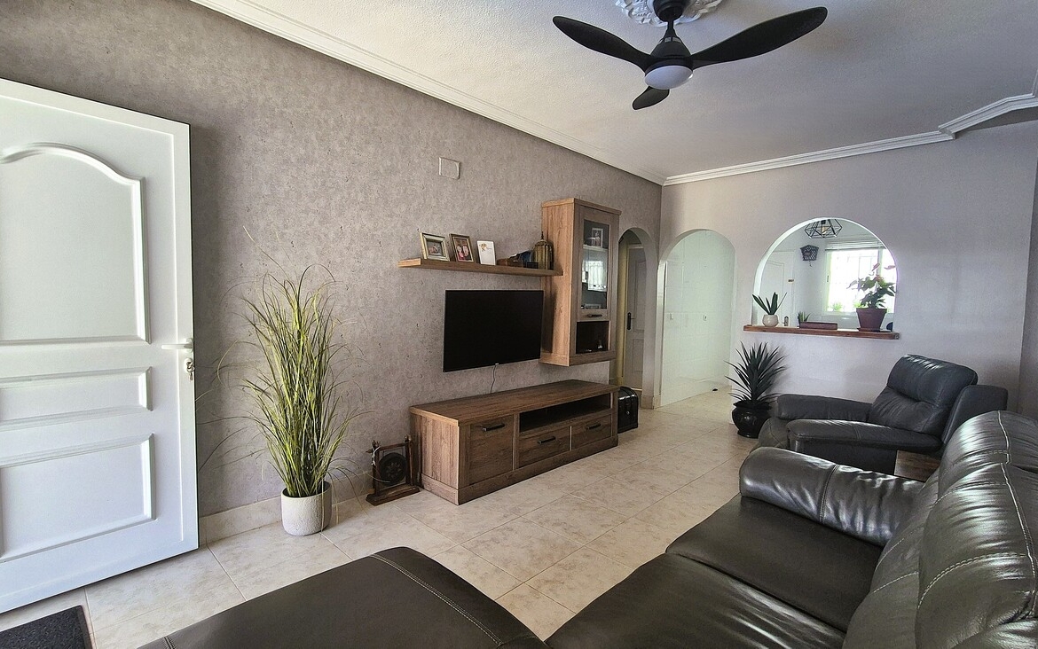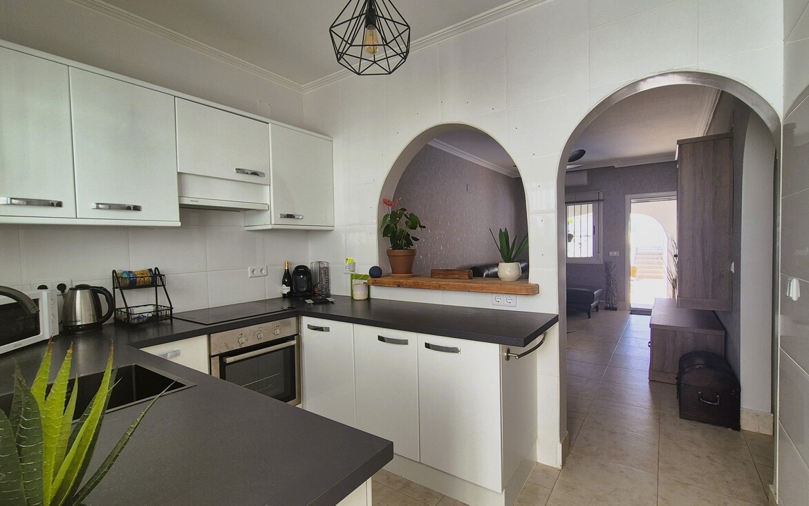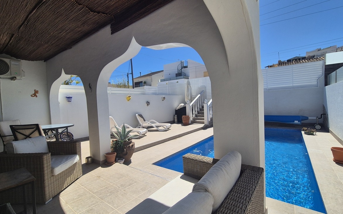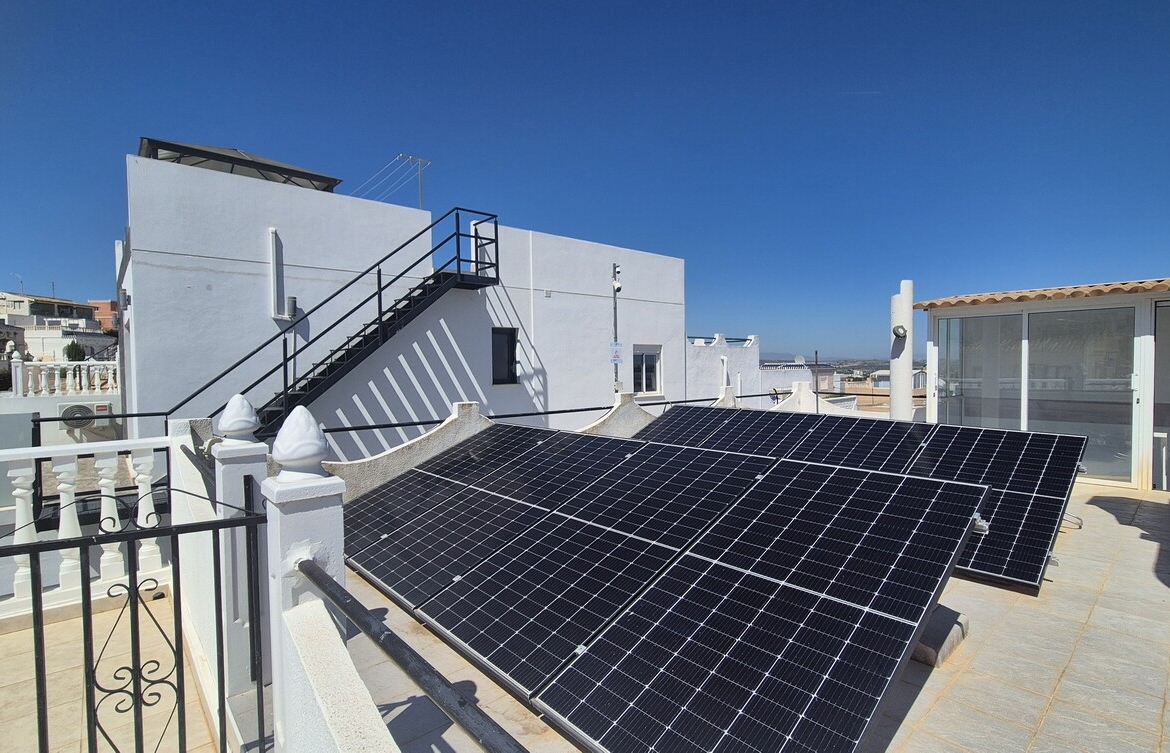 The renovation includes:New Metal Fencing to the boundary of the propertyNewly built – HEATED and Covered – SALT WATER Swimming Pool to ensure all year round swimming. The pool has steps entery and a seating area at one end, the full width of of the pool.Newly tiled patio/terraceFreshly painted exterior to the house and boundary wallsNew Gas BoilerSOLAR PANELS – with Solar wallet to supplier and giving free ElectricityRefurbished BathroomRefurbished KitchenInternal walls Plastered to smooth finishNew fitted wardrobe to the main bedroomNew Air-conditioning units running also from wifi if required, allowing you to remotely start on a timer or immediately, from anywhere. Ideal if out and wanting a cool home to return to.New Remote controlled Ceiling FansImagine yourself sitting in the garden of this Beautiful South Facing property, being able to swim, all year round in the Newly Built, Heated Salt water Swimming pool or just simply relaxing on the Terrace.Entering the property, you have a bright spacious lounge and semi open plan to the kitchen which leads onto a utility area, which houses the Washing machine, Dishwasher & Fridge Freezer.The rear stairs lead to the Solarium which currently is home to the Solar Panels. (The Solarium has views to the Salt lakes and offers the potential to be extended to add further bedrooms and bathrooms)There are 2 Large Bright Bedrooms and a refurbished Bathroom.To the side of the property is an external Brick Built Storage area.This Semi Detached property is located in San Miguel De Salinas, which is a multi National community. It is just a 10 minute walk from the Village of San Miguel, which offers Supermarkets, Bars, Restaurants, Shops, Schools and more. There is also a Bar, just at the end of the road of which the Villa is situated.There is a bus service just a 2 minute walk from the house, taking you into La Zenia and also Torrevija (links to the airport). Also a good local Taxi service.Villamartin – GOLF – La Zenia Boulevard and local Beaches & Zoco Market are just a 8- 10 minute drive from the property.Padal Courts, Tennis Courts, Petanque, 5 Min walk from the property.