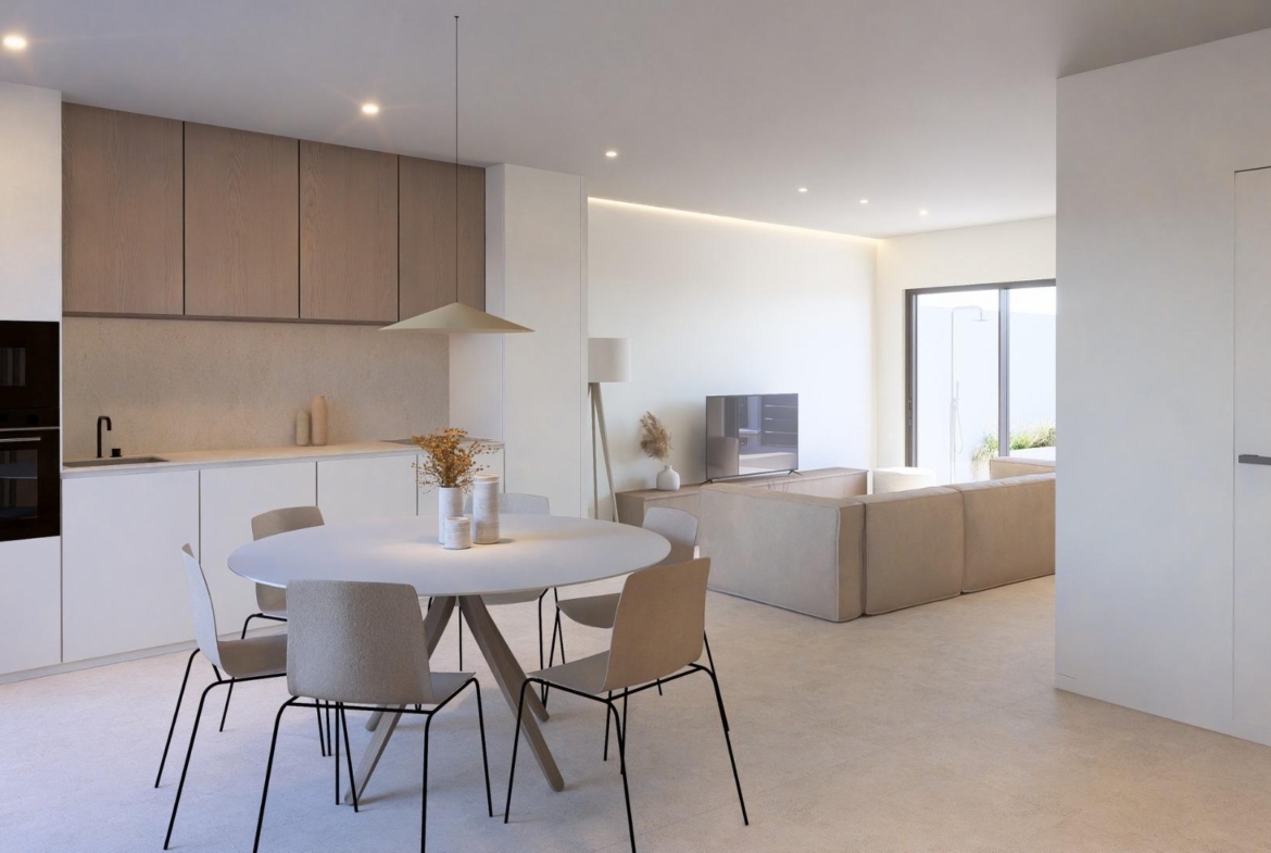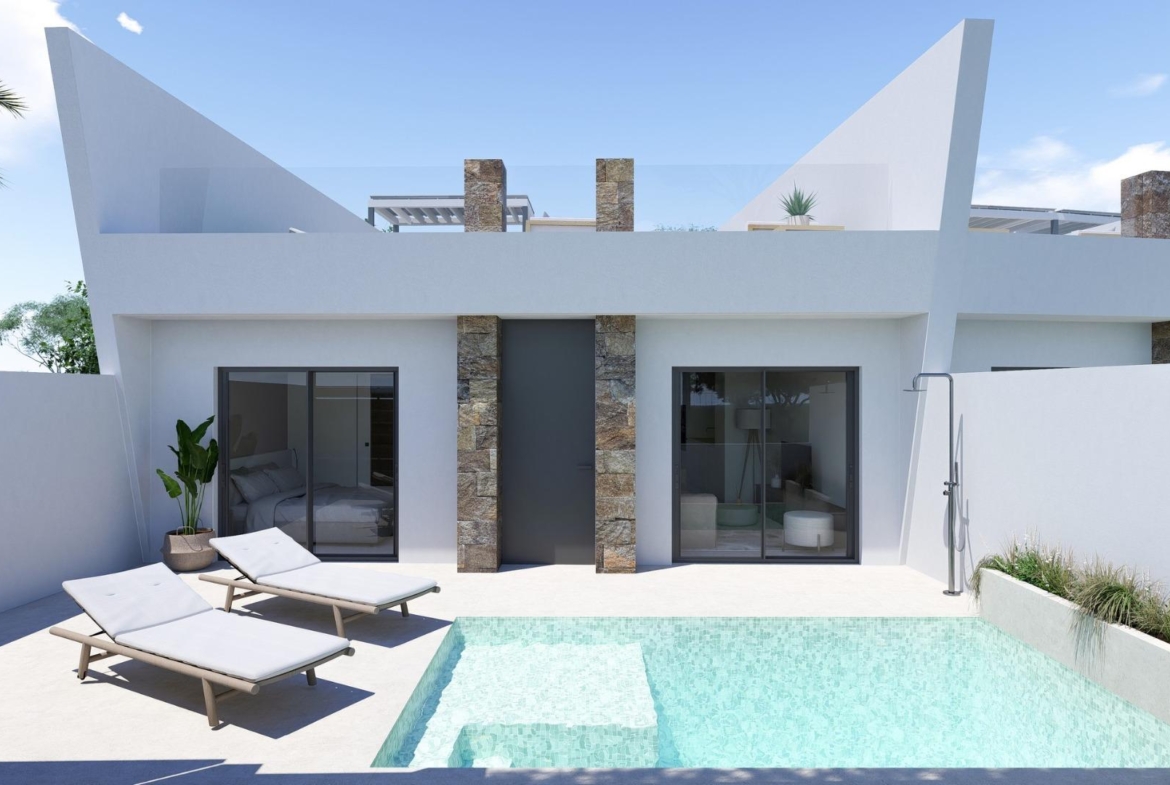 Modern New Build Townhouses with Private Pool in El Alba Resort Torre Pacheco Contemporary Homes in a Growing Mediterranean Resort Community This new build development consists of only 4 exclusive townhouses in the first phase, located in El Alba Mediterranean Resort in Torre Pacheco. Designed on one single level, these modern homes offer a perfect combination of comfort, functionality and Mediterranean outdoor living. El Alba Resort is an emerging residential area surrounded by open landscapes and golf courses, just a short distance from the town of Roldan where you will find supermarkets, restaurants, banks and daily services. The resort already features a social club with swimming pool and restaurant, and a commercial area is currently being developed, adding further convenience and value to the location. Single Level Living with Private Garden and Solarium Each property offers 2 bedrooms and 2 bathrooms, one of them ensuite, with an open plan kitchen connected to a bright living room. The layout is carefully designed to maximize natural light and create a seamless connection between indoor and outdoor spaces. All homes include: Fully equipped kitchen with appliances Bathrooms with furniture, mirror, lighting and shower screens Fitted wardrobes with drawers in bedrooms Pre installation of ducted air conditioning Interior and exterior LED lighting Three photovoltaic solar panels with 1.5 kW capacity per property The exterior areas are designed for year round enjoyment, featuring a private garden with swimming pool, a terrace and a large private solarium with a summer kitchen, ideal for outdoor dining and relaxing under the sun. Quality Features Designed for Comfort and Efficiency These homes are built with elegant and functional interiors, focusing on energy efficiency and modern living. A private parking space is located within the plot, ensuring convenience and security. The combination of solar panels, quality insulation and smart design provides an energy efficient home ideal for permanent living, holiday use or rental investment. Excellent Location Near Golf Courses, Beaches and Airports Roldan town center 2 km Mar Menor beaches 15 km Mediterranean Sea beaches 20 km La Torre Golf Resort 5 km Terrazas de la Torre Golf 6 km Murcia Corvera Airport 18 km Cartagena city 30 km This strategic location allows easy access to golf, beaches, services and transport connections while enjoying a peaceful residential environment. A Smart Investment in the Costa Calida These townhouses in El Alba Mediterranean Resort offer an excellent opportunity to own a modern property with private pool in a fast growing area of Torre Pacheco. Contact us today to receive more information or to arrange a visit to these exclusive new build homes. 1049