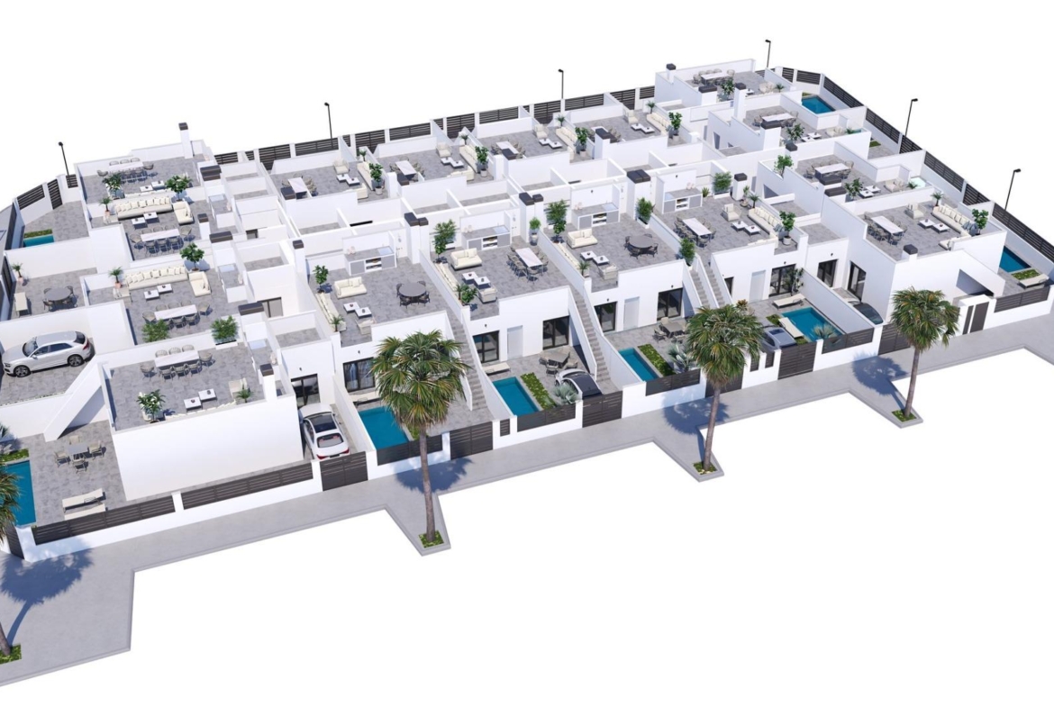 Modern, newly built semi-detached and terraced homes with private pools at El Alba Resort-Torre Pacheco Contemporary homes in a growing Mediterranean holiday community This new development comprises 16 exclusive semi-detached and terraced homes, situated at El Alba Mediterranean Resort in Torre Pacheco. Designed as single-storey homes, these modern properties offer a perfect blend of comfort, functionality and Mediterranean outdoor living. El Alba Resort is an up-and-coming residential area surrounded by open countryside and golf courses, within easy reach of the town of Roldán, where you will find supermarkets, restaurants, banks and everyday amenities. The complex already features a social club with a swimming pool and restaurant, and a retail area is currently under development, adding further convenience and value to the location. Single-storey home with private garden and sun terrace Each property features 2 bedrooms and 2 bathrooms, one of which is en-suite, with an open-plan kitchen connected to a bright living room. The layout is carefully designed to maximise natural light and create a seamless connection between indoor and outdoor spaces. All homes include: Fitted kitchen with appliances Bathrooms with vanity units, mirrors, lighting and shower screens Fitted wardrobes with drawers in the bedrooms Pre-installation for ducted air conditioning Indoor and outdoor LED lighting Three photovoltaic solar panels with a capacity of 1.5 kW per property The outdoor areas are designed to be enjoyed all year round, featuring a private garden with a swimming pool, a terrace and a large private sun deck with a summer kitchen, ideal for al fresco dining and relaxing in the sun. Quality features designed for comfort and efficiency These homes are built with stylish and functional interiors, focused on energy efficiency and modern living. The plot features a private parking space, ensuring convenience and security. The combination of solar panels, high-quality insulation and smart design provides an energy-efficient home, ideal for permanent living, holiday use or as a rental investment. Excellent location near golf courses, beaches and airports Roldán town centre 2 km away Mar Menor beaches 15 km away Mediterranean beaches 20 km away La Torre Golf Resort 5 km away Terrazas de la Torre Golf 6 km away Murcia Corvera Airport 18 km away Cartagena 30 km away This strategic location offers easy access to golf courses, beaches, amenities and transport links, whilst enjoying a peaceful residential setting. A smart investment on the Costa Cálida These townhouses and semi-detached homes at El Alba Mediterranean Resort offer an excellent opportunity to purchase a modern property with a private pool in the rapidly growing area of Torre Pacheco. Contact us today for further information or to arrange a viewing of these exclusive new-build homes. 1049