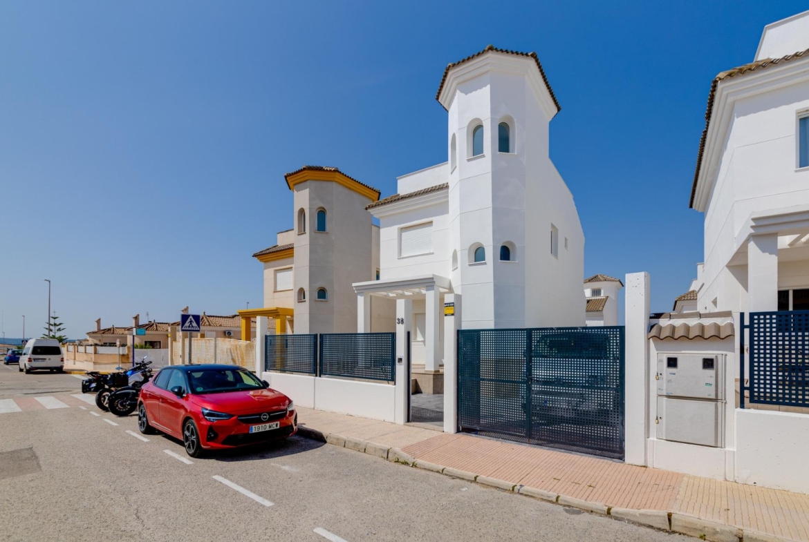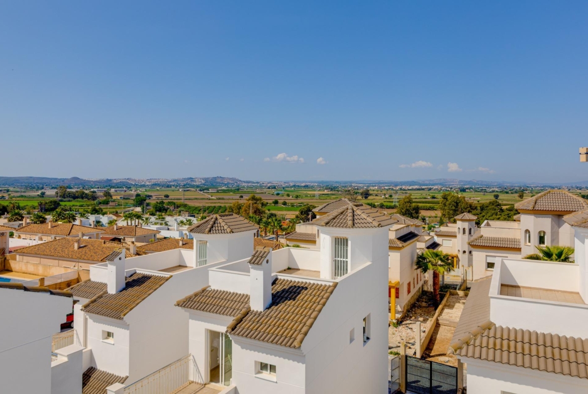 NEW BUILD RESIDENTIAL IN SAN FULGENCIO Residential complex of independent and semi-detached villas in San Fulgencio. The houses consist of 3 bedrooms, 3 bathrooms, living room and separate kitchen, 2 terraces on the ground floor, one terrace on the 2nd floor and a solarium on the roof. Each property has private garden and parking space. There is a large communal swimming pool. San Fulgencio is a comfortable and convenient area, known for its excellent infrastructure. In the immediate vicinity of cafes, restaurants, bars, pharmacies, 3 large supermarkets: Lidl, Aldi, Mercadona. Residential complex is located 10 minutes by car from the beach and also 10 minutes from the most famous in this area leisure and family center ¨La Marina Resort¨ with a water park, camping, gym, spa, restaurants, shops and cafes. Residential complex has a unique location – 30 minutes by car from the airport, 40 minutes from the city of Alicante and 20 minutes from the city of Torrevieja.