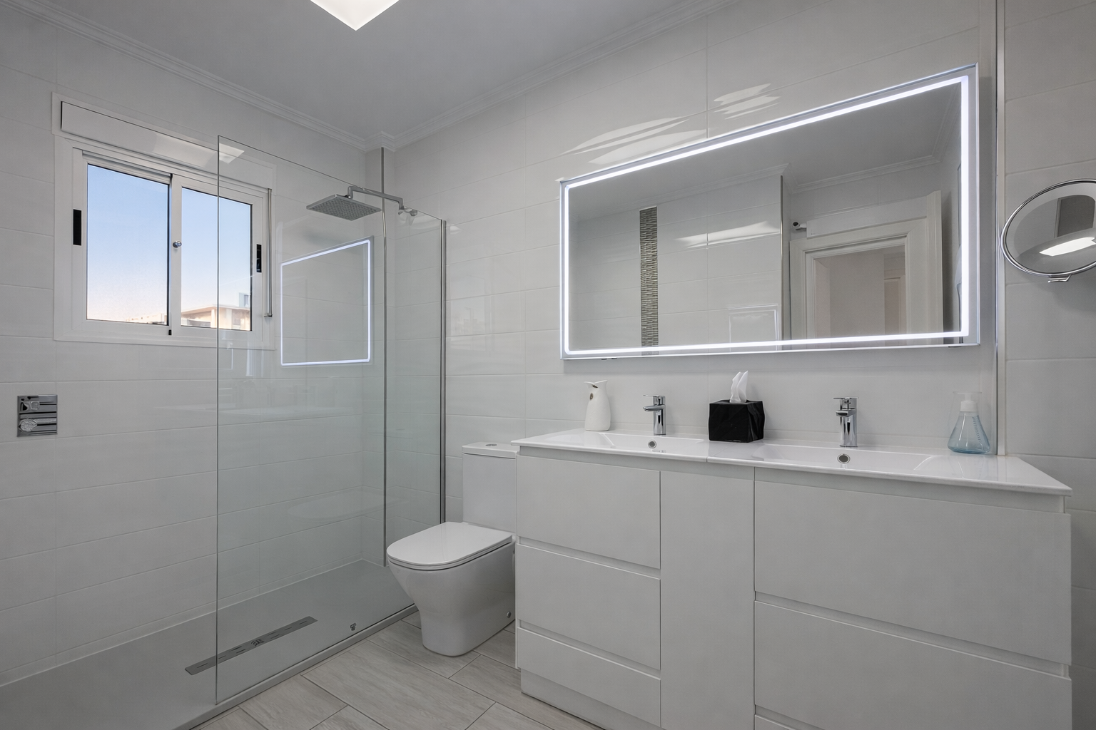 • A modern family bathroom with walk-in shower and double vanity
