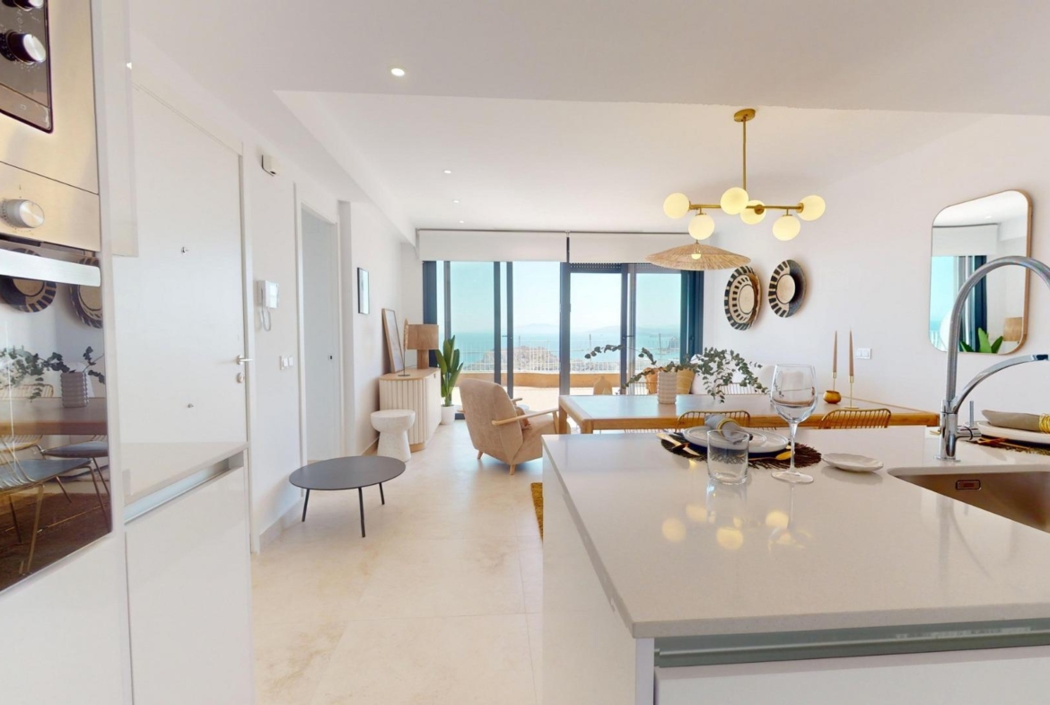THE TRANQUILITY OF THE SEA IN YOUR HOME !!! 1, 2 and 3 bedroom apartments, penthouses and duplexes with spectacular terraces. First line of the sea on a hill in front of the Isla del Fraile in Águilas. Its design and architecture is integrated into the beauty of the natural environment where it is found, respecting and enriching it. Thanks to their elevated location, the homes have been designed to make the most of natural light and to offer spectacular views of the Mediterranean Sea from their large terraces. The noble materials, the use of the morphology of the mountain and the large amount of vegetation achieve a perfect harmony between the homes and the natural environment where it is located. The residential is located in the Isla del Fraile Resort, which has sports areas, restaurants and private security. A few minutes away are commercial areas with a supermarket, restaurants, cinemas and all the services offered by the city of Águilas. The city of Águilas has 28 kilometers of coastline in which there are 35 beaches with different types of sand thickness located in different landscapes, from coves and virgin beaches in natural settings to the urban beaches of the town of Águilas. Its warm desert climate is present all year round with an annual average of 22º with mild temperatures in winter and very hot in summer. Águilas is a perfect enclave for diving, water sports, hiking and golf. 1049