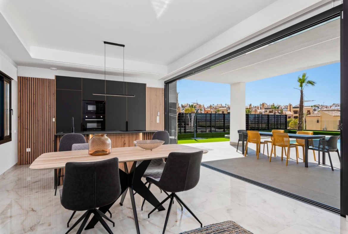 New Build Luxury Villas in La Finca Golf, Algorfa Exclusive One floor Villas next to the Golf La Finca in Costa Blanca South Discover this exclusive new build residential project of 11 independent villas located within the prestigious La Finca Golf Resort in Algorfa, one of the most sought after areas of the Vega Baja, Costa Blanca South. Surrounded by green landscapes, citrus groves and rolling fairways, this location offers tranquillity, privacy and a high quality Mediterranean lifestyle, while remaining close to all essential services and coastal attractions. Modern Single Level Villas with Private Pool and Solarium Each villa is thoughtfully designed on one level, offering comfort and functionality throughout. The properties feature 3 spacious bedrooms and 2 modern bathrooms, an open plan American style kitchen, and a bright living and dining area with large windows that open directly onto the terrace and private garden. Outdoors, each villa enjoys a private swimming pool, parking space within the plot, and an impressive 150 sqm private solarium, ideal for enjoying the sun all year round. For buyers seeking additional space, there is the option to add a basement or a fourth bedroom on an upper level at an extra cost, allowing you to tailor the home to your personal needs. High Quality Specifications and Elegant Finishes These villas are built with premium materials and finishes to ensure comfort, efficiency and modern style. Features include a reinforced security entrance door, motorized shutters, fully furnished kitchens equipped with appliances, and bathrooms complete with furniture, mirrors and shower screens. The rooftop solarium is delivered with a summer kitchen and pergola, creating the perfect setting for outdoor dining and relaxation. An interior and exterior LED lighting package is also included, enhancing both design and ambience. Prime Location in La Finca Golf Resort La Finca Golf Resort is renowned for its championship golf course, luxury hotel, spa facilities, restaurants and sports areas, all set within a secure and well maintained environment. Algorfa is a charming Spanish village offering a relaxed atmosphere, local shops and traditional restaurants, while nearby towns provide a wider range of services. Key Distances La Finca Golf Club: on site Guardamar del Segura beaches: 15 km Torrevieja and Orihuela Costa shopping centres: 15 km Almoradi, Benijofar and Ciudad Quesada: 5 to 10 km Alicante International Airport: 35 km Mediterranean Lifestyle and Smart Investment With over 300 days of sunshine per year, excellent road connections and proximity to beaches, golf courses and commercial areas, these villas are ideal as a permanent residence, holiday home or investment opportunity on the Costa Blanca. Secure Your New Villa in La Finca Golf Today Do not miss the opportunity to own a modern villa in one of the most exclusive golf resorts in Algorfa. Contact us today for more information or to arrange a private viewing.