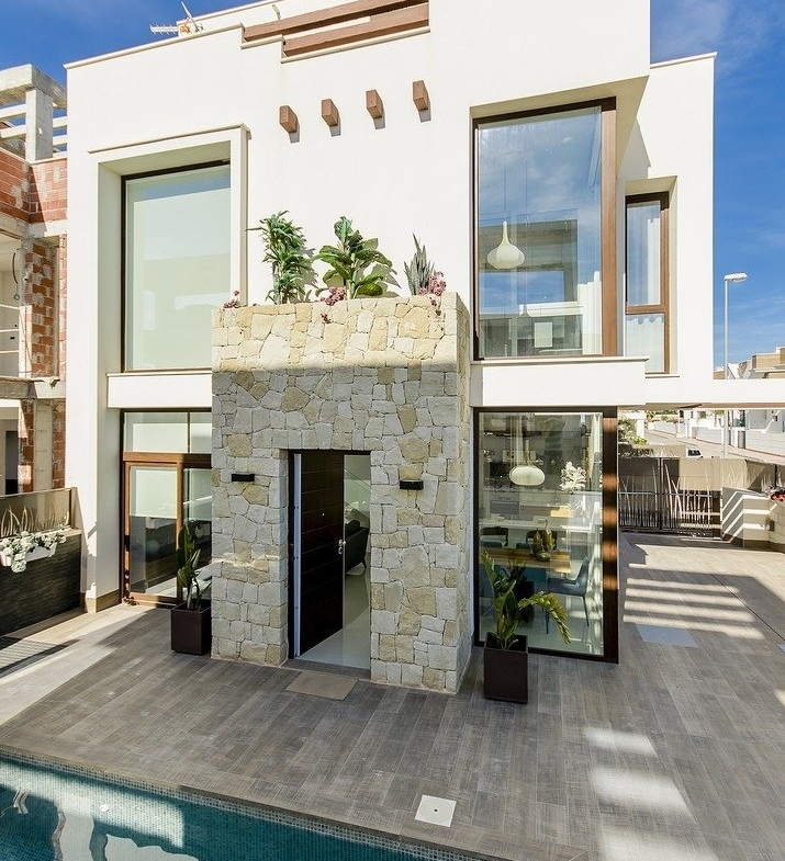 NEW BUILD RESIDENTIAL OF VILLAS IN LOS MONTESINOS New Build villas with 3 bedrooms and 3 bathrooms, open plan kitchen with living room-dining room. All villas have a terrace, a private swimming pool, a private garden, and a driveway. Basements are also available at an extra cost. They are all built with high-quality materials using advanced technology for our clients’ comfort and convenience. The typical town of Los Montesinos is strategically located 10 minutes by car from the beaches and leisure of Torrevieja (with all the services of a big city: theatre, 2 hospitals, international schools, etc.), from several golf courses and with easy access to the A7 motorway to reach Alicante airport in 20 min. In the urbanization there are supermarkets and bars for day-to-day service, being a rural and quiet environment. The climate in this area guarantees 300 days of sunshine a year with an average temperature of 20ºC, which, together with the rich gastronomy and cultural and sports activities available in its surroundings, makes this area an ideal place to establish a second residence for vacation or a quiet place to live permanently. 1049