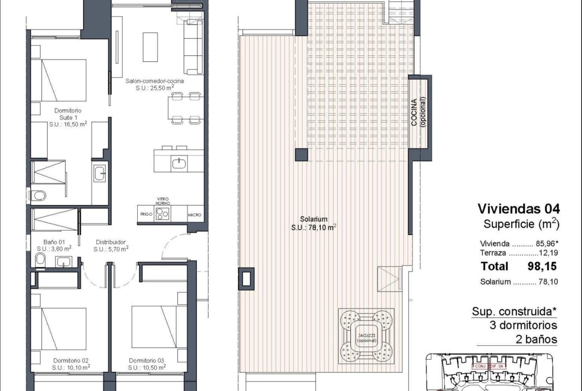 Exclusive New Build Properties in Lo Marabú, Ciudad Quesada Modern Design and Maximum Comfort in a Mediterranean Setting Discover this spectacular residential complex in Lo Marabú, Ciudad Quesada, comprising 80 2 and 3 bedroom homes with 2 bathrooms. Designed with a modern and efficient approach, these properties offer spacious terraces, cross ventilation and high quality finishes to maximise comfort and energy efficiency. The ground floor properties have private gardens, while the top floor properties have private solariums with pre-installation for a Jacuzzi and outdoor shower. In addition, the development has communal swimming pools surrounded by gardens, creating a perfect environment for relaxation and conviviality. High Quality Features for an Exclusive Lifestyle Each home has been designed to offer maximum comfort, with top quality materials and a contemporary design: Large sliding aluminium windows with thermal break. Motorised blinds for greater comfort. Climalit 4+4/14/4/4+4 glazing for thermal and acoustic insulation. Armoured front door with security lock. Fully fitted kitchens with electrical appliances included. Bathrooms with furniture, mirrors and shower screens. 150L aerothermal system for hot water. Complete installation of ducted air conditioning (hot/cold). Lighting in all rooms already incorporated. Parking space included. Thanks to its double façade design, the homes offer natural cross ventilation, providing coolness in summer and reducing energy consumption in air conditioning. Privileged location in Ciudad Quesada Lo Marabú is an exclusive residential area within Ciudad Quesada (Rojales), surrounded by natural spaces and with all services within easy reach. The urbanization is very close to the salt lakes of La Mata and Torrevieja, an ideal environment to enjoy nature and improve your wellbeing. From your new home, you will have quick access to the main points of interest in the area: Guardamar del Segura and Torrevieja beaches – 10 km (15 minutes by car). Alicante-Elche Airport (ALC) – 38 km (35 minutes by car). Murcia-Corvera Airport (RMU) – 65 km (50 minutes drive). Prestigious golf courses – Less than 5 km. Shopping centres and restaurants – Just a few minutes away. Quick access to the AP-7 and N-332 highways, connecting to the whole of the Costa Blanca. A Perfect Home for Enjoying the Mediterranean With their combination of modern design, strategic location and exceptional natural surroundings, these homes in Lo Marabu are ideal for permanent residence, holiday home or investment property. Don’t miss out on this unique opportunity. Contact us today for more information or to arrange a viewing of your future home in Ciudad Quesada.