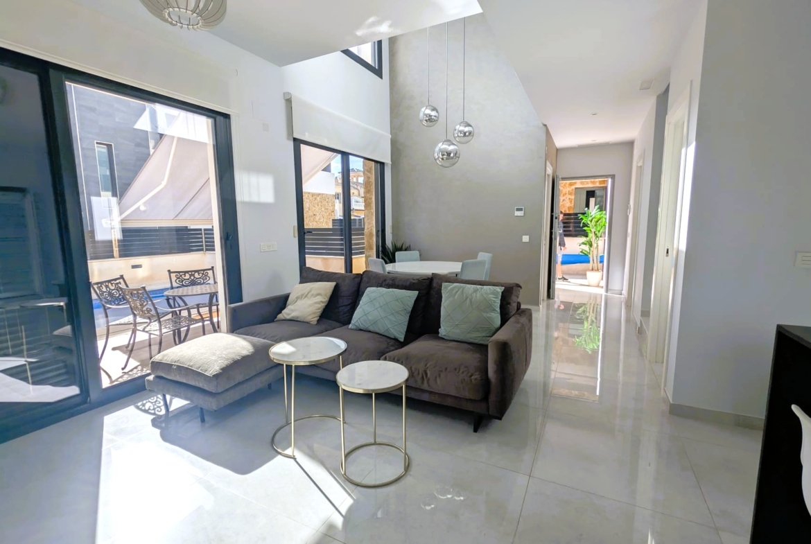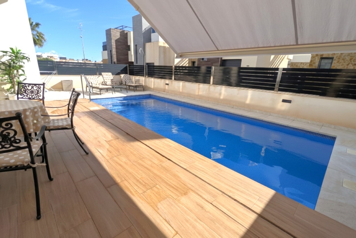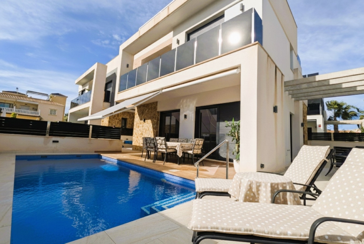 Amanecer Luxury Villa 4 beds 4 baths for sale in Lomas de Cabo Roig with private pool, underbuild and roof top solarium with sea views.Located within this secure gated complex close to the commercial centre for amenities and the bus for the blue flag beaches of Orihuela Costa.