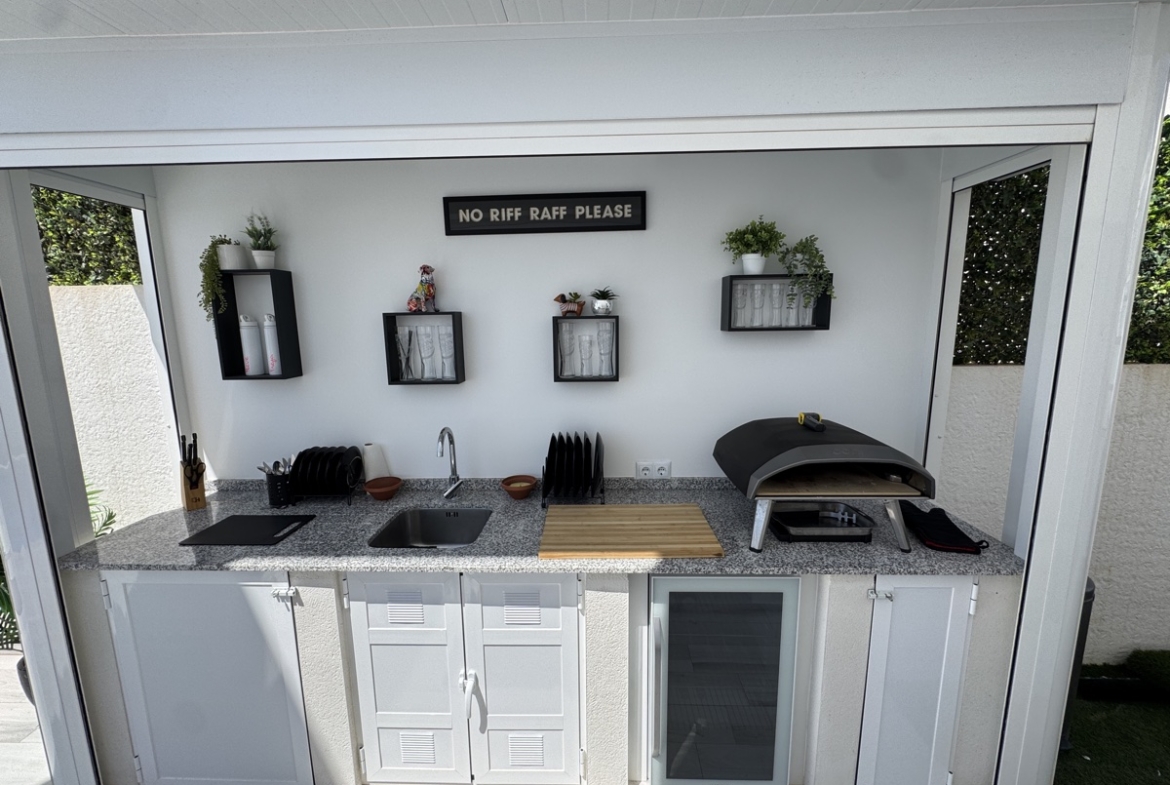 This Private Oasis allows you to enjoy relaxing afternoons around the the private pool or soaking up the sun on the sun loungers. A custom built outdoor kitchen allows you to host barbecues and gatherings in the wonderful garden.