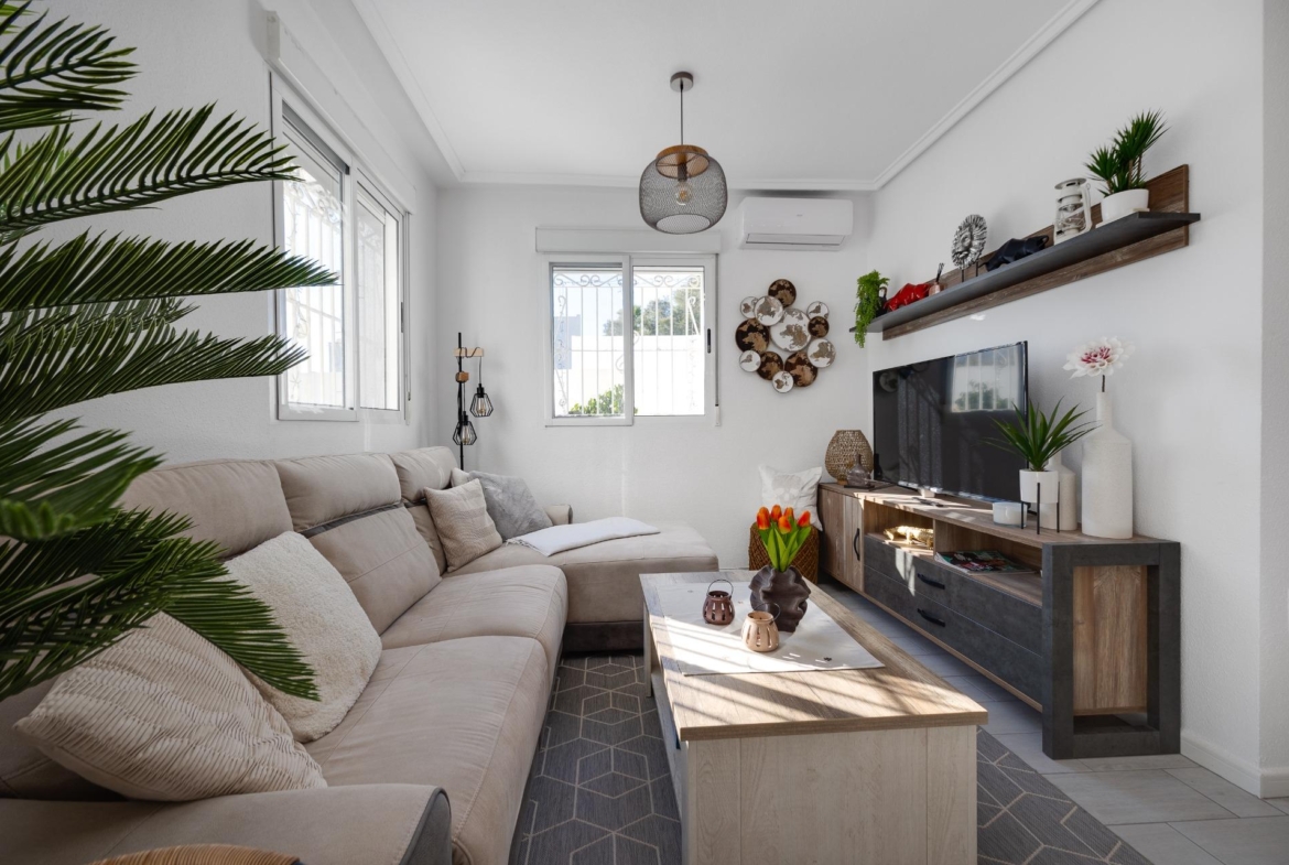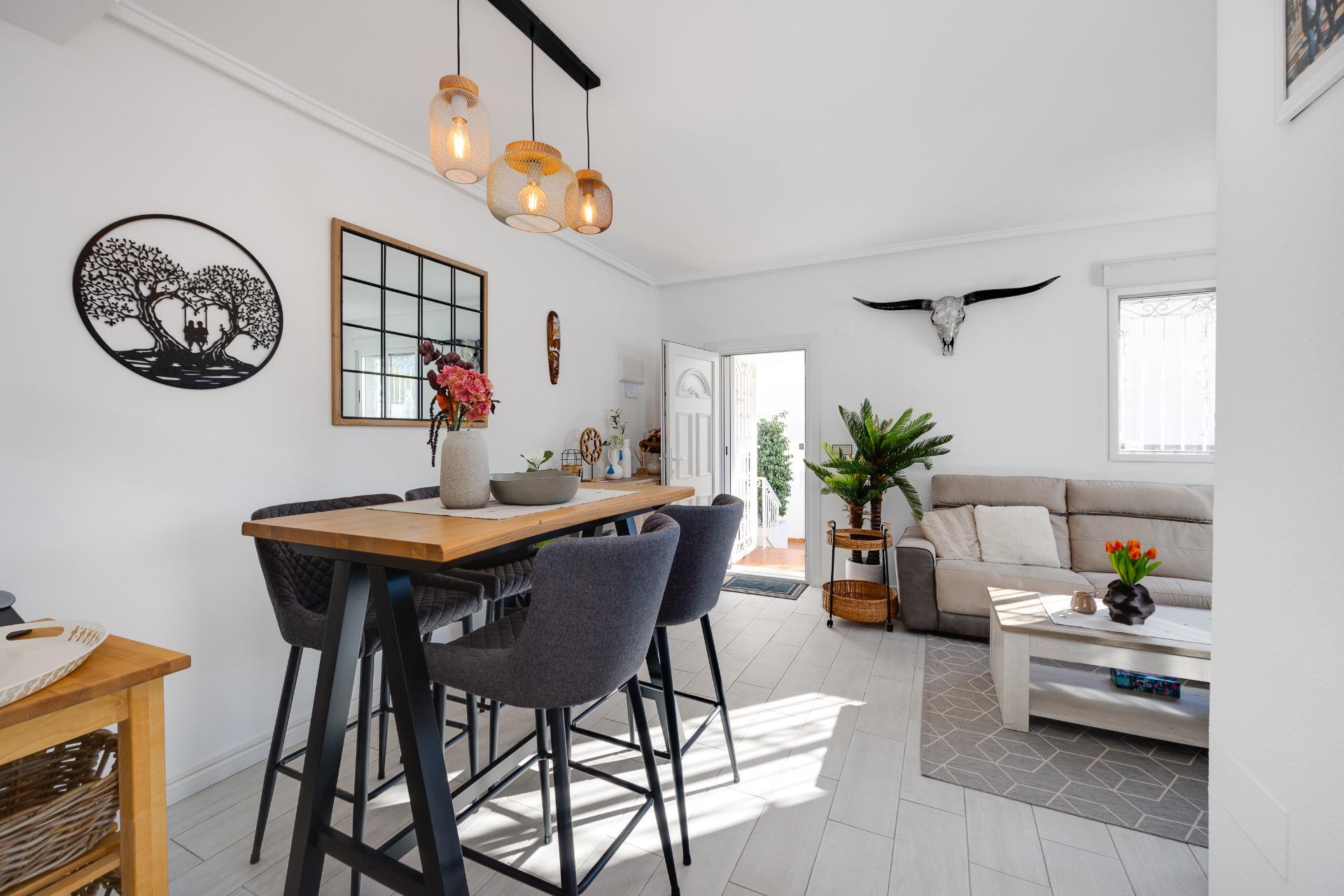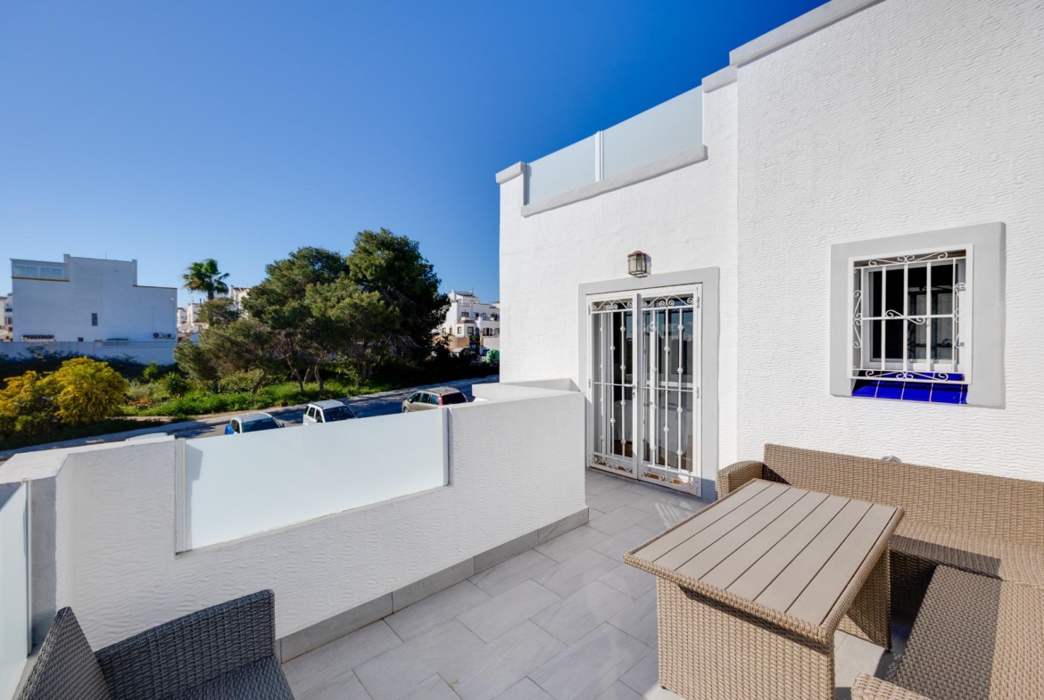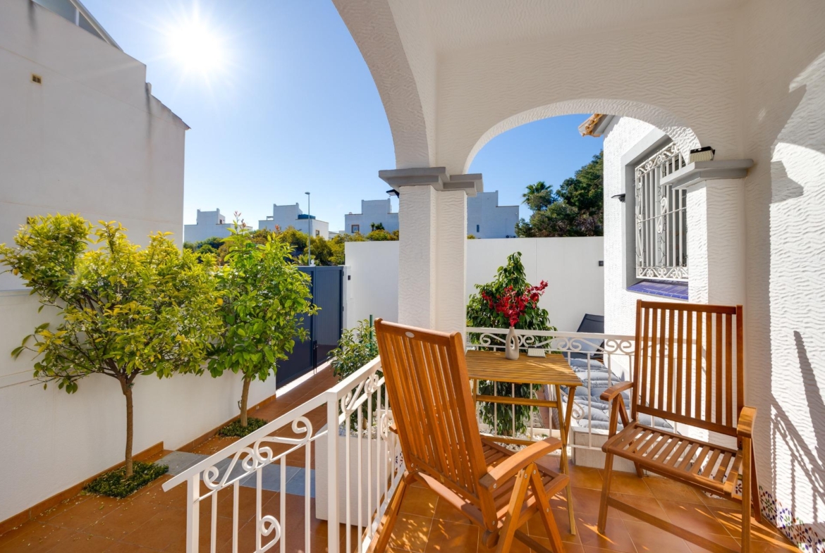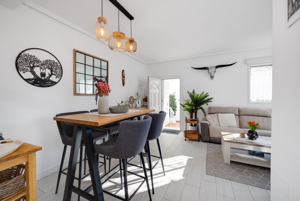 We present to you this stunning quad-style townhouse located in the desirable Dream Hills community of Los Altos. This beautifully furnished property features three spacious bedrooms ๐Ÿ›๏ธ and two modern bathrooms ๐Ÿšฟ, making it perfect for families or those seeking a holiday retreat. Enjoy plenty of sunshine in your expansive garden ๐ŸŒป, which includes a lovely porch area and an entrance suitable for vehicle parking ๐Ÿš—. You will also appreciate the convenience of having private laundry facilities ๐Ÿงบ and ample storage space with a dedicated storeroom.~~On the first floor, you’ll find another large terrace ideal for relaxation โ˜•๐Ÿชด as well as access to your own private solarium showcasing breathtaking unobstructed views ๐ŸŒ…! The location is just 300 meters from communal swimming pools๐ŸŠโ€โ™‚๏ธ surrounded by lush green areas ๐Ÿƒand free padel courts available exclusively for residents ๐ŸŽพ.~~Private numbered resident parking ensures ease when returning home after exploring all that nearby Torrevieja (10 minutes away) has to offer ๐Ÿ˜Š. La Zenia beach is also within easy reachโ€”just like other beautiful beaches within ten minutes’ drive โฑ๏ธ๐Ÿš™!~~Donโ€™t miss out on this exceptional opportunity ; make it yours today!~