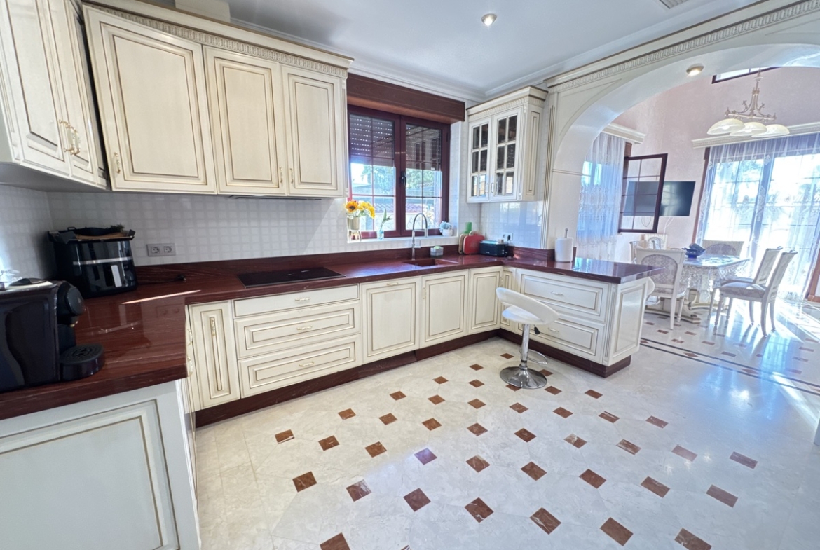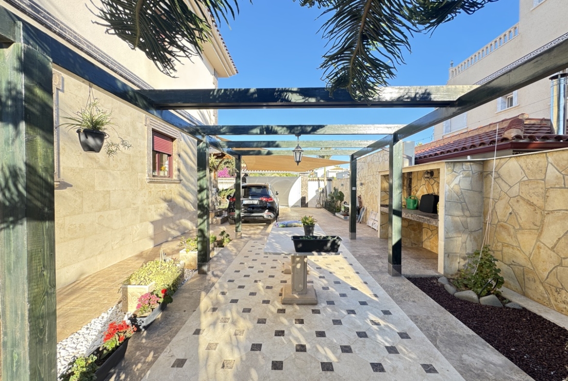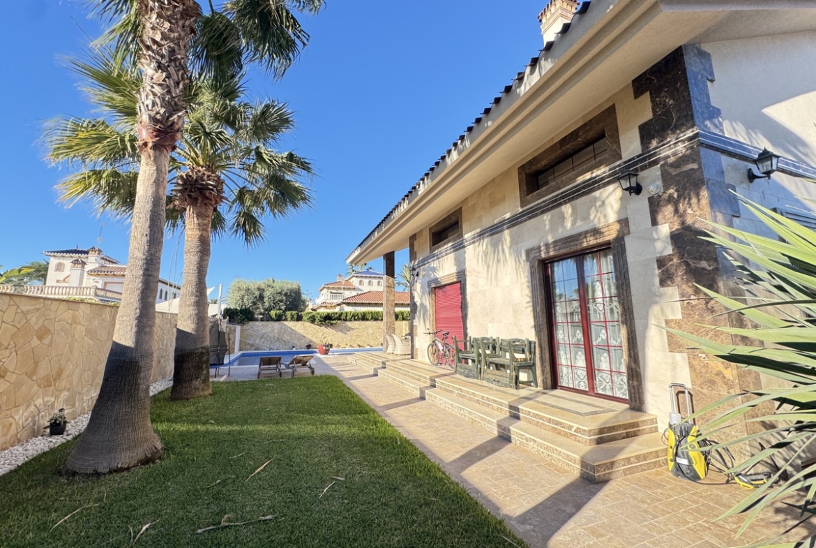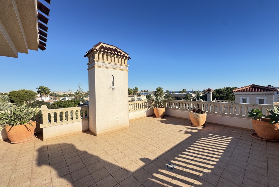 Discover this stunning luxury villa, perfectly situated on a 765m2 plot in the sought-after location in beachside of Cabo Roig. This impressive property boasts 455m2 of living space, elegantly distributed over three floors, offering breath taking views and unparalleled comfort. Key Features: – Spacious mature garden with private pool and parking for 2 cars – Large lounge with double-height ceiling and central fireplace – Open-plan kitchen with ample space for entertaining – Master bedroom on the ground floor with en-suite bathroom and walk-in wardrobe – Internal balcony overlooking the lounge area, perfect for relaxation – 3 additional bedrooms, each with en-suite bathrooms – Basement features: – Gym with Jacuzzi and sauna – Spacious function/games/cinema room – Bodega and boiler room Ideal for: – Families seeking a luxurious and spacious home – Entertainers looking for a property that impresses – Those seeking a tranquil retreat with top-notch amenities Location: – Cabo Roig, Orihuela Costa, with easy access to local amenities, beaches, and golf courses This luxury villa is a true gem, offering the perfect blend of style, comfort, and entertainment. Schedule a viewing today!