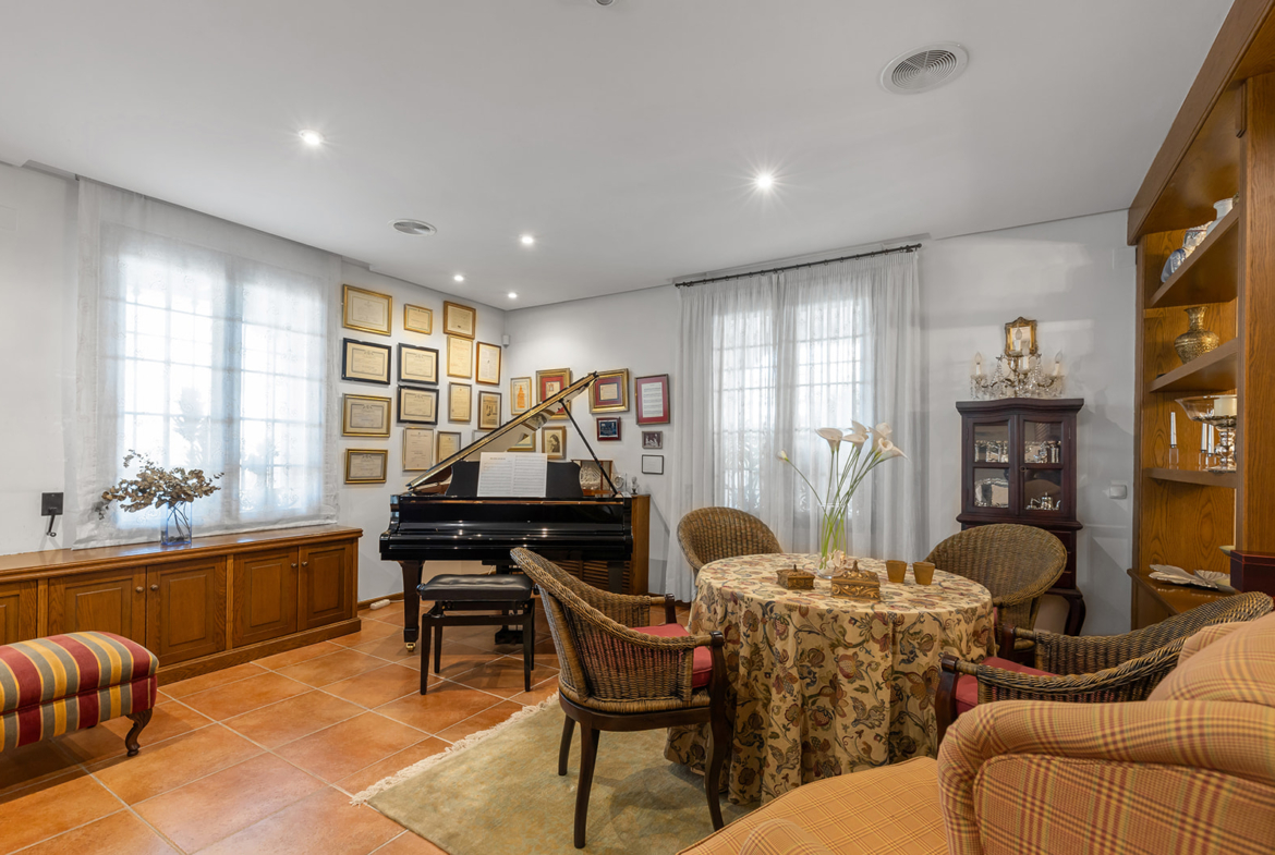 On the main floor, the villa features a spacious living room with a fireplace, sitting and dining areas, an elegant music room, and a fully equipped kitchen with solid wood cabinetry and granite countertops. The interior is characterized by its brightness, handcrafted ceramic floors, and wrought iron details.