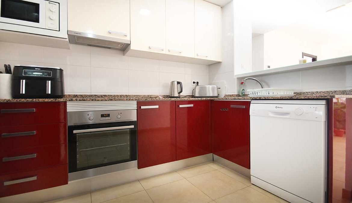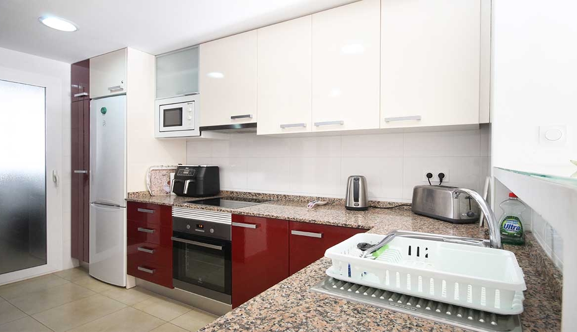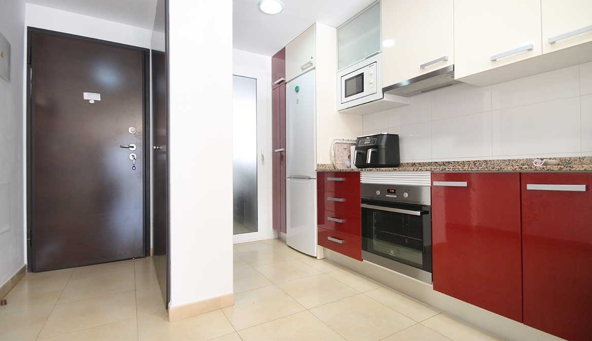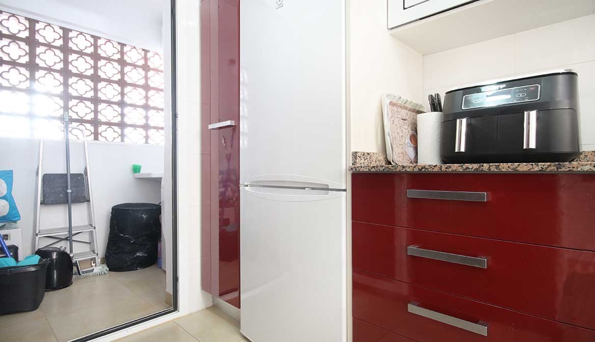 Then into the spacious open plan kitchen and lounge area. The two are separated by a breakfast bar. The kitchen is fully fitted with all the appliances you need and there is extra storage in the “galería” store room to the rear.