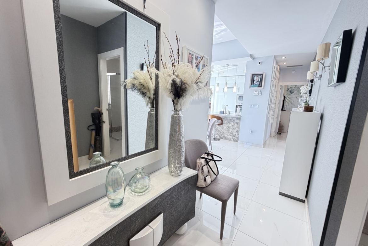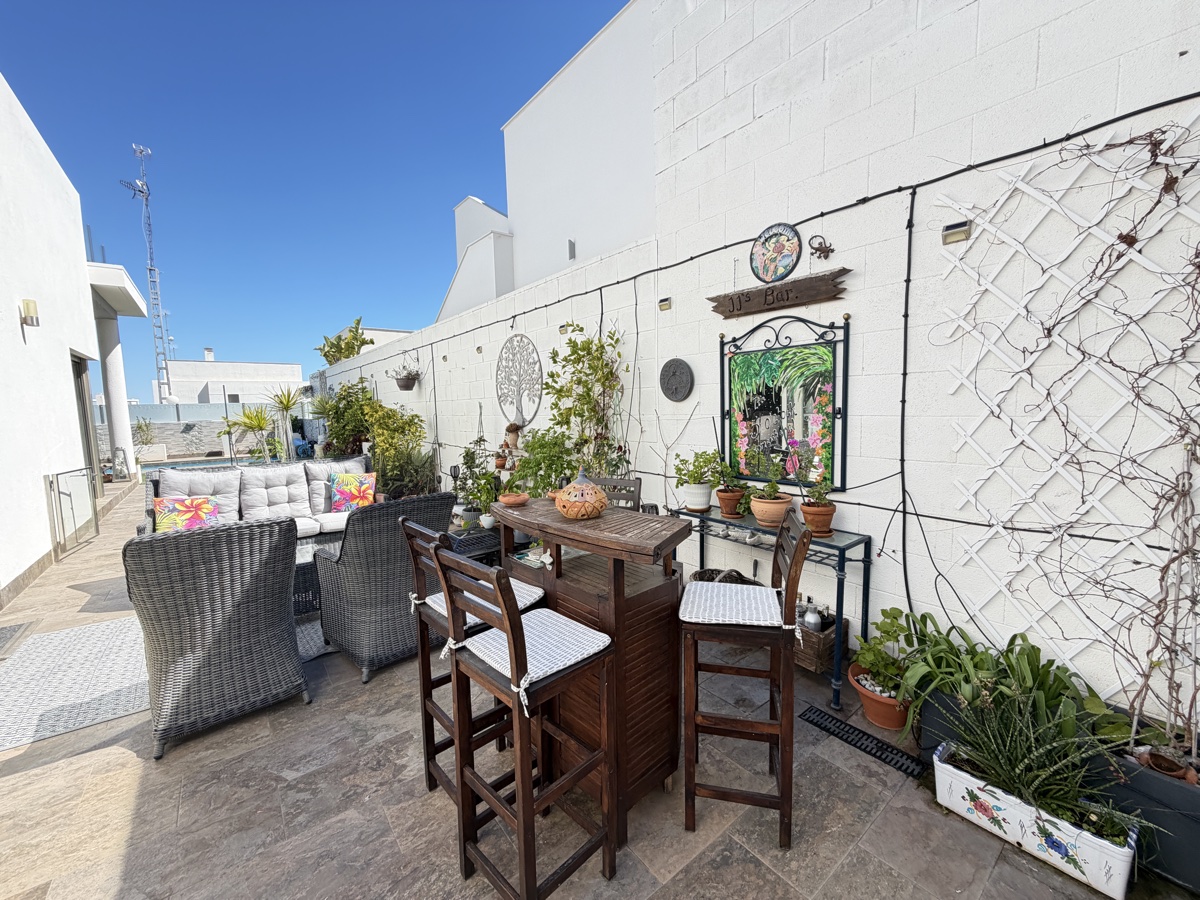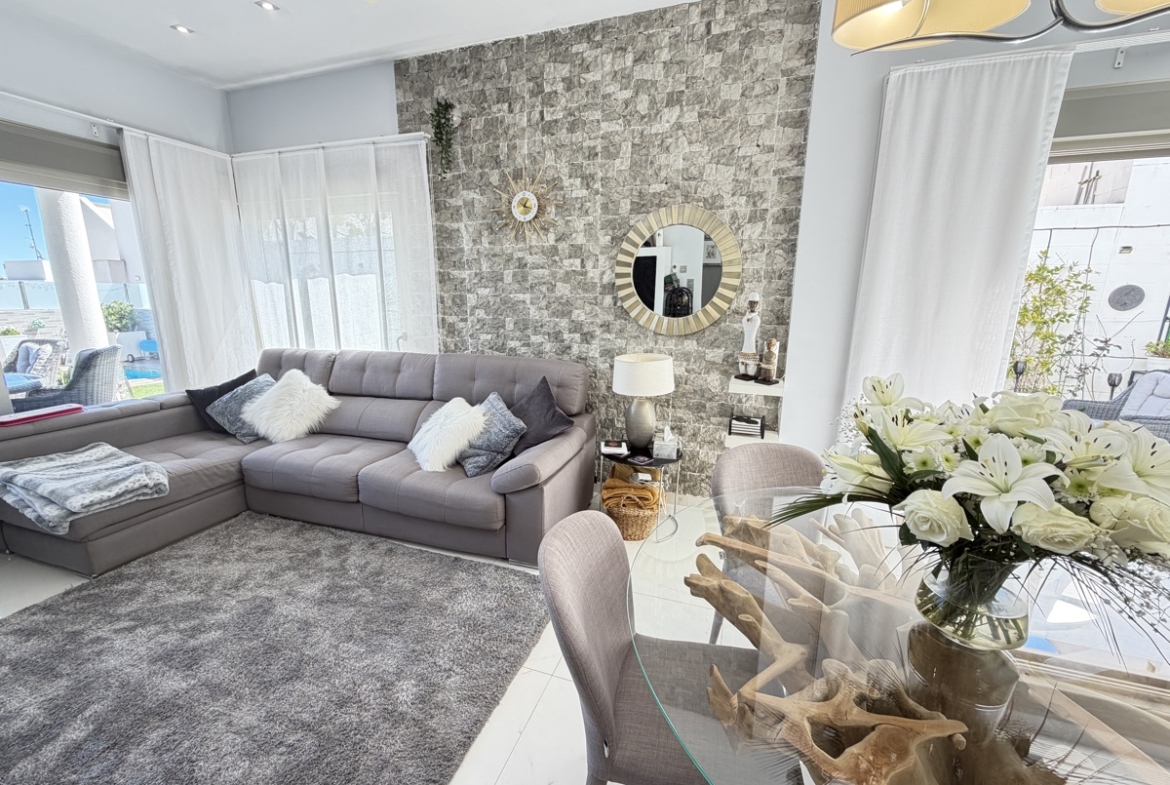 Stunning 3-Bedroom Single-Storey Villa in Pau 26, Villamartin This splendid three-bedroom, single-storey villa is ideally situated in the sought-after Pau 26 area of Villamartin. Positioned on a desirable corner plot along a private road, the property offers both privacy and generous outdoor living space. The exterior boasts a spacious garden with multiple seating areas, a private swimming pool, and off-road parking. A standout feature is the expansive rooftop solarium, complete with a jacuzzi and outdoor kitchen—perfect for entertaining while enjoying panoramic views of the surrounding area. Inside, the villa features a bright and modern open-plan living space with a large, well-appointed kitchen. There are three generously sized double bedrooms, including a master bedroom with en-suite bathroom, as well as a separate, spacious family bathroom. Offered unfurnished, this property is ready for immediate occupancy—making it an ideal choice for a permanent residence, holiday home, or investment opportunity.