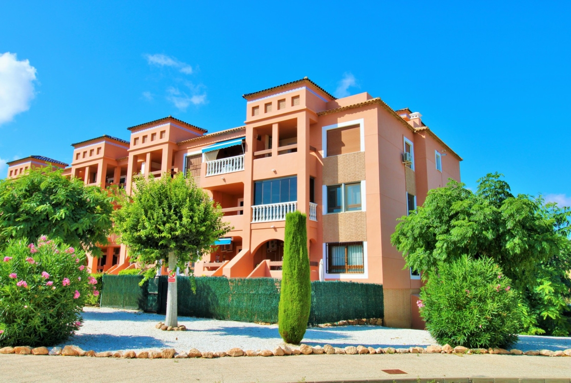 Set within a secure gated community, the apartment features a bright open-plan living and dining area that flows onto a glazed terrace, ideal for enjoying the space all year round. The interior is finished to a high standard, including marble flooring, integrated wardrobes, and air conditioning throughout, making the property ready to move into.