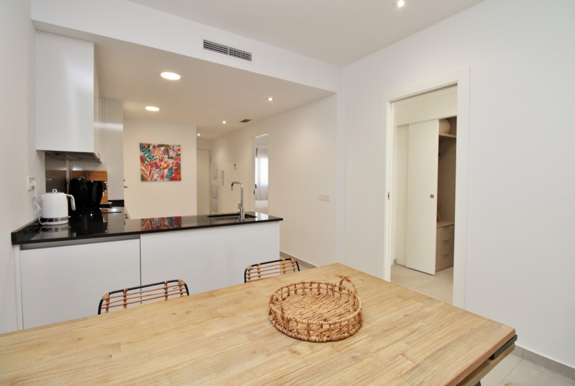 Inside, the home benefits from a bright open-plan layout. The modern kitchen is equipped with sleek cabinetry, integrated appliances, an induction hob, and built-in microwave and oven. Adjacent to the kitchen is a guest shower room and a double bedroom with fitted wardrobes. A dedicated dining area leads through to the spacious master suite, which includes its own private shower room, a lockable dressing area, and direct access to the terrace and pool via sliding doors.