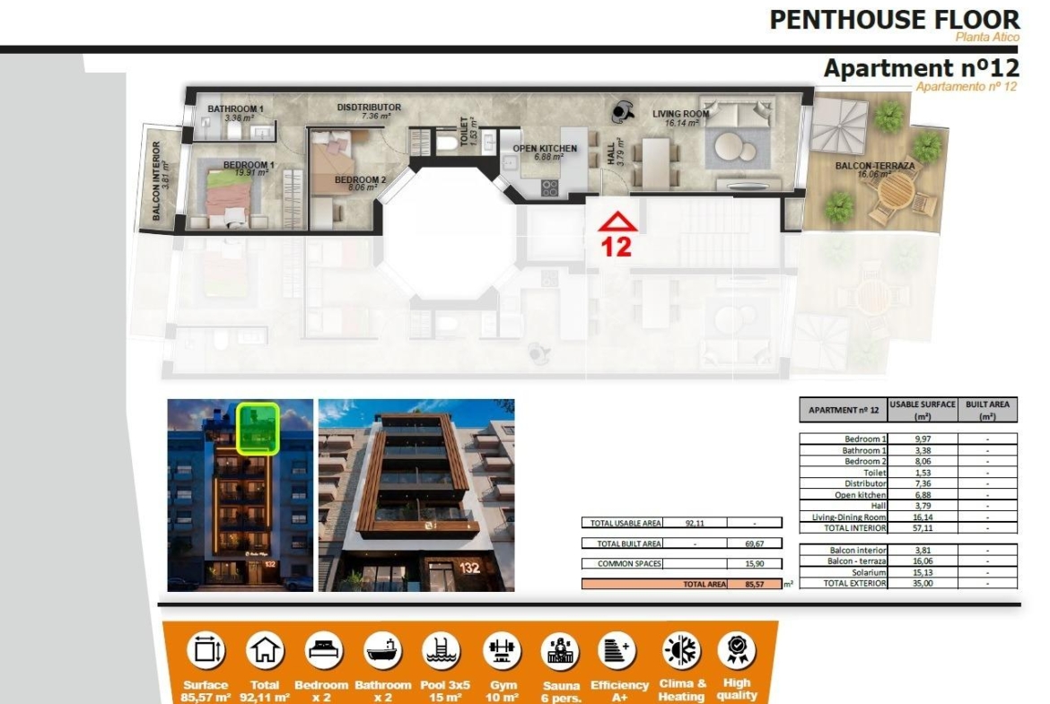Modern Apartments Just 250m from Playa del Cura in Torrevieja Exclusive New Development in the Heart of Torrevieja This exclusive residential project of 12 modern apartments is located just 250 meters from Playa del Cura, one of the most popular beaches in Torrevieja. Designed with a perfect balance of elegance, functionality, and Mediterranean lifestyle, the building offers a variety of layouts with 1 or 2 bedrooms, including apartments with terraces and penthouses with private solariums. Its central location provides easy access to shops, restaurants, leisure areas, and all essential services, while still maintaining a sense of comfort and tranquility. Premium Amenities for a Modern Lifestyle The development includes 130 m² of communal areas designed for relaxation and entertainment. Residents can enjoy: Swimming pool on the ground floor with a children’s area Gym and sauna Rooftop solarium with chill-out areas and lush vegetation Every apartment is built with high-quality materials and finishes, ensuring both comfort and durability. Features include: Fully furnished bathrooms with shower screens Pre-installation of ducted air conditioning High-quality PVC exterior carpentry with solar control glass Reinforced security entrance door The Vibrant Life of Torrevieja Torrevieja is a lively coastal city on the Costa Blanca, renowned for its year-round cultural and recreational activities. With over 300 days of sunshine annually and a mild Mediterranean climate, the area is ideal for beach lovers, outdoor enthusiasts, and those seeking a vibrant lifestyle. The city also offers a wide range of services, international cuisine, marinas, and a lively promenade. Prime Location with Excellent Connectivity The development is strategically located with easy access to key points of interest: Alicante Airport: 45 km Golf Courses: 7–10 km Zenia Boulevard Shopping Center: 8 km Torrevieja Marina and Port: 2 km Your Perfect Home by the Sea Whether you are looking for a permanent residence, a holiday home, or a property with rental potential, these modern apartments in Torrevieja offer an excellent opportunity to invest in the Costa Blanca lifestyle. Contact us today to arrange a visit and secure your modern apartment just steps from Playa del Cura.