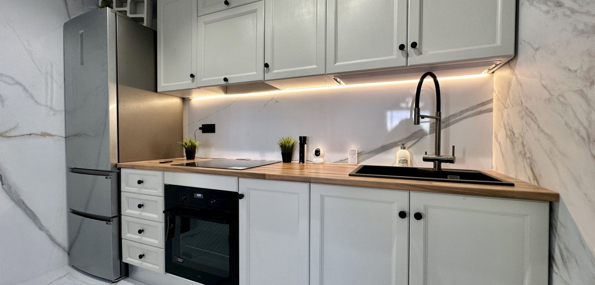Inside, the home consists of 1 bedroom, a contemporary bathroom with walk-in shower, and a cozy living space that flows to a 6.5 m² balcony. High–quality finishes include LG and Samsung appliances, inverter air conditioning, 55” AI smart TV, washer–dryer, underfloor heating, smoke detectors, and Wi-Fi video surveillance.