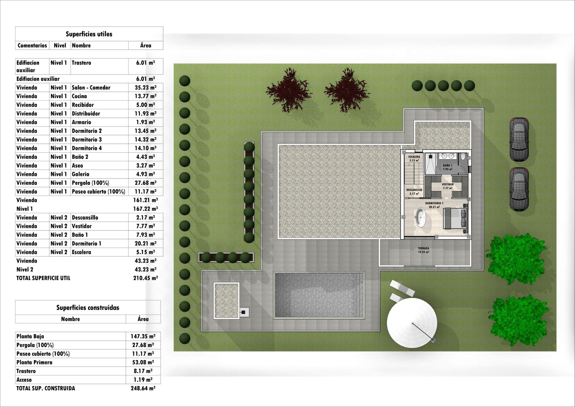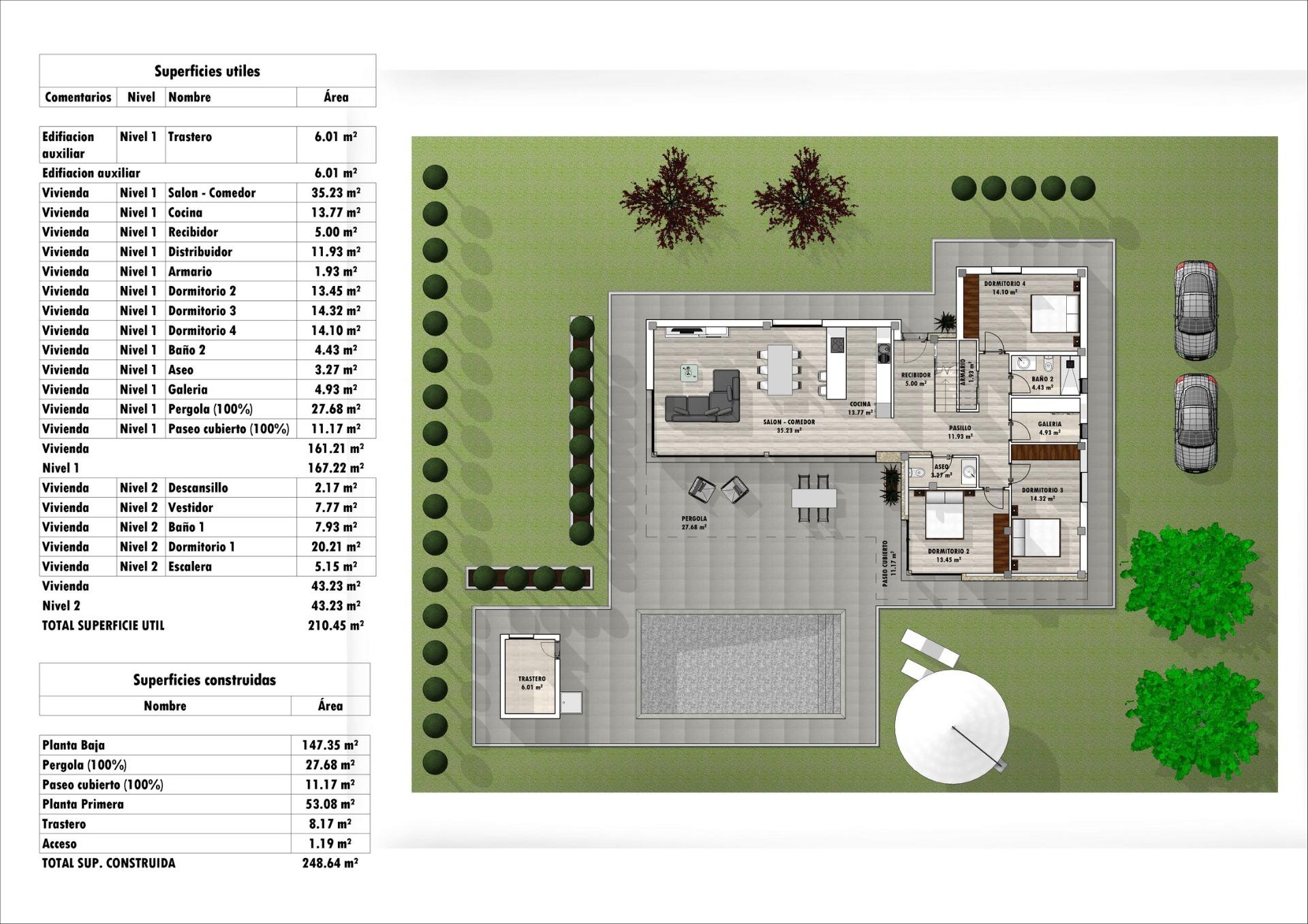 Newly built villas located in the municipality of Aspe. Newly built villas with several models to choose from, with 2, 3 or 4 bedrooms, on one or two floors and built with slabs or with a structure: depending on the model and the plot chosen, the exact price will be calculated. All the villas are built on rustic plots of over 10,000 m2, of which around 2,500 m2 will be fenced off. The villas have an open-plan kitchen with living room, built-in wardrobes, private swimming pool, porch, storage room and outdoor parking space. There are several plots to choose from. The price is based on a plot priced at €75,000 (if another plot is chosen, the difference will be paid or credited according to the price of the plot). Self-build project, delivery in approximately 12 months from the granting of the licence. If you are looking for a quiet environment, close to typical Spanish villages away from tourist crowds, surrounded by mountains, with a very large plot and about 30 minutes from the sea, this is your home. Aspe is a typical Spanish village with all the amenities for everyday life, surrounded by mountains and with several natural areas nearby where you can go hiking or mountain biking. Located 25 km from the beach, 9 km from Elche and about 20 km from Alicante airport.