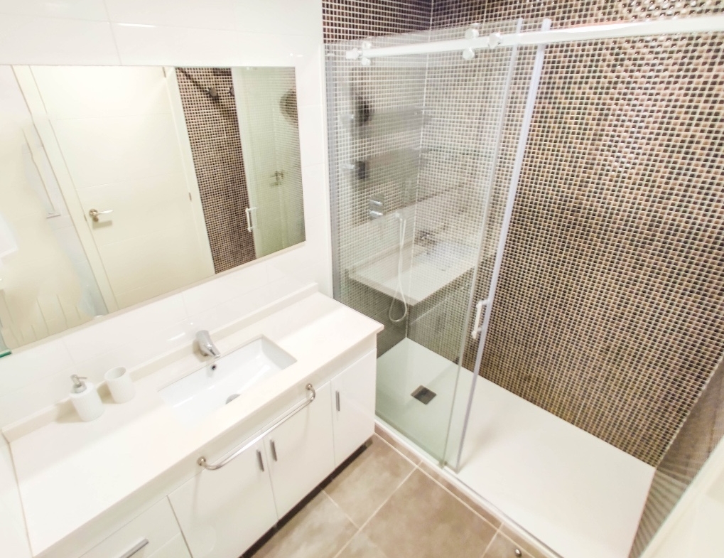 The modern galley-style kitchen is fully equipped with dishwasher, oven, microwave, coffee machine and leads to a utility room equipped with washing machine and tumble drier.The spacious master bedroom benefits from wonderful sea views, large fitted wardrobes. The en-suite bathroom includes a large walk-in shower. Another bedroom benefits large fitted wardrobes.The family bathroom consists of a large walk in shower, lavatory and wash hand basin with separate storage unit.The ultra modern communal area includes three infinity pools – one heated for all year round use, four Jacuzzis, Finnish and Turkish saunas, gymnasium, Bali beds, pool bar and chill out area offering food and drinks, pool Jacuzzi’s, children’s play area with water fountains, children’s paddling pool, play house, football and padel tennis courts.