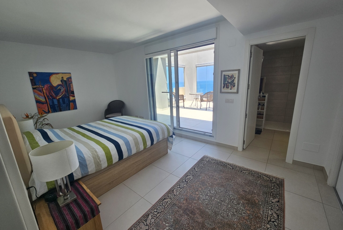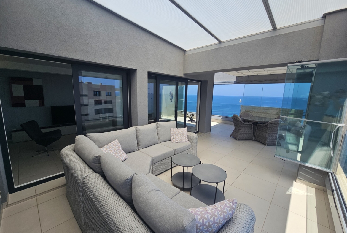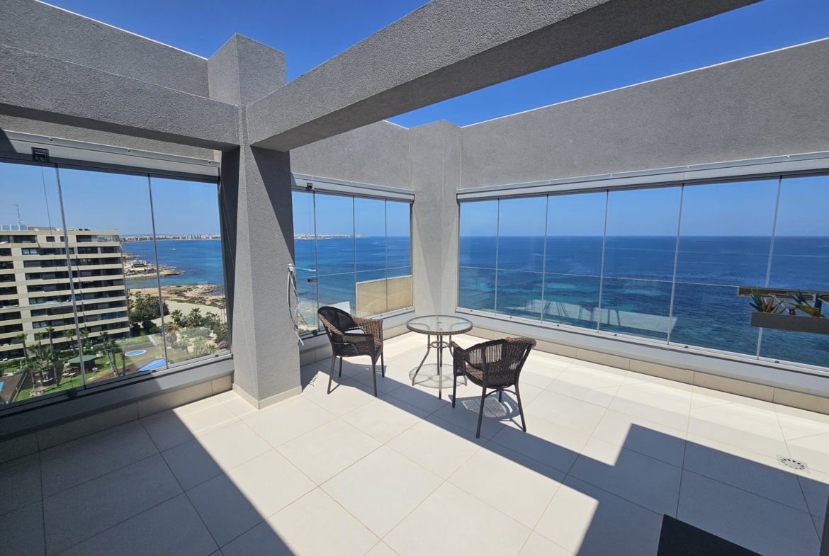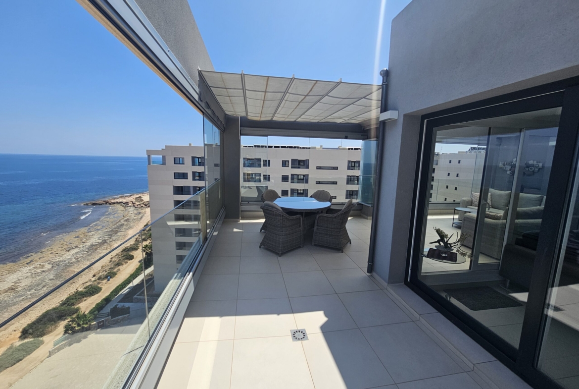 For sale an exceptional luxury penthouse on the beachfront with 3 bedrooms and 2 bathrooms and magnificent panoramic views of the Mediterranean Sea located in Punta Prima (Alicante) in the exclusive Panorama Mar residence, within a complex that offers excellent facilities next to the beach and the promenade, and close to all services. It is the last penthouse for sale with these views.