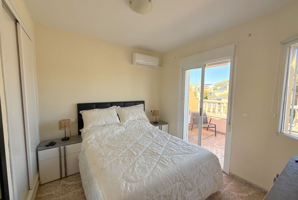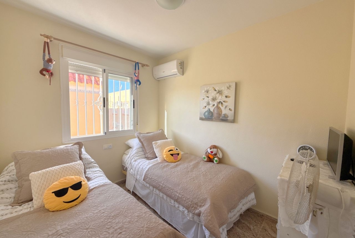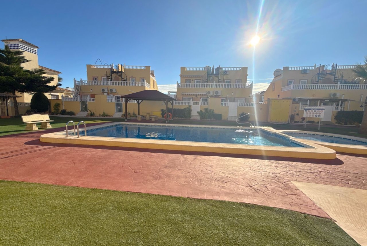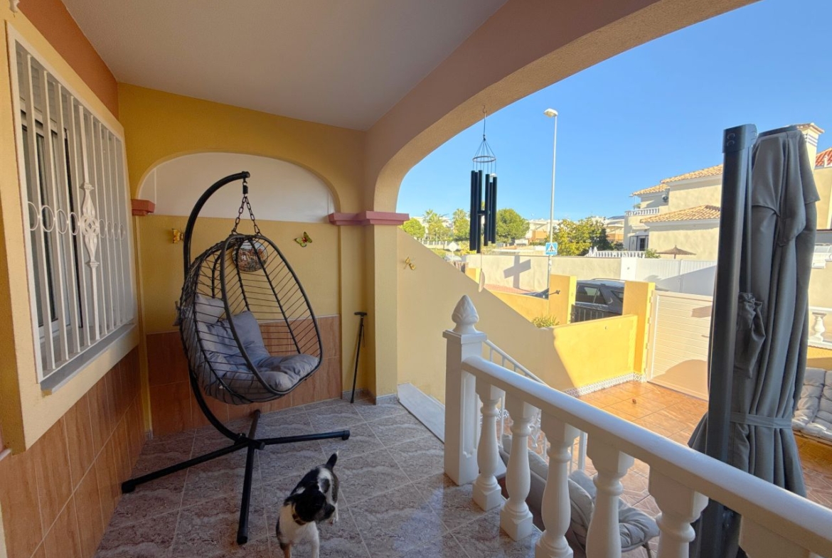 This is an amazing townhouse set in the beautiful Colinas De La Zenia complex which is a 5 minute walk to the Zenia Boulevard and about a 15 minute walk to the La Zenia blue flag award winning beach. The property has recently been renovated with a new kitchen and a 2 new bathrooms fitted, the property has had a raised wall built for more privacy on the front of the garden and has a lovely sitting area and also a terrace just before entrance to the front of the lounge, the owners have also fitted a shower room downstairs and the lounge is a nice size and has enough room for a dining table and chairs and has an American style kitchen, the lounge also has new ac unit which is hot and cold, to the rear of this property there is a small court yard with lots of storage space including a home for the washing machine and room for storing bikes and few other bits n bobs, also you have the benefit of direct access to two lovey community pools. The upper level has a recently fitted bathroom with walk in shower and 2 double bedrooms both with newly fitted ac units and the main bedroom has a really good sized balcony off it. This property is in the perfect location as all amenities are on your doorstep literally. So don’t miss out on this unique opportunity, book your viewing asap before its to late.