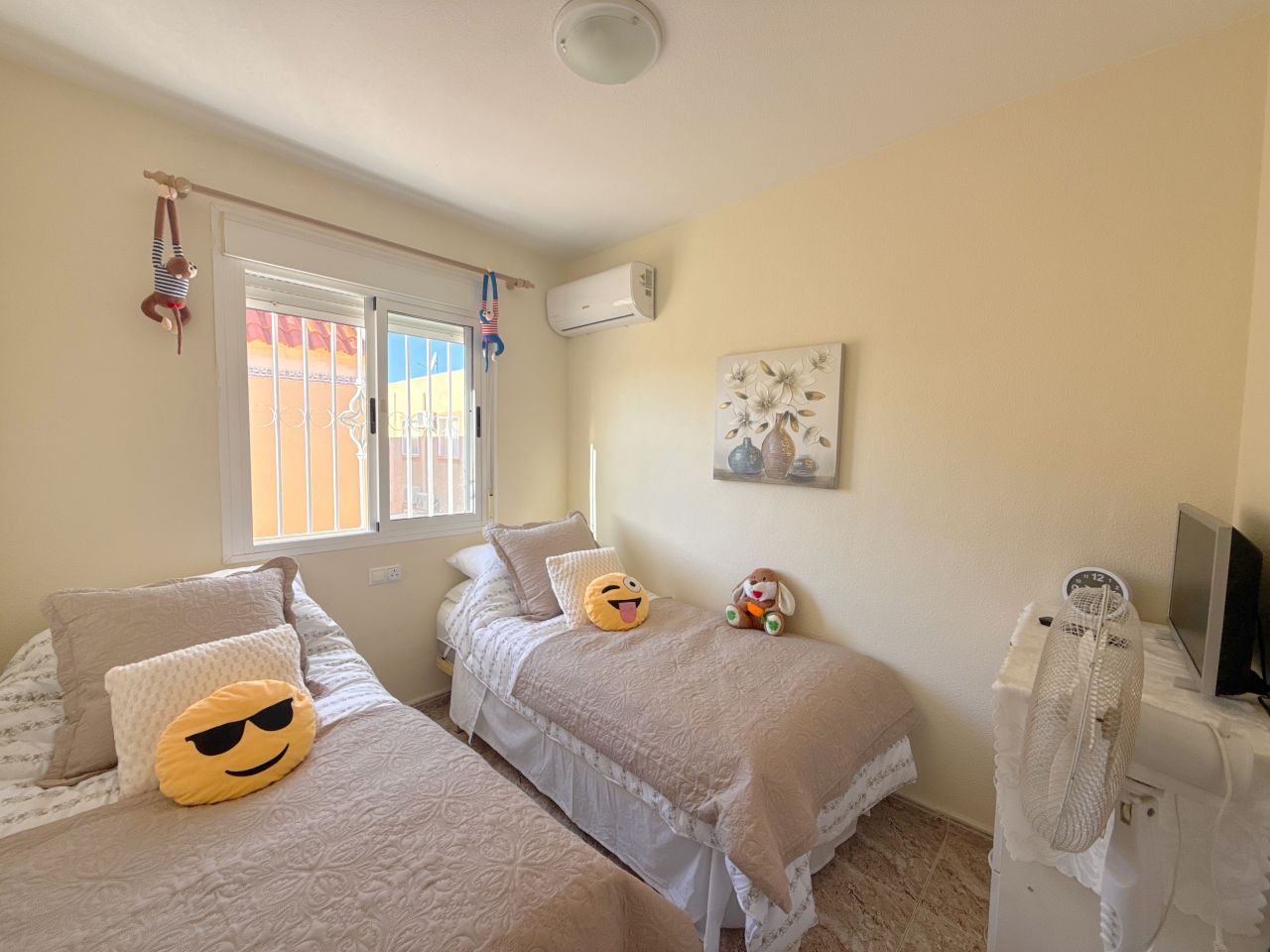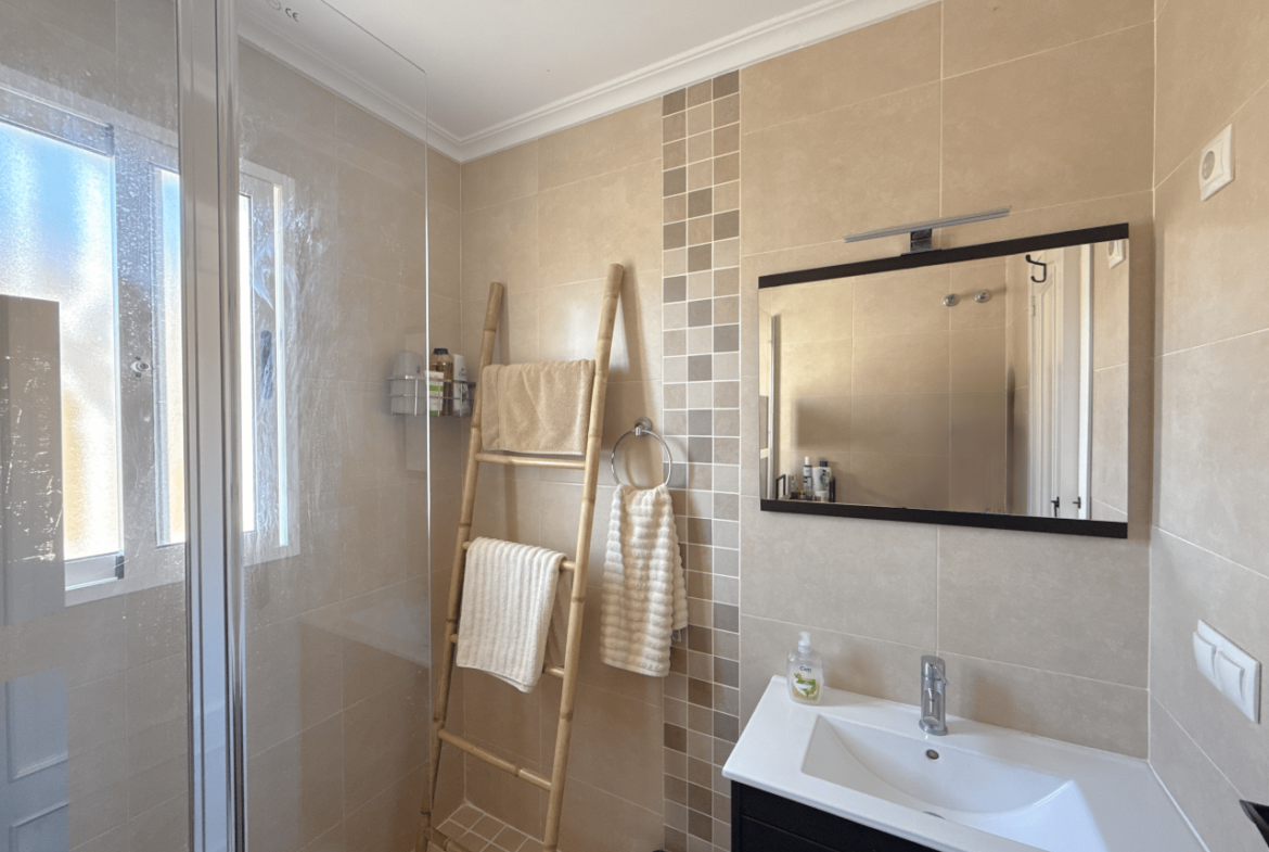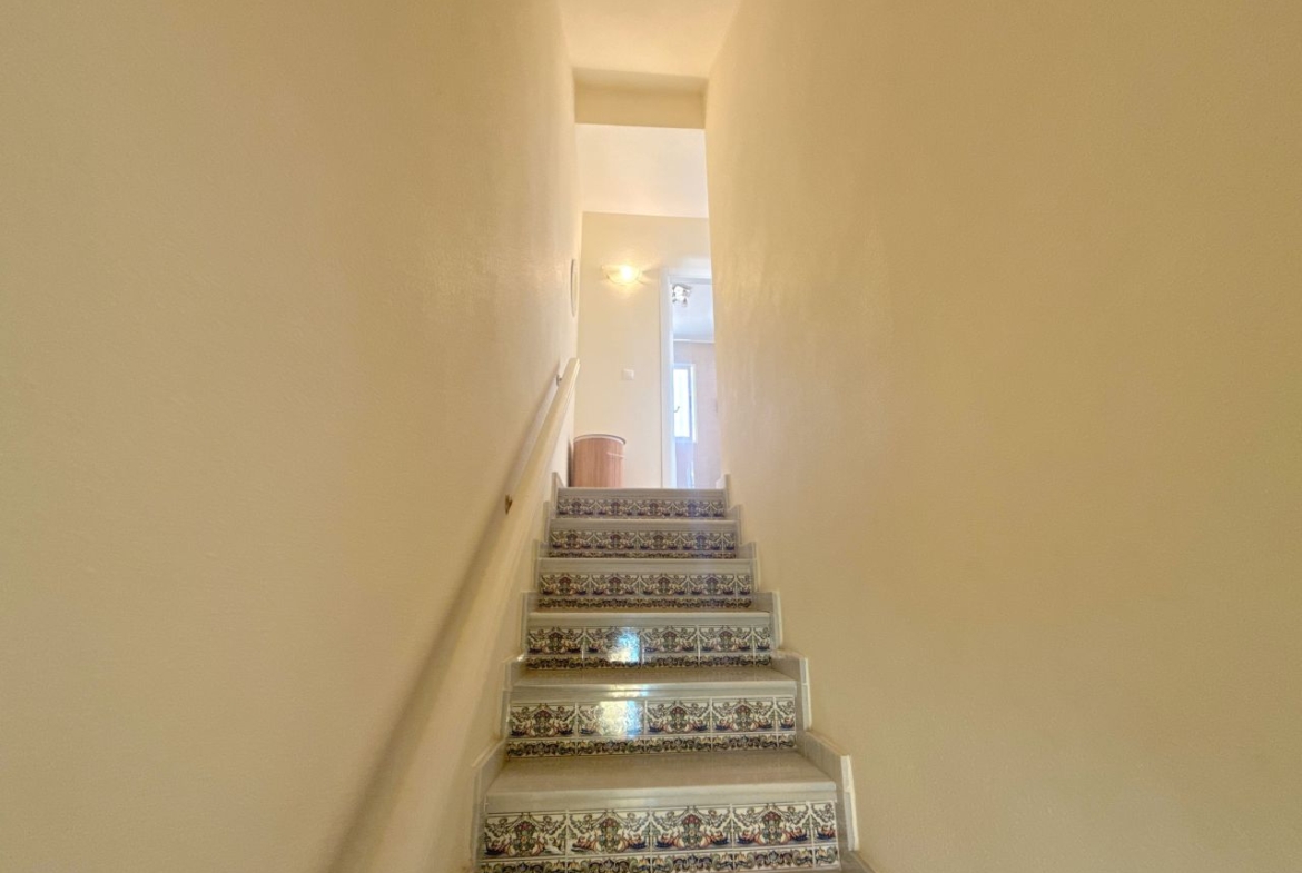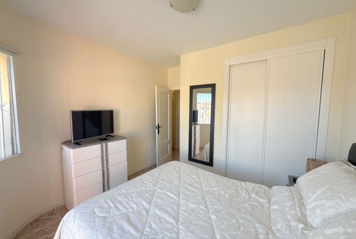 This is an amazing townhouse set in the beautiful Colinas De La Zenia complex which is a 5 minute walk to the Zenia Boulevard and about a 15 minute walk to the La Zenia blue flag award winning beach. The property has recently been renovated with a new kitchen and a 2 new bathrooms fitted, the property has had a raised wall built for more privacy on the front of the garden and has a lovely sitting area and also a terrace just before entrance to the front of the lounge, the owners have also fitted a shower room downstairs and the lounge is a nice size and has enough room for a dining table and chairs and has an American style kitchen, the lounge also has new ac unit which is hot and cold, to the rear of this property there is a small court yard with lots of storage space including a home for the washing machine and room for storing bikes and few other bits n bobs, also you have the benefit of direct access to two lovey community pools. The upper level has a recently fitted bathroom with walk in shower and 2 double bedrooms both with newly fitted ac units and the main bedroom has a really good sized balcony off it. This property is in the perfect location as all amenities are on your doorstep literally. So don’t miss out on this unique opportunity, book your viewing asap before its to late.