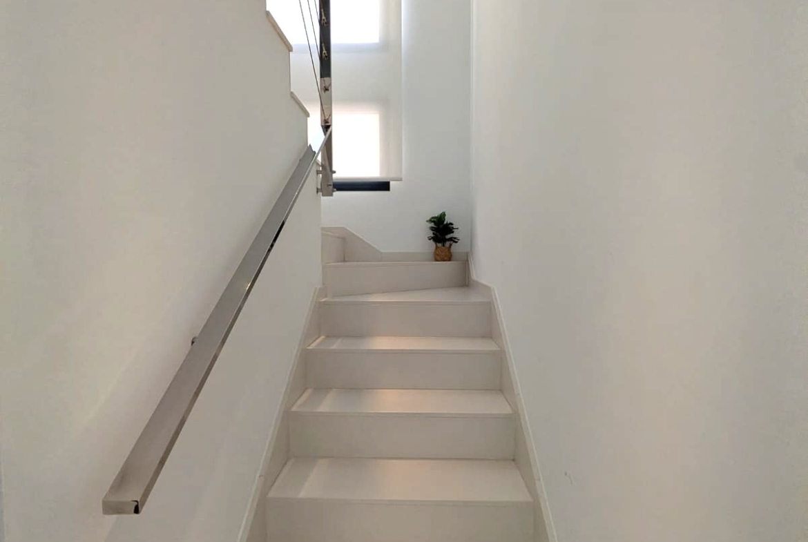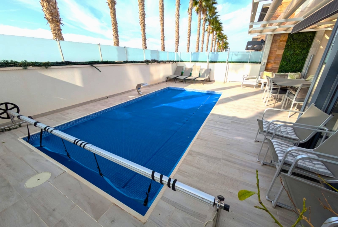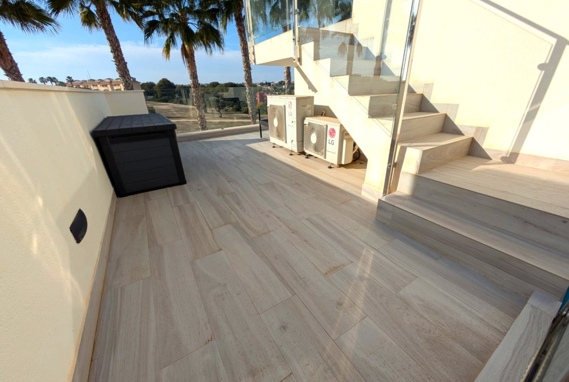 The modern open kitchen is a chef’s dream, equipped with top-of-the-line appliances and ample storage. A separate utility room adds convenience to daily chores. Step outside to enjoy the low-maintenance garden area, complete with a private pool for those hot summer days. Multiple terraces offer the perfect spots for relaxation or entertaining guests, while the large solarium provides breath taking open views.