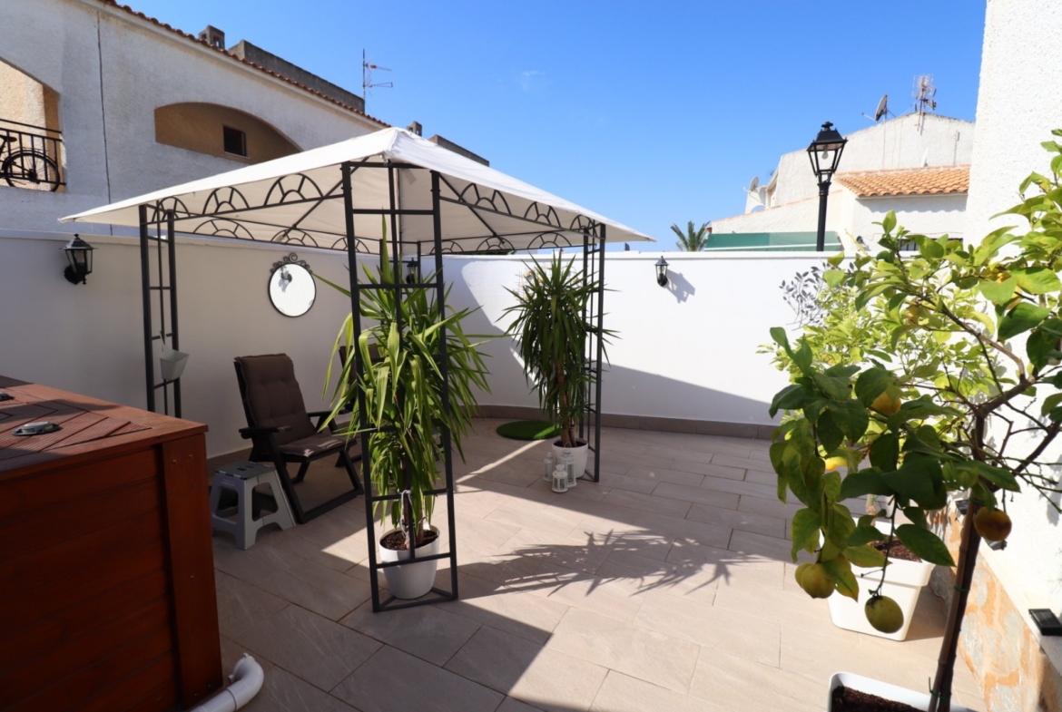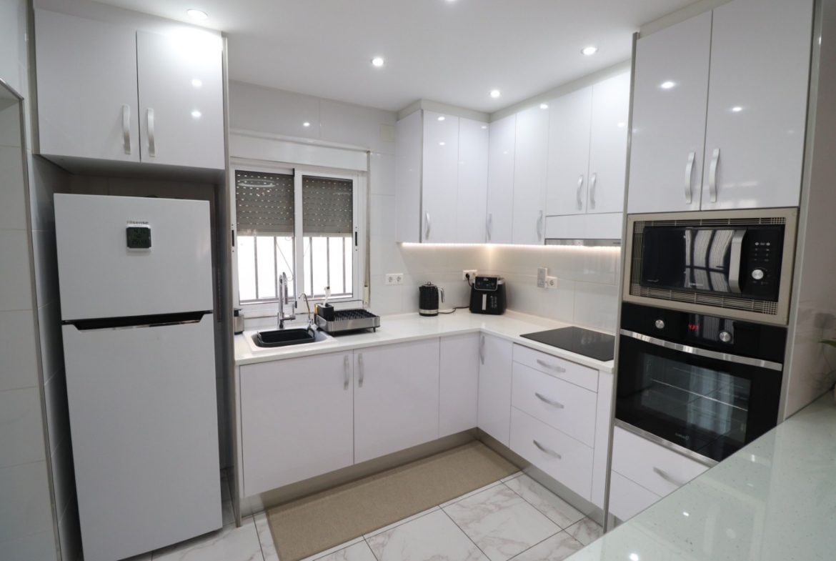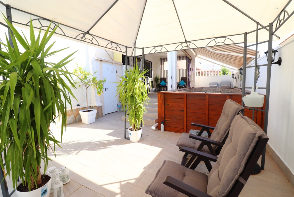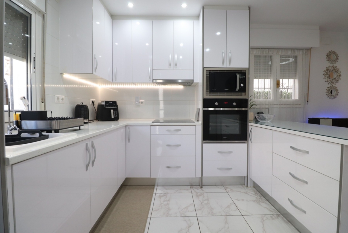 This South West Facing, Three Bedroom, Detached Villa in La Florida is located within a popular residential area, just a 2 minute walk to the nearby commercial centre with a variety of amenities. The well-known Emerald Isle entertainment venue—with bowls club, restaurant, and pool—is just a couple of minutes away, while La Zenia Boulevard, stunning beaches, and several golf courses can be reached within a 10 minute drive. Beautifully presented throughout, this single-level villa offers a 90m² build on a 210m² low-maintenance tiled plot. A covered entrance terrace leads into a bright lounge/dining room featuring a cosy pellet burner, and an open-plan fitted kitchen with breakfast bar and adjoining utility room with direct outside access. There are three double bedrooms, the master with fitted wardrobes, and two sleek modern shower rooms, one of which is en suite. The exterior space includes a private splash pool, perfect for cooling off, while residents also have access to two well-maintained communal pools. Additional features include air conditioning, making this a comfortable home year-round. An ideal full-time residence, holiday home, or rental investment opportunity on the sought-after Costa Blanca South.