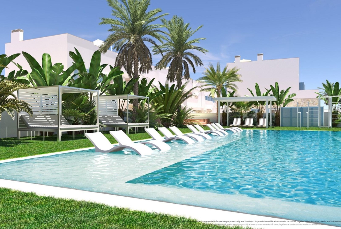 NEW BUILD RESIDENTIAL COMPLEX IN TORRE DE LA HORADADA New Build residential complex of bungalow apartments with communal pool in Torre de la Horadada located 800m from the beach. All properties has 2-3 bedrooms, 2 bathrooms, open plan kitchen with the lounge area, fitted wardrobes and terrace. All properties has private gardens and parking space. Plus bungalows on the top floor has private solarium. Torre de la Horadada is located south of Alicante in a beautiful location on the coast. The beautiful beaches of Torre de la Horadada and Mil Palmeras have fine sand beautiful promenade. There are lots of restaurants, bars and shops, also water sports, diving and snorkelling. It is well connected just 40 minutes from Alicante and Murcias Corvera airports, with large commercial shopping centres and multiple golf courses all within easy reach. 1049