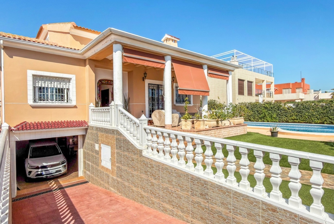 The outdoor areas truly elevate this property. A stunning private swimming pool is surrounded by a lush, landscaped garden, offering a peaceful and private retreat under the Mediterranean sun. A covered porch and pergola with a built-in barbecue create the perfect setting for unforgettable moments with family and friends.