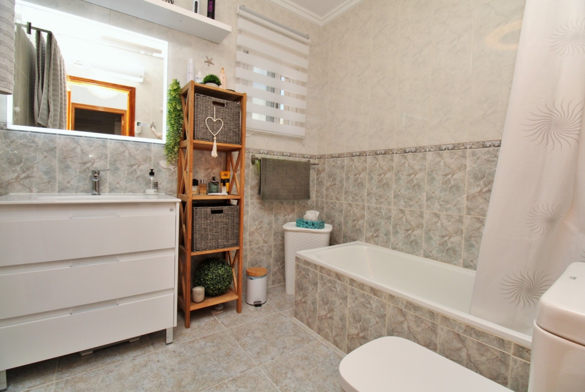 The main floor is bright and welcoming, with a comfortable lounge and dining area leading to a fully fitted kitchen, two double bedrooms, and two modern bathrooms. From the lounge you step out onto a private roof terrace complete with pergola, the ideal place to enjoy warm Mediterranean evenings. A glazed balcony, doubling as a conservatory, adds to the living space and provides a pleasant spot to relax with a book or morning coffee throughout the year.
