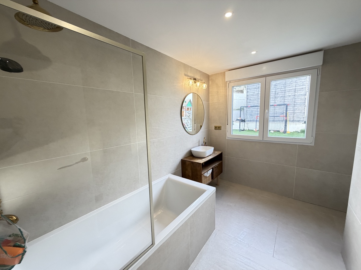A concealed door within the kitchen reveals three generously sized bedrooms that share a beautifully appointed family bathroom with a bathtub.